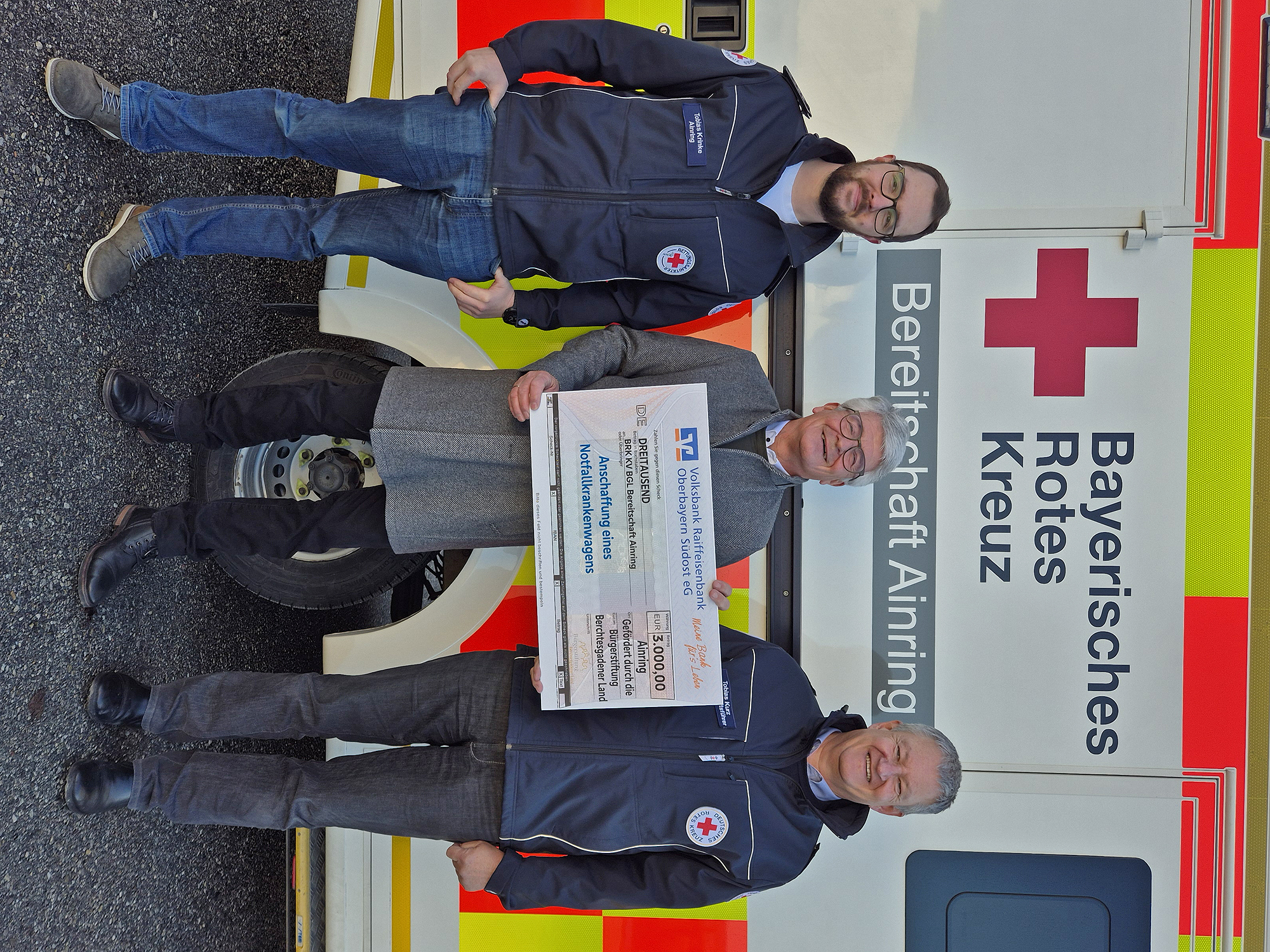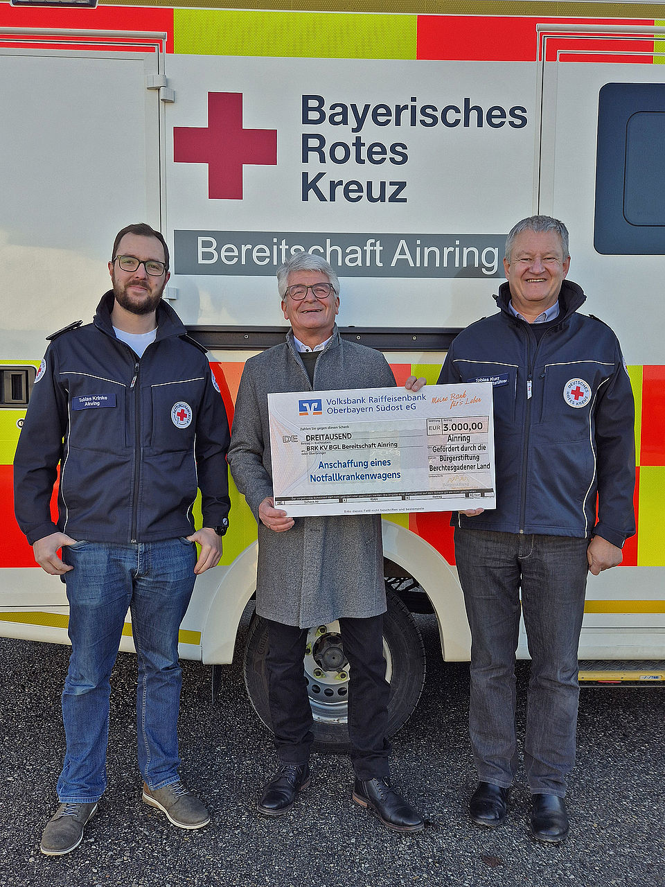 AINRING – Die Bürgerstiftung Berchtesgadener Land der Volksbank Raiffeisenbank Oberbayern Südost eG hat die ehrenamtliche BRK-Bereitschaft Ainring mit 3.000 Euro beim Kauf eines gebrauchten Notfallkrankenwagens unterstützt. Das bisherige ebenfalls gebrauchte, aber mittlerweile altersschwache Fahrzeug war seit 2019 regelmäßig im Dienst und wurde nun durch einen gut erhaltenden rund fünf Jahre alten Mercedes Sprinter mit Allradantrieb ersetzt, der zuletzt als Rettungswagen an der BRK-Rettungswache in Teisendorf im Einsatz war und wegen der Laufleistung aus der regulären Vorhaltung planmäßig ausgesondert wurde.