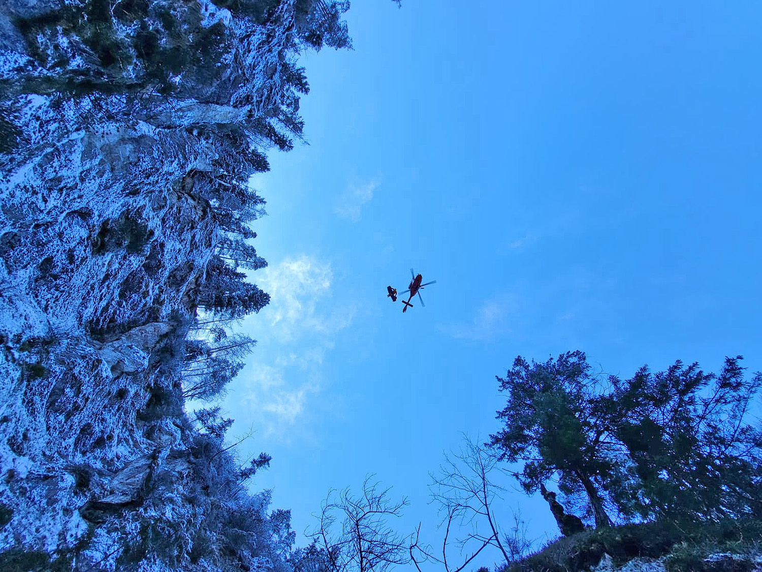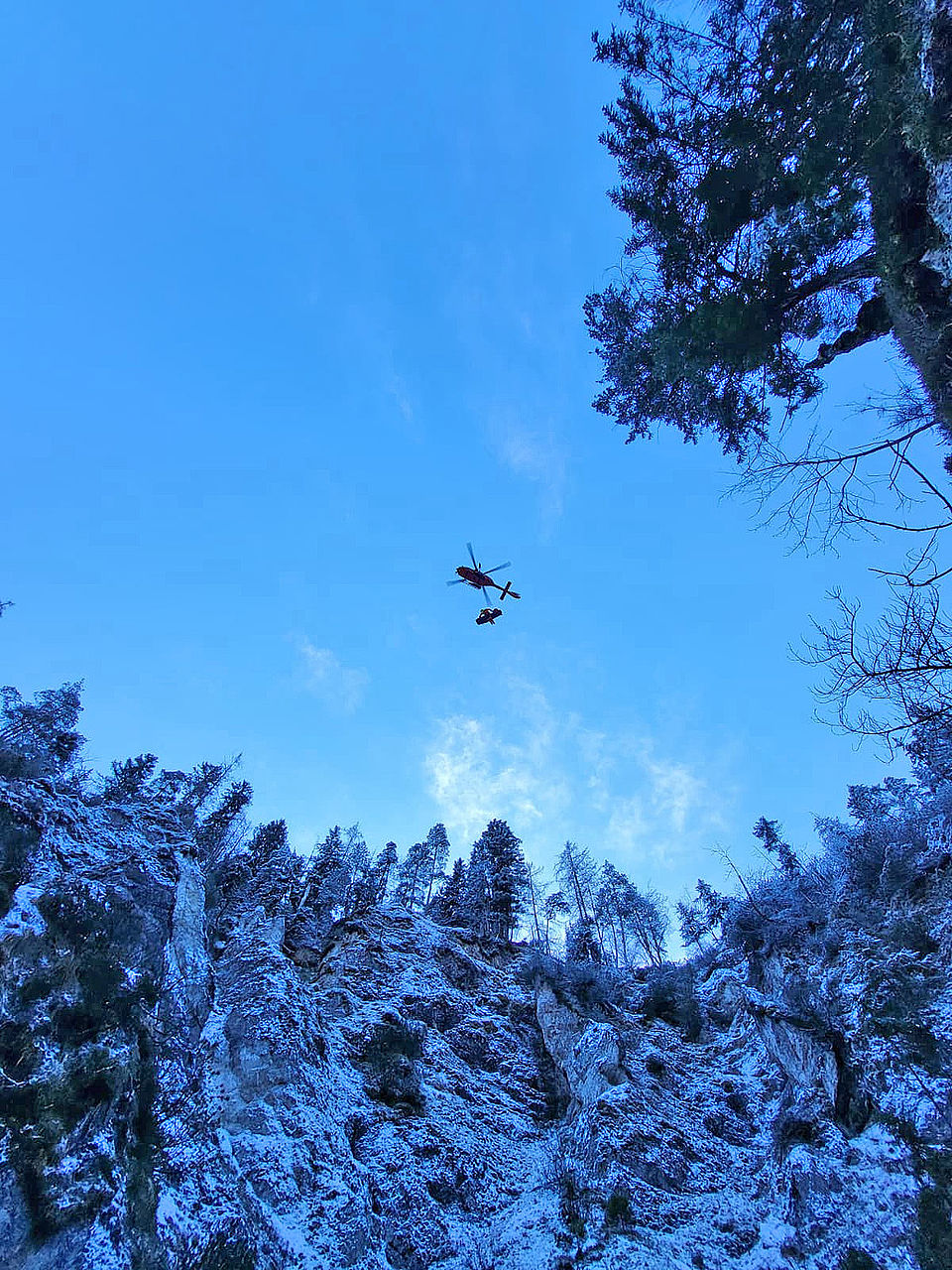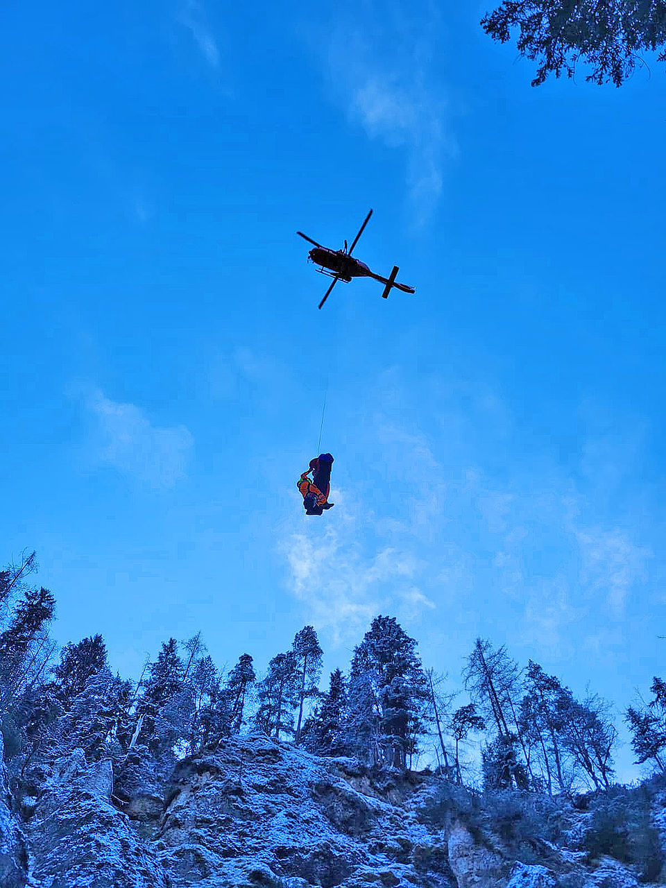 BISCHOFSWIESENER FORST – Die Reichenhaller Bergwacht und die Besatzung des Traunsteiner Rettungshubschraubers „Christoph 14“ haben am ersten Weihnachtsfeiertag eine 55-jährige Flachgauerin gerettet, die im östlichen Lattengebirge rund drei Meter abgestürzt war und sich schwer an der Hüfte verletzt hatte. Die Frau und ihr Begleiter wollten eigentlich vom Klaushäusl entlang des Weißbachs zur Steinernen Agnes aufsteigen, wo die Frau dann am in der schattigen Schlucht stellenweise vereisten Steig ausrutschte.