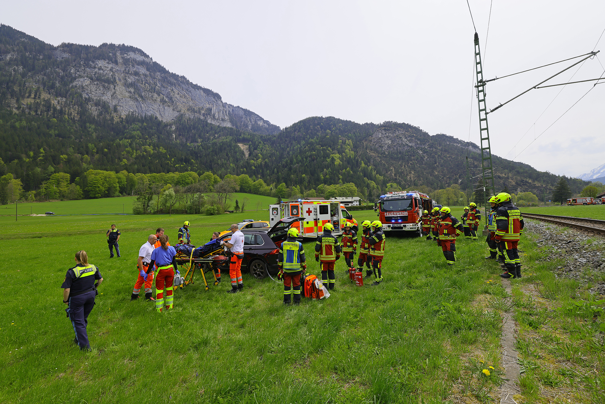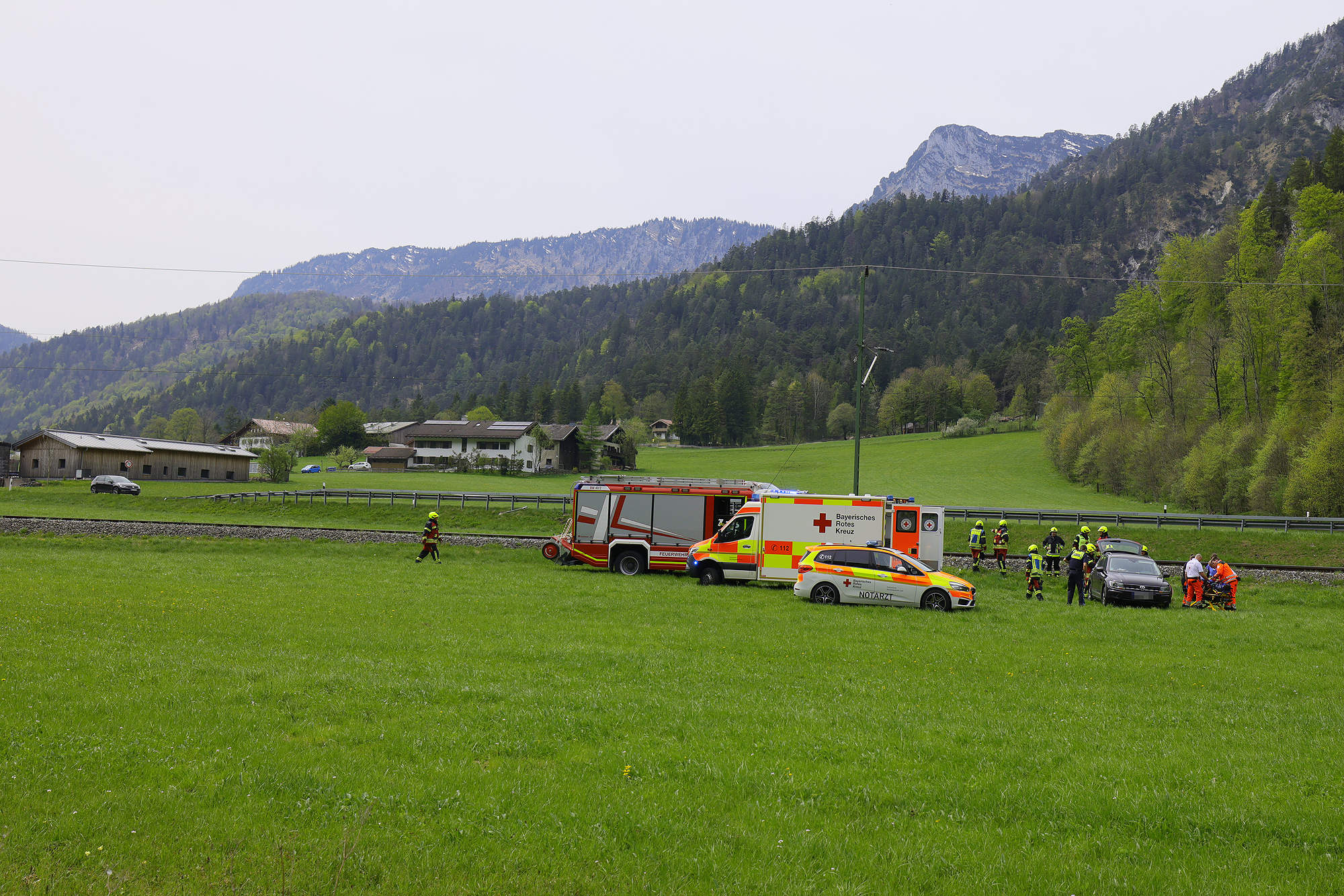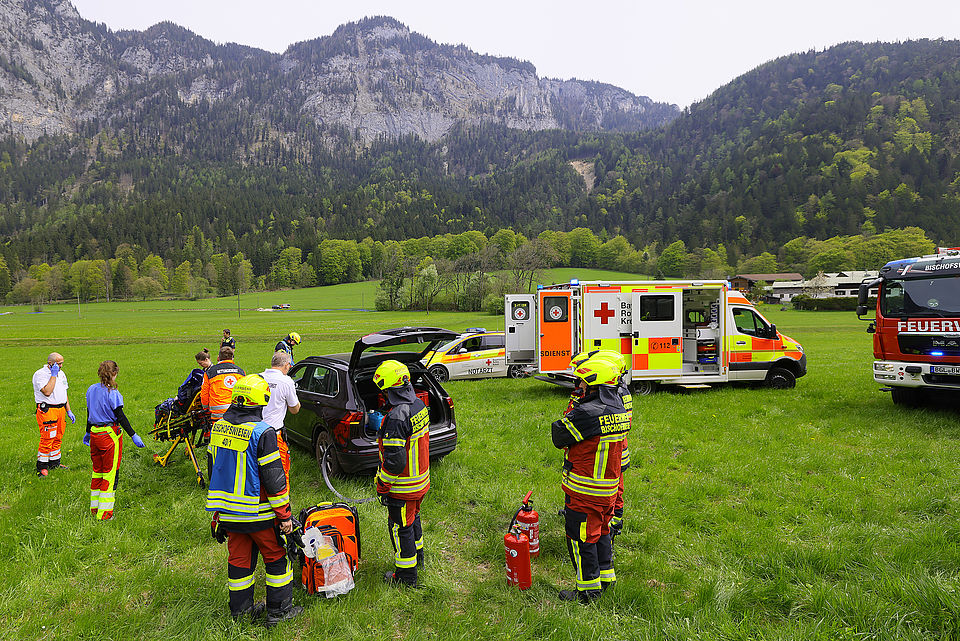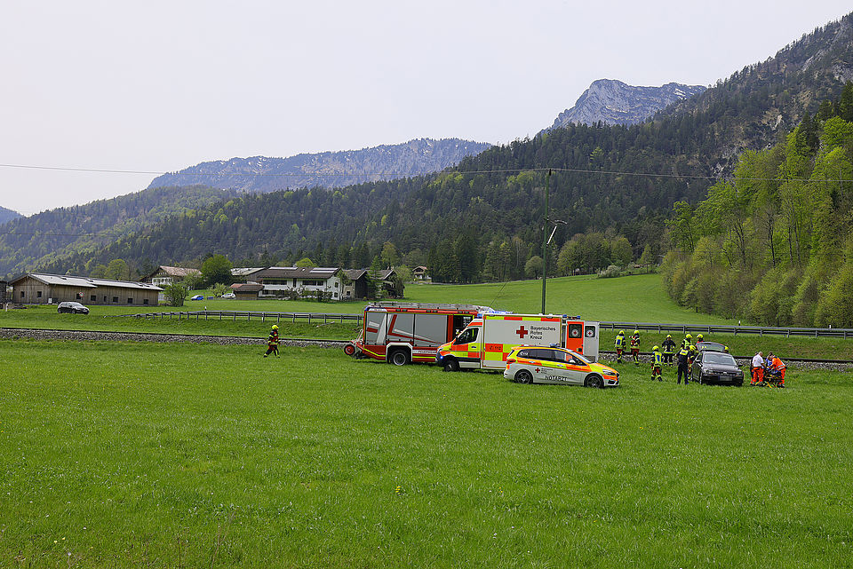 Die Leitstelle Traunstein schickte die Freiwillige Feuerwehr Bischofswiesen und das Reichenhaller Rote Kreuz mit Rettungswagen und Notärztin los; die Einsatzkräfte versorgten die Frau und brachten sie dann in die Kreisklinik Bad Reichenhall. Die Feuerwehr übernahm die Erstversorgung, sicherte die Unfallstelle ab, stellte den Brandschutz sicher, schob vorsichtshalber wegen eventuell auslaufender Betriebsstoffe eine Mulde unter das Unfallfahrzeug und half dem Abschleppdienst bei der Bergung. Die B20 und die Bahnstrecke mussten kurz gesperrt werden, konnten aber rasch wieder freigegeben werden. Beamte der Berchtesgadener Polizei nahmen den Unfall auf. Aufgrund des Vorfalls kam es kurzzeitig zu Behinderungen im Bahnverkehr. Auch die Fahrbahn in Richtung Bad Reichenhall war zeitweise gesperrt, wurde jedoch rasch wieder freigegeben.