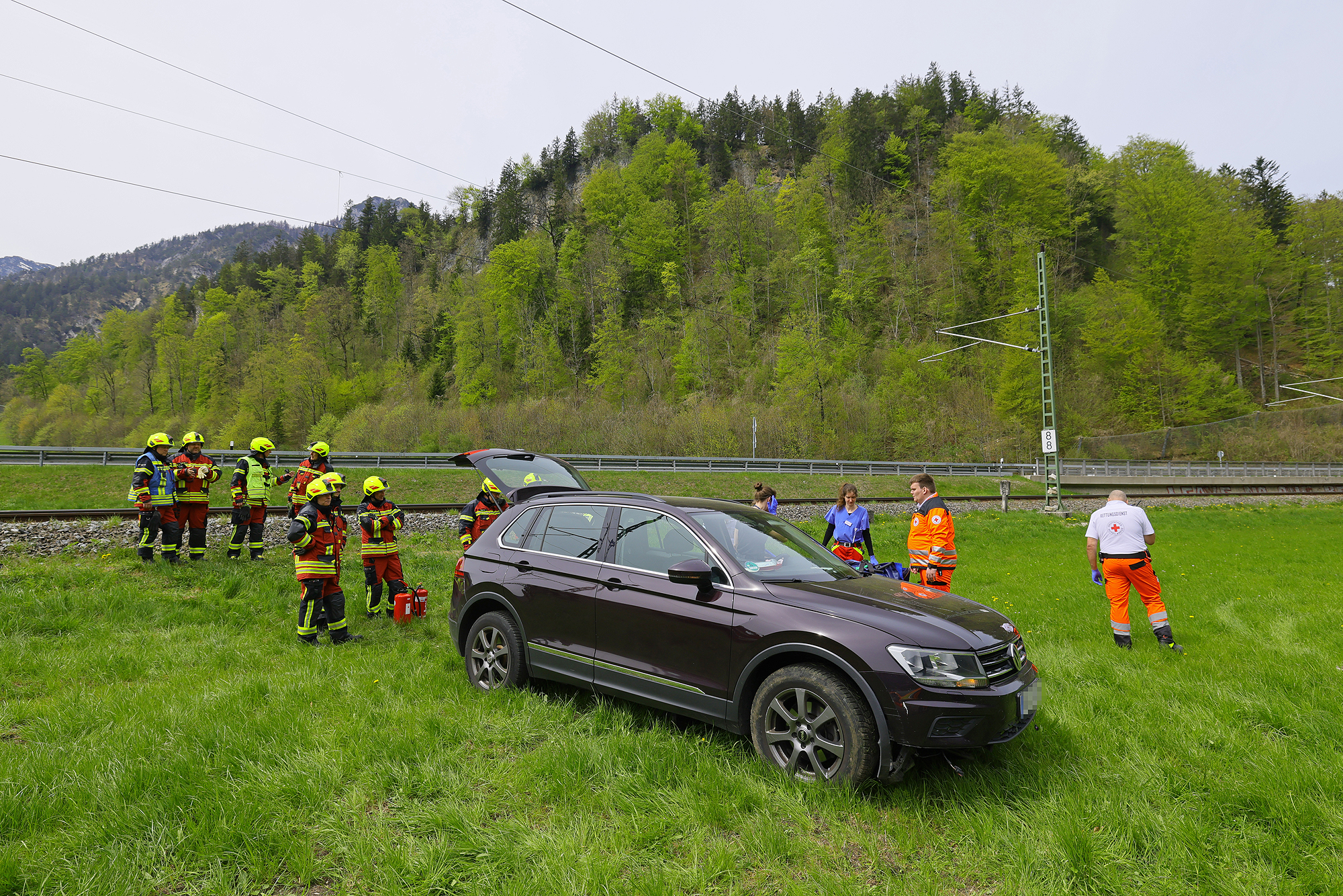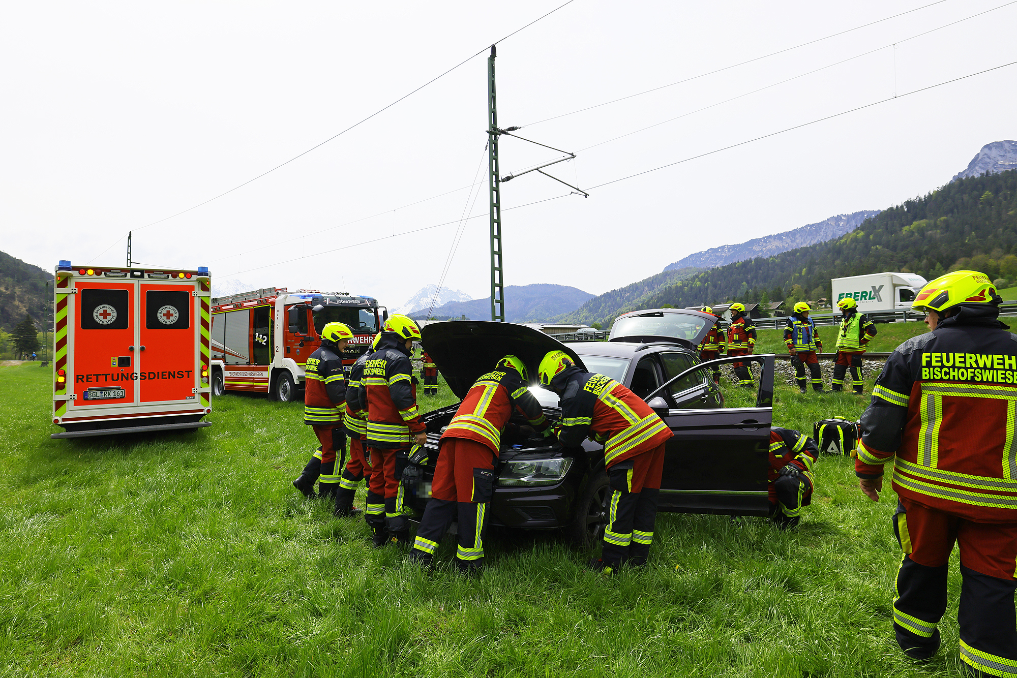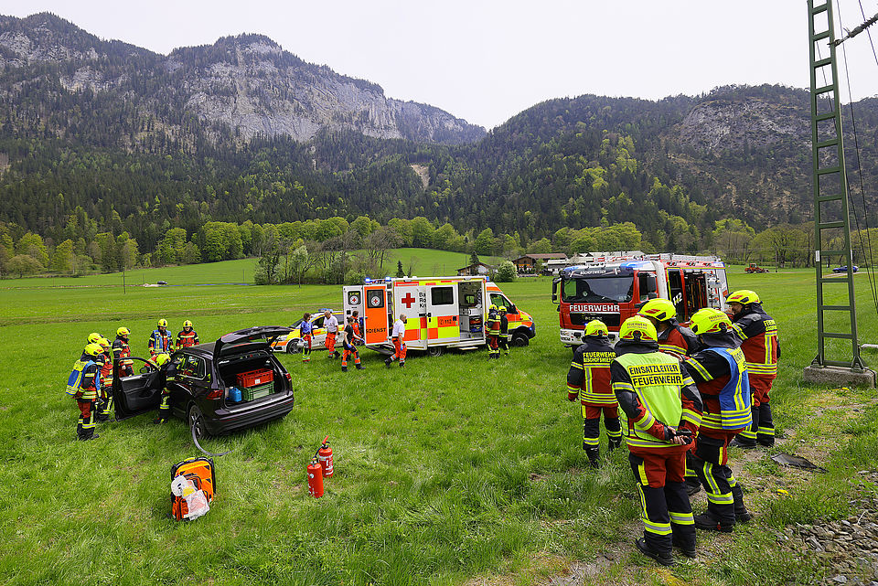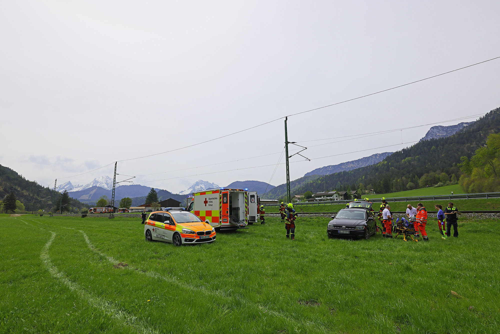 Die Leitstelle Traunstein schickte die Freiwillige Feuerwehr Bischofswiesen und das Reichenhaller Rote Kreuz mit Rettungswagen und Notärztin los; die Einsatzkräfte versorgten die Frau und brachten sie dann in die Kreisklinik Bad Reichenhall. Die Feuerwehr übernahm die Erstversorgung, sicherte die Unfallstelle ab, stellte den Brandschutz sicher, schob vorsichtshalber wegen eventuell auslaufender Betriebsstoffe eine Mulde unter das Unfallfahrzeug und half dem Abschleppdienst bei der Bergung. Die B20 und die Bahnstrecke mussten kurz gesperrt werden, konnten aber rasch wieder freigegeben werden. Beamte der Berchtesgadener Polizei nahmen den Unfall auf. Aufgrund des Vorfalls kam es kurzzeitig zu Behinderungen im Bahnverkehr. Auch die Fahrbahn in Richtung Bad Reichenhall war zeitweise gesperrt, wurde jedoch rasch wieder freigegeben.