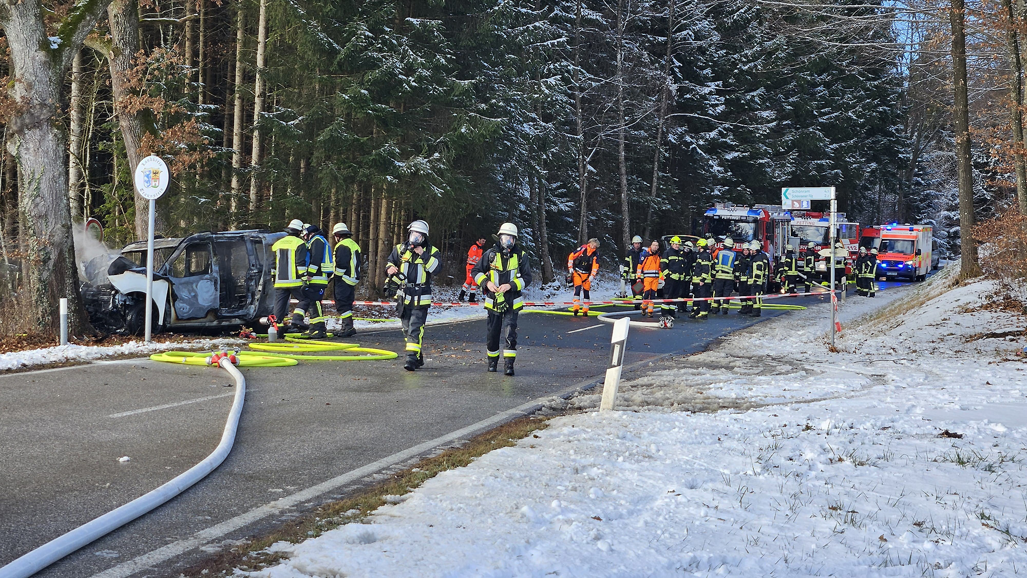 LAUFEN/LEOBENDORF – Am Samstagmittag mussten Feuerwehr, Rotes Kreuz und Polizei auf die Kreisstraße TS32 ausrücken, wo in Richtung Leobendorf genau am Übergang in die BGL15 an der Landkreisgrenze kurz vor Geisbach ein 85-Jähriger aus dem Berchtesgadener Land mit seinem Auto aus bisher ungeklärter Ursache nach rechts von der Straße abgekommen und frontal gegen einen Baum geprallt war. Obwohl Ersthelfer den Mann gleich befreit und Wiederbelebungsversuche begonnen hatten, starb er noch am Unfallort; sein Auto fing kurz nach der Rettung Feuer und stand dann in Vollbrand.
