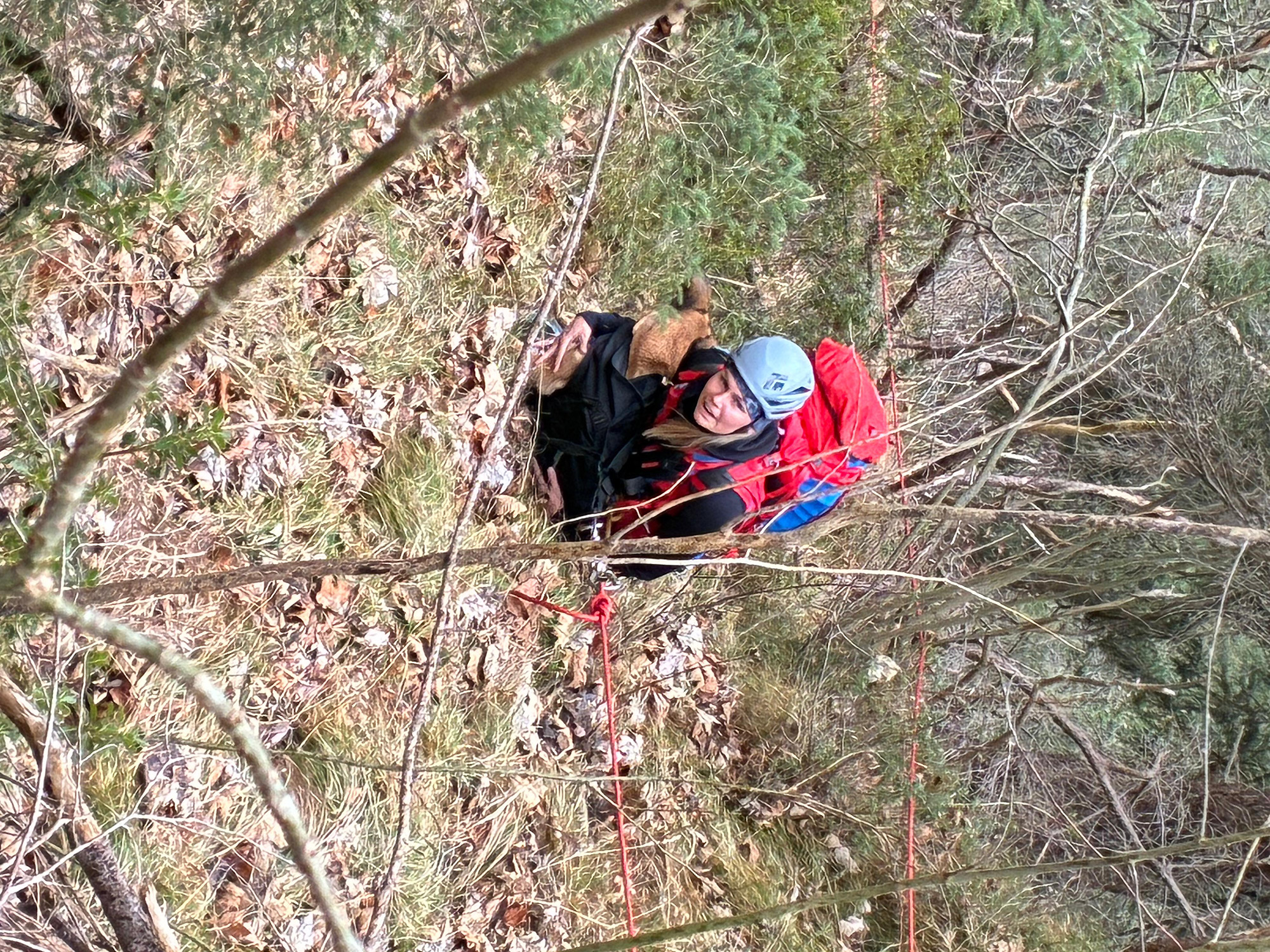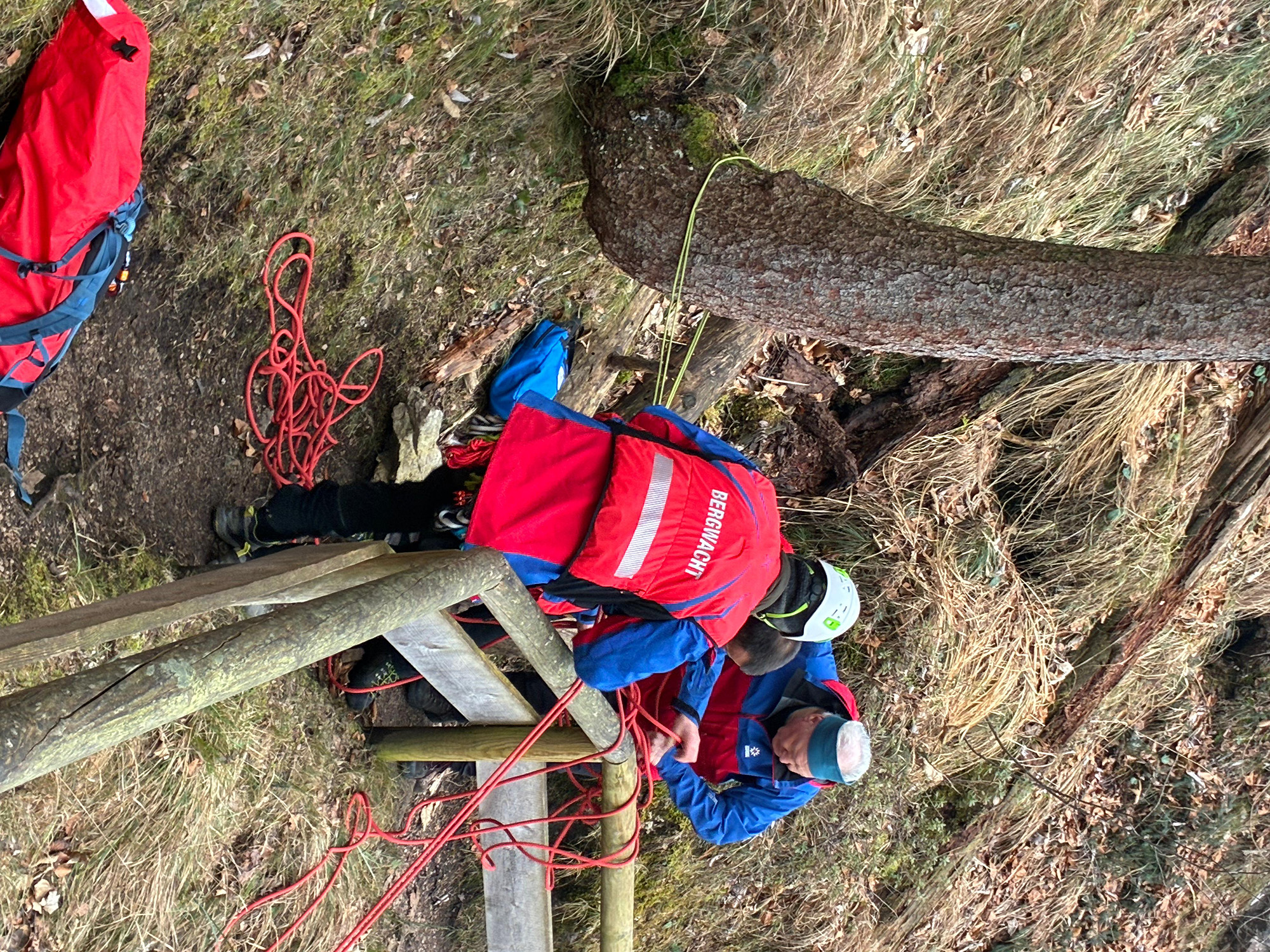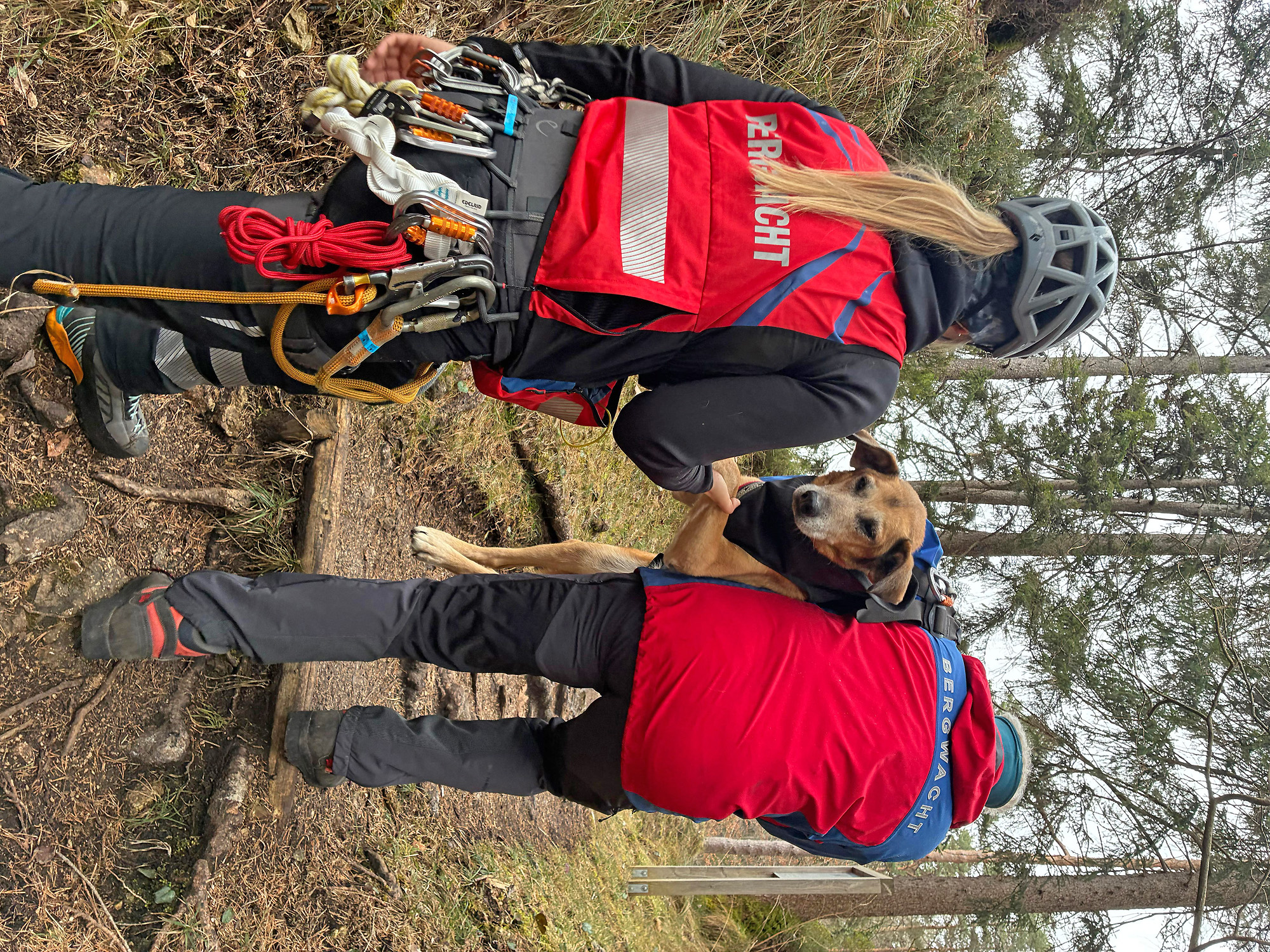 BAD REICHENHALL/KARLSTEIN – Sechs Einsatzkräfte der Reichenhaller Bergwacht haben am frühen Samstagnachmittag einen vom Zwergerlweg auf der Nordseite der Bürgermeisterhöhe (Müllnerberg, Chiemgauer Alpen) abgestürzten Mischlingshund aus Franken gerettet. Der bereits 16 Jahre alte Vierbeiner war zusammen mit Frauchen und Herrchen vom Schroffen zum Kugelbachweg unterwegs, als er an einer ausgesetzten Stelle den Halt verlor und unterhalb des Geländers durch den Steilhang abstürzte, aber Glück im Unglück hatte, da er oberhalb einer Felsstufe wieder Halt fand und stehenblieb. Der Besitzer stieg sofort ab, um dem Tier zu helfen, während die Frau gegen 12.50 Uhr die Bergwacht anrief. Die Retter ließen eine Hundeführerin und einen weiteren Bergretter rund 30 Meter tief am Seil ab, die den Vierbeiner und das Herrchen sicherten, so dass sie am Seil zurück auf den Weg hochgezogen werden konnten. Die Bergwacht brachte den augenscheinlich unverletzten Hund anschließend vorsorglich noch zur Tierärztin. Der Einsatz dauerte gute zwei Stunden.
