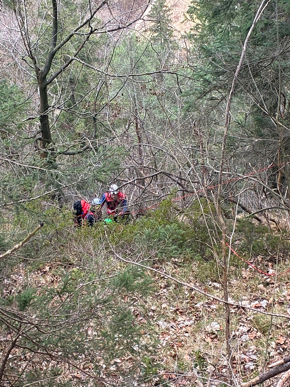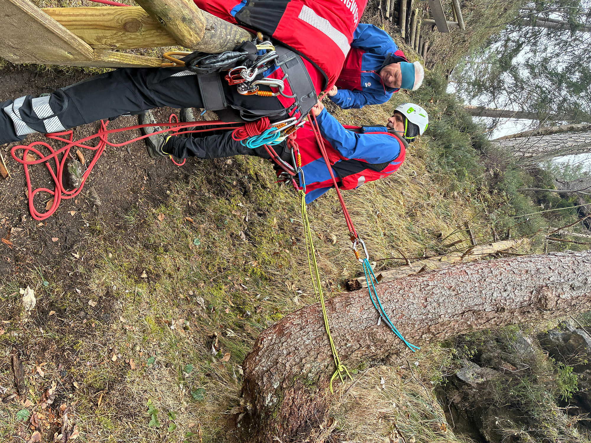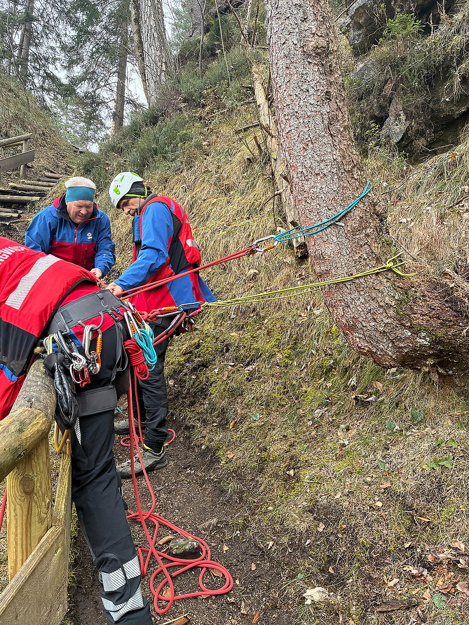 BAD REICHENHALL/KARLSTEIN – Sechs Einsatzkräfte der Reichenhaller Bergwacht haben am frühen Samstagnachmittag einen vom Zwergerlweg auf der Nordseite der Bürgermeisterhöhe (Müllnerberg, Chiemgauer Alpen) abgestürzten Mischlingshund aus Franken gerettet. Der bereits 16 Jahre alte Vierbeiner war zusammen mit Frauchen und Herrchen vom Schroffen zum Kugelbachweg unterwegs, als er an einer ausgesetzten Stelle den Halt verlor und unterhalb des Geländers durch den Steilhang abstürzte, aber Glück im Unglück hatte, da er oberhalb einer Felsstufe wieder Halt fand und stehenblieb. Der Besitzer stieg sofort ab, um dem Tier zu helfen, während die Frau gegen 12.50 Uhr die Bergwacht anrief. Die Retter ließen eine Hundeführerin und einen weiteren Bergretter rund 30 Meter tief am Seil ab, die den Vierbeiner und das Herrchen sicherten, so dass sie am Seil zurück auf den Weg hochgezogen werden konnten. Die Bergwacht brachte den augenscheinlich unverletzten Hund anschließend vorsorglich noch zur Tierärztin. Der Einsatz dauerte gute zwei Stunden.