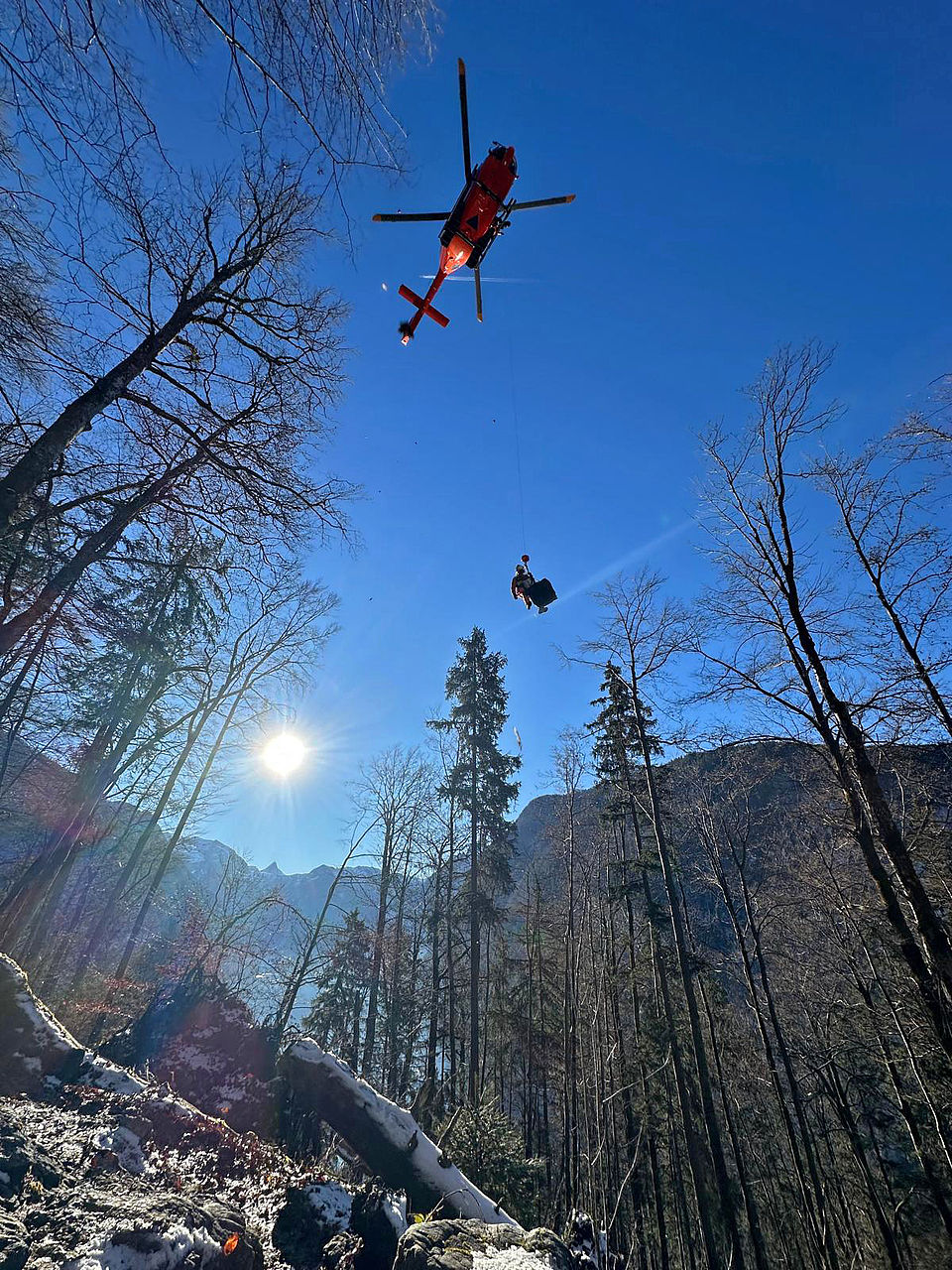 Arbeitsintensiv verlief der Dreikönigstag: Gegen 13.50 Uhr ging zunächst ein Notruf vom Carl-von-Linde-Weg ein. Dort war eine 75-jährige Wanderin aus der Oberpfalz gestürzt und mit starken Rückenschmerzen liegengeblieben. Die Bergretter versorgten die Frau gemeinsam mit dem Wirt des Windbeutelbarons als Ersthelfer und einer Rettungswagen-Besatzung des Berchtesgadener Roten Kreuzes, die sie dann auch in die Kreisklinik Bad Reichenhall einlieferte. Nur kurze Zeit später folgte der nächste Alarm; in der Nähe des Jenner-Spinnergrabens hatte sich ein Schlittenunfall ereignet: Eine 23-Jährige war vom Weg abgekommen und durch den Bergwald gestürzt, wobei sie sich nach erster Einschätzung schwerer an der Schulter verletzt hatte. Die Bergwacht versorgte sie gemeinsam mit der Notärztin des Salzburger Notarzthubschraubers „Christophorus 6“, zog sie seilgesichert im Luftrettungssack zurück auf den Weg, wo der Heli zum Einladen landen konnte. Für die beiden zeitgleichen Einsätze am Feiertag waren insgesamt sieben Bergretter im Einsatz.