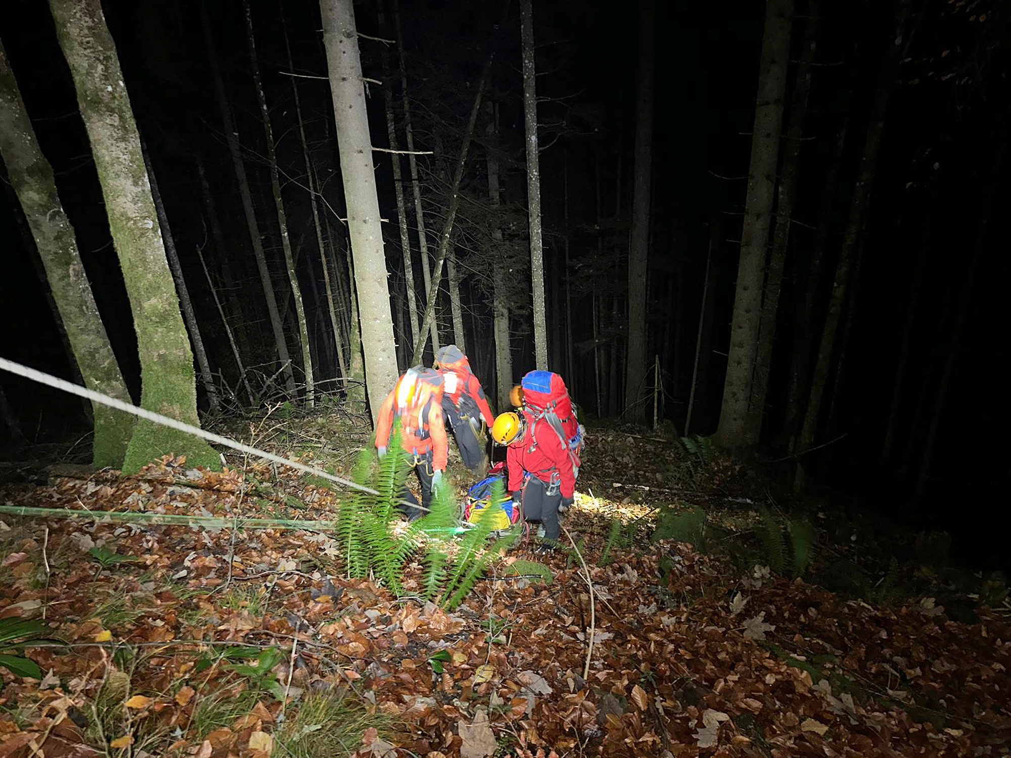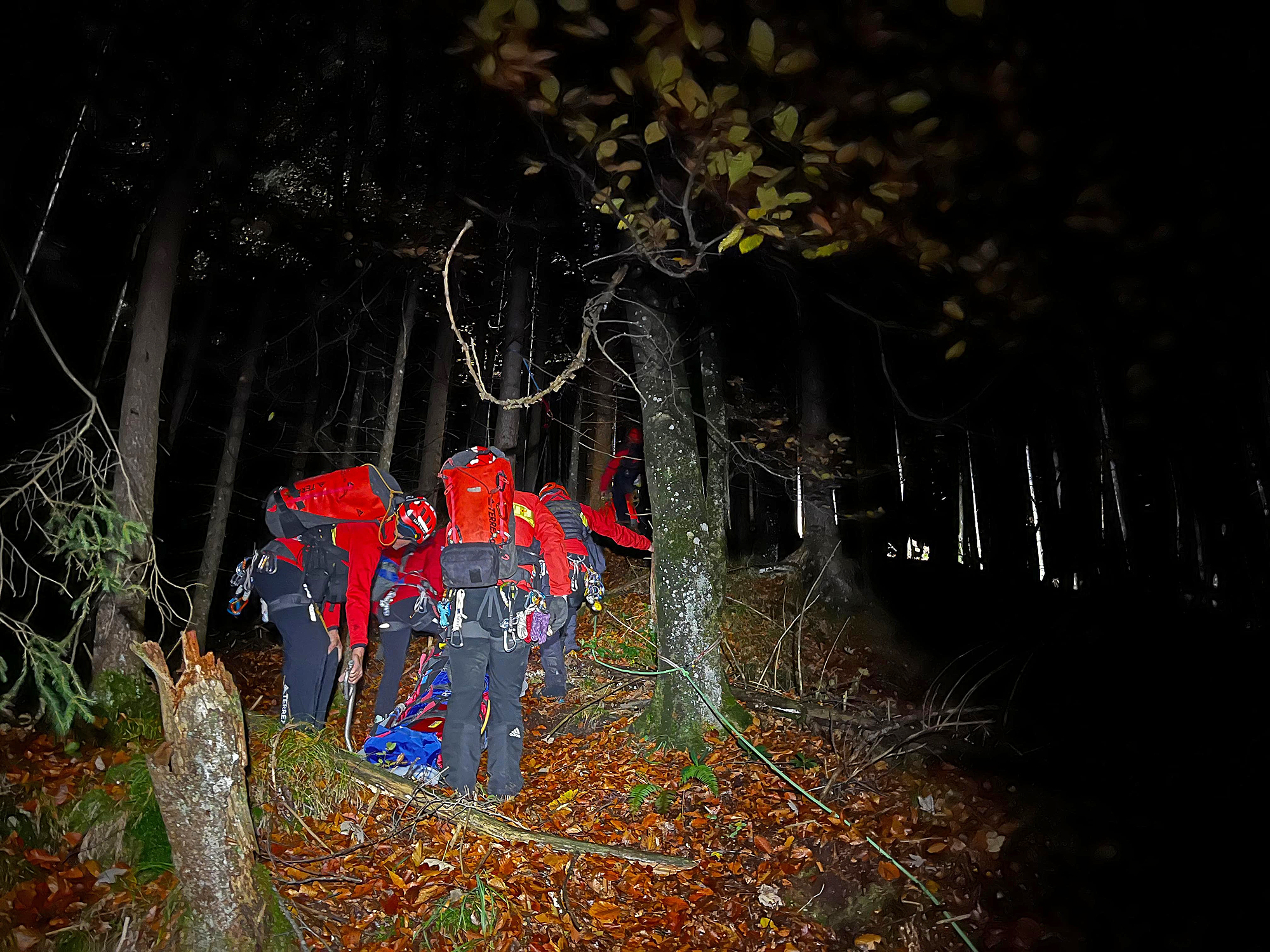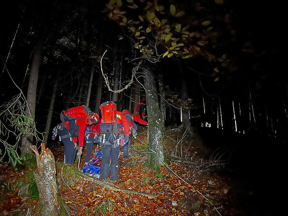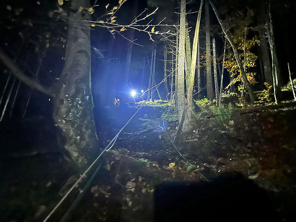 Am späten Sonntagnachmittag (26. Oktober) meldeten sich gegen 17.20 Uhr eine 50-jährige Frau und ein 55-jähriger Mann aus Wien über den Notruf, da sie zwischen dem Dürrlehen in der Gern und der Almbachklamm den Weg verfehlt hatten und der Mann in der einsetzenden Dunkelheit rund 30 Meter durch eine steile Rinne abgerutscht war. Sechs Bergretter fuhren über den Forstweg per Fahrzeug an, machten sich zu Fuß auf die Suche und stiegen weglos zu den von der Leitstelle ermittelten Koordinaten ab, wo sie schnell Ruf- und dann auch Sichtkontakt herstellen konnten. Sie brachten die Frau seilgesichert zum Auto hoch, seilten sich weiter zum Mann ab und versorgten ihn, konnten aber bis auf Abschürfungen keine ernsten Verletzungen feststellen. Die nachgeforderte Mannschaft baute mit vier weiteren Einsatzkräften eine Seilwinde auf und zog den 55-Jährigen zunächst gehend durch die Rinne nach oben; da der Mann dann zunehmend über Schmerzen klagte, lagerte ihn die Bergwacht für den weiteren Aufzug in die Gebirgstrage um und übergab ihn an die Rettungswagen-Besatzung aus Surheim, die gerade wieder in Salzburg frei geworden war und weiter in die Gern fuhr; der ursprünglich alarmierte Rettungswagen des Berchtesgadener Roten Kreuzes musste zu einem schweren Verkehrsunfall auf der Schnitzhofallee ausrücken (wir berichteten). Zehn Bergretter waren bis 22.15 Uhr unterwegs.