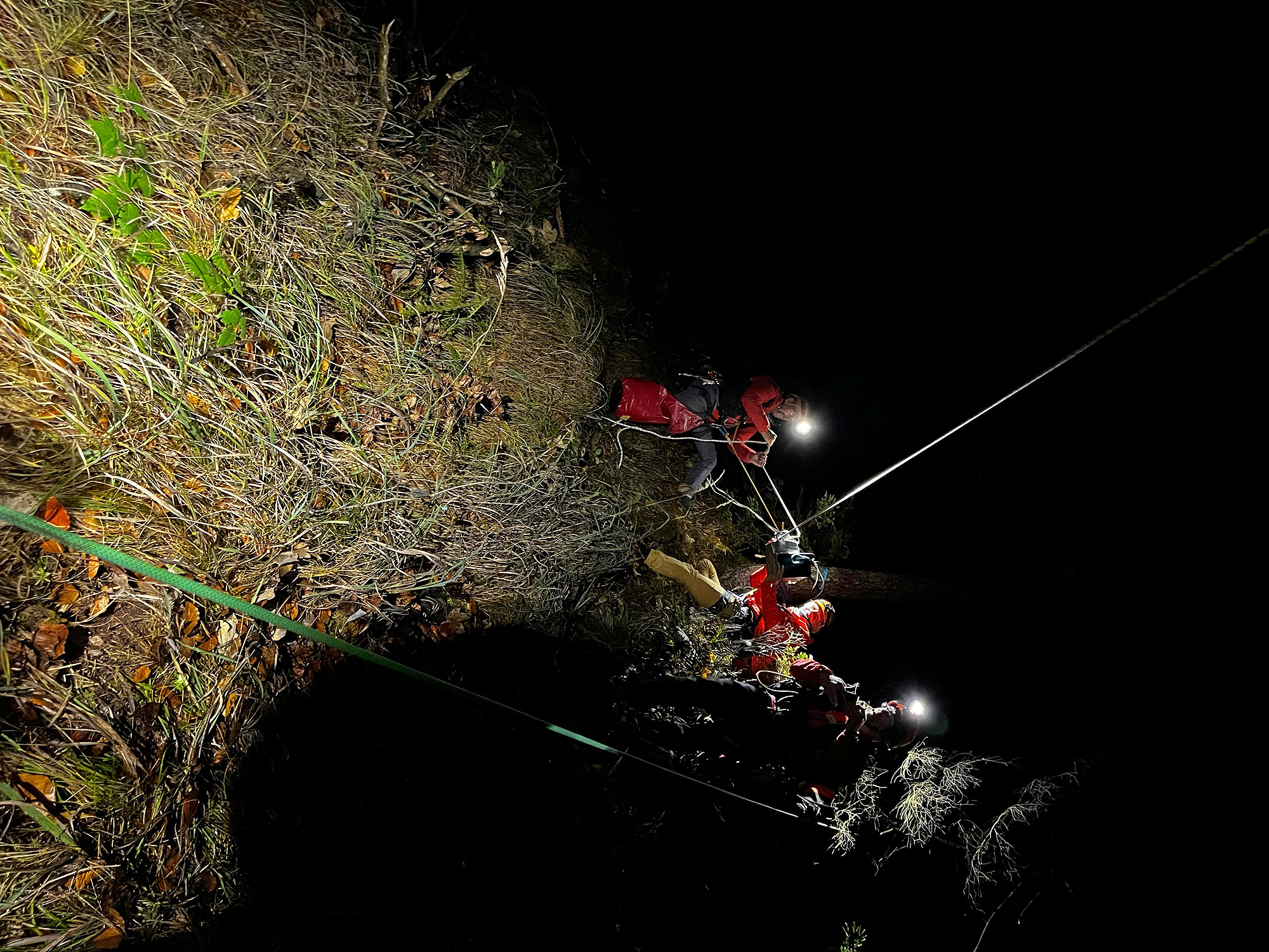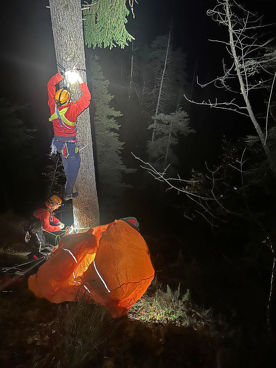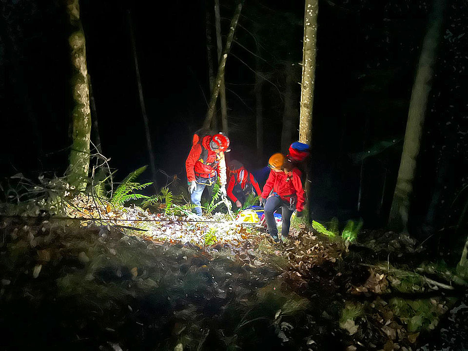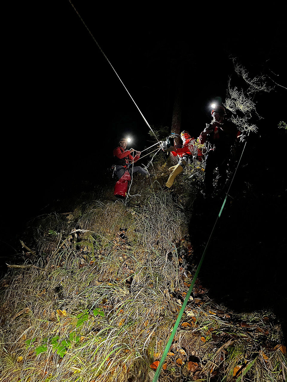 Am späten Sonntagnachmittag (26. Oktober) meldeten sich gegen 17.20 Uhr eine 50-jährige Frau und ein 55-jähriger Mann aus Wien über den Notruf, da sie zwischen dem Dürrlehen in der Gern und der Almbachklamm den Weg verfehlt hatten und der Mann in der einsetzenden Dunkelheit rund 30 Meter durch eine steile Rinne abgerutscht war. Sechs Bergretter fuhren über den Forstweg per Fahrzeug an, machten sich zu Fuß auf die Suche und stiegen weglos zu den von der Leitstelle ermittelten Koordinaten ab, wo sie schnell Ruf- und dann auch Sichtkontakt herstellen konnten. Sie brachten die Frau seilgesichert zum Auto hoch, seilten sich weiter zum Mann ab und versorgten ihn, konnten aber bis auf Abschürfungen keine ernsten Verletzungen feststellen. Die nachgeforderte Mannschaft baute mit vier weiteren Einsatzkräften eine Seilwinde auf und zog den 55-Jährigen zunächst gehend durch die Rinne nach oben; da der Mann dann zunehmend über Schmerzen klagte, lagerte ihn die Bergwacht für den weiteren Aufzug in die Gebirgstrage um und übergab ihn an die Rettungswagen-Besatzung aus Surheim, die gerade wieder in Salzburg frei geworden war und weiter in die Gern fuhr; der ursprünglich alarmierte Rettungswagen des Berchtesgadener Roten Kreuzes musste zu einem schweren Verkehrsunfall auf der Schnitzhofallee ausrücken (wir berichteten). Zehn Bergretter waren bis 22.15 Uhr unterwegs.