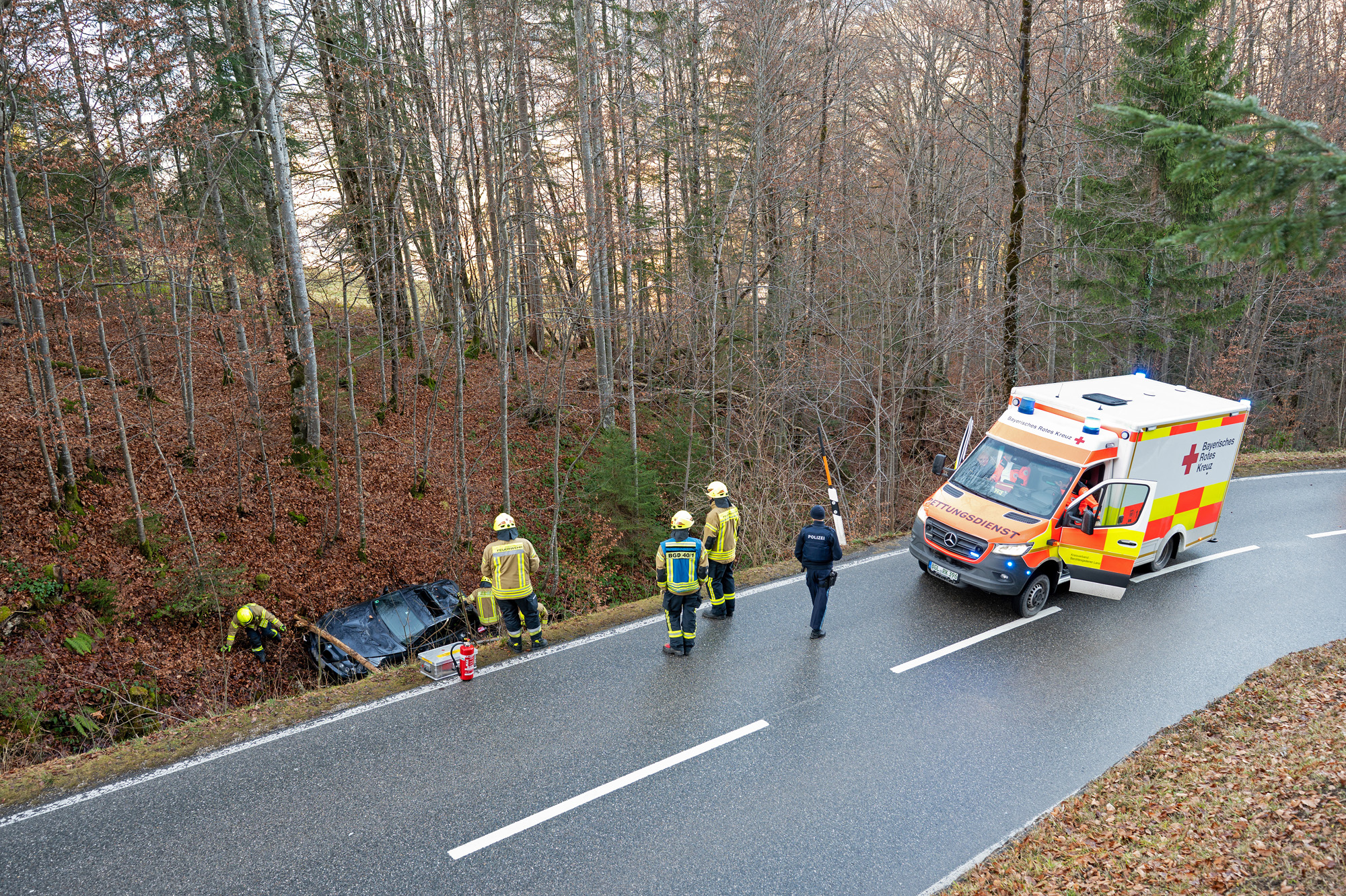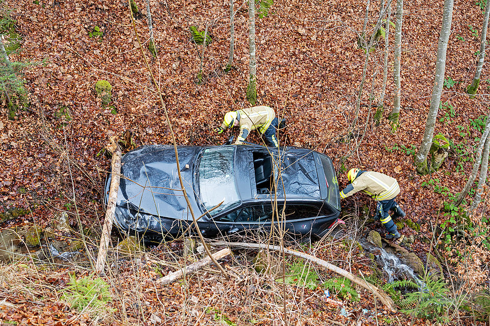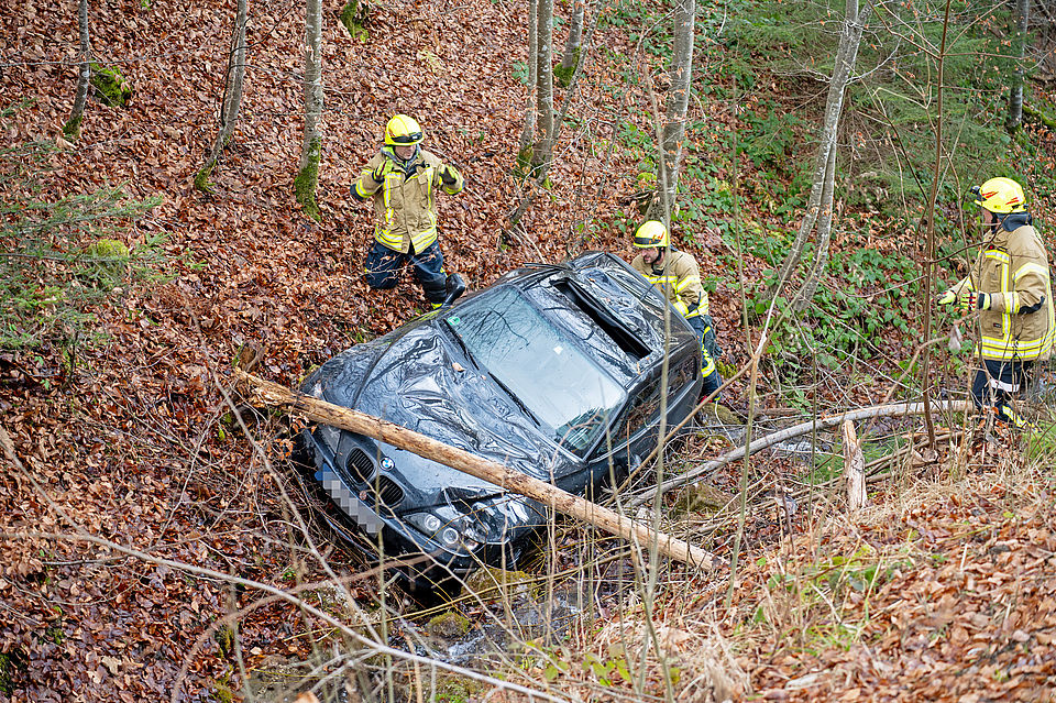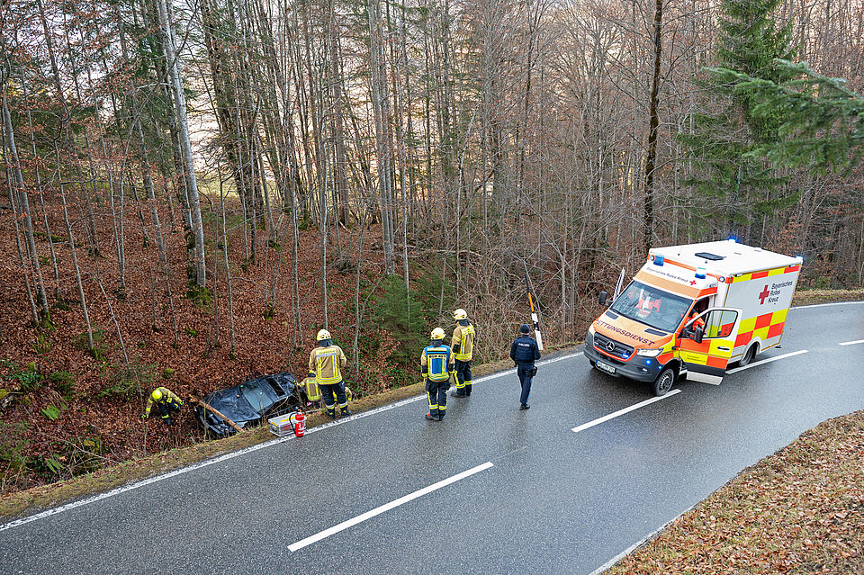 BERCHTESGADEN – Einsatzkräfte von Feuerwehr, Rotem Kreuz und Polizei mussten am Donnerstagnachmittag gegen 13:20 Uhr auf die Salzbergstraße ausrücken. Ein 18-jähriger Münchner war mit seinem BMW bergwärts unterwegs, als er kurz unterhalb der Dokumentation Obersalzberg in einer Linkskurve aus bislang ungeklärter Ursache von der Fahrbahn abkam, über die Böschung abstürzte und in einem kleinen Bachbett zum Stehen kam. Dabei wurde er in seinem Fahrzeug eingeschlossen und konnte sich nicht selbständig befreien.