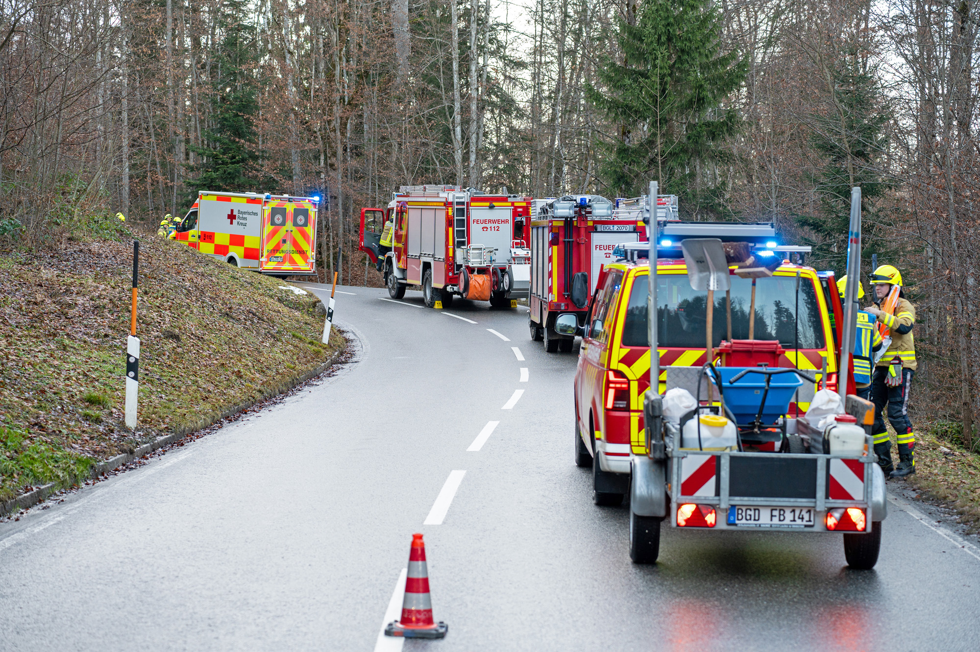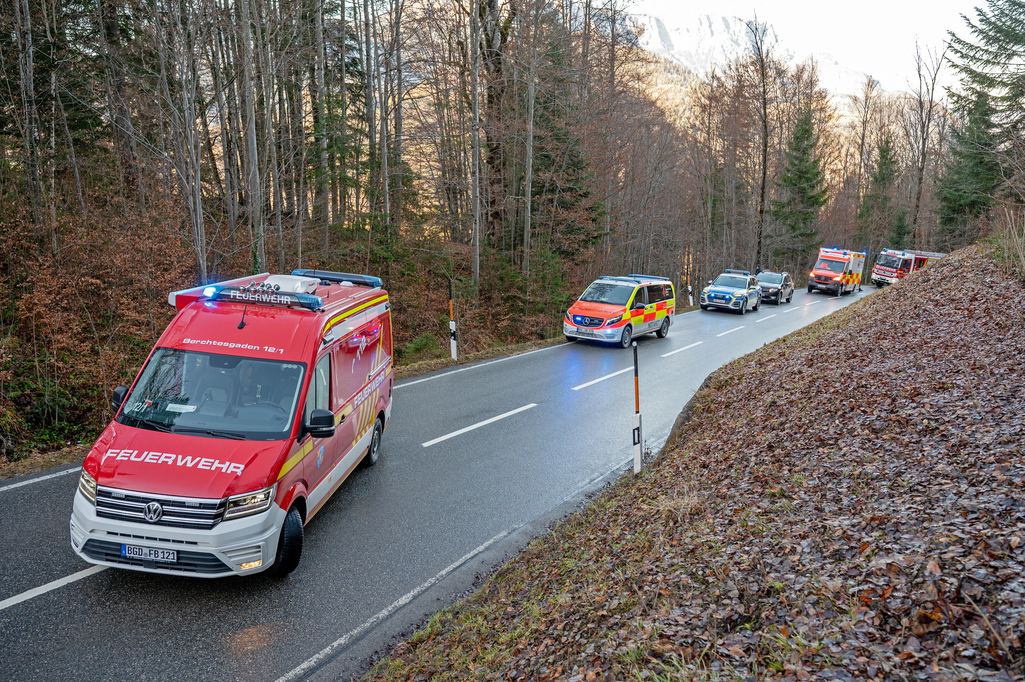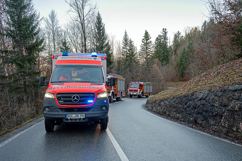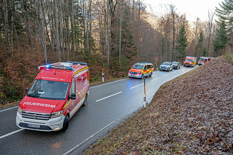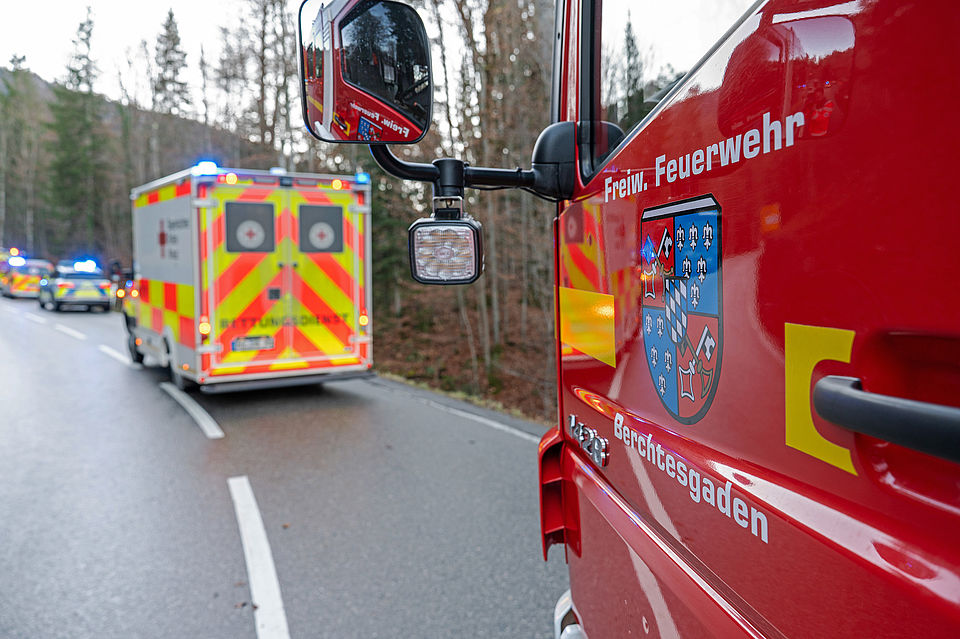 Vorbildliche Ersthelfer eilten dem Verunfallten sofort zu Hilfe, setzten bei der Leitstelle Traunstein einen Notruf ab und konnten den jungen Mann noch vor dem Eintreffen der ersten Einsatzkräfte aus dem Fahrzeug befreien. Die Leitstelle Traunstein schickte währenddessen die Freiwilligen Feuerwehren Berchtesgaden und Königssee, das Berchtesgadener Rote Kreuz mit dem Notarzt und einem Rettungswagen sowie den Einsatzleiter Rettungsdienst zum Unfallort.