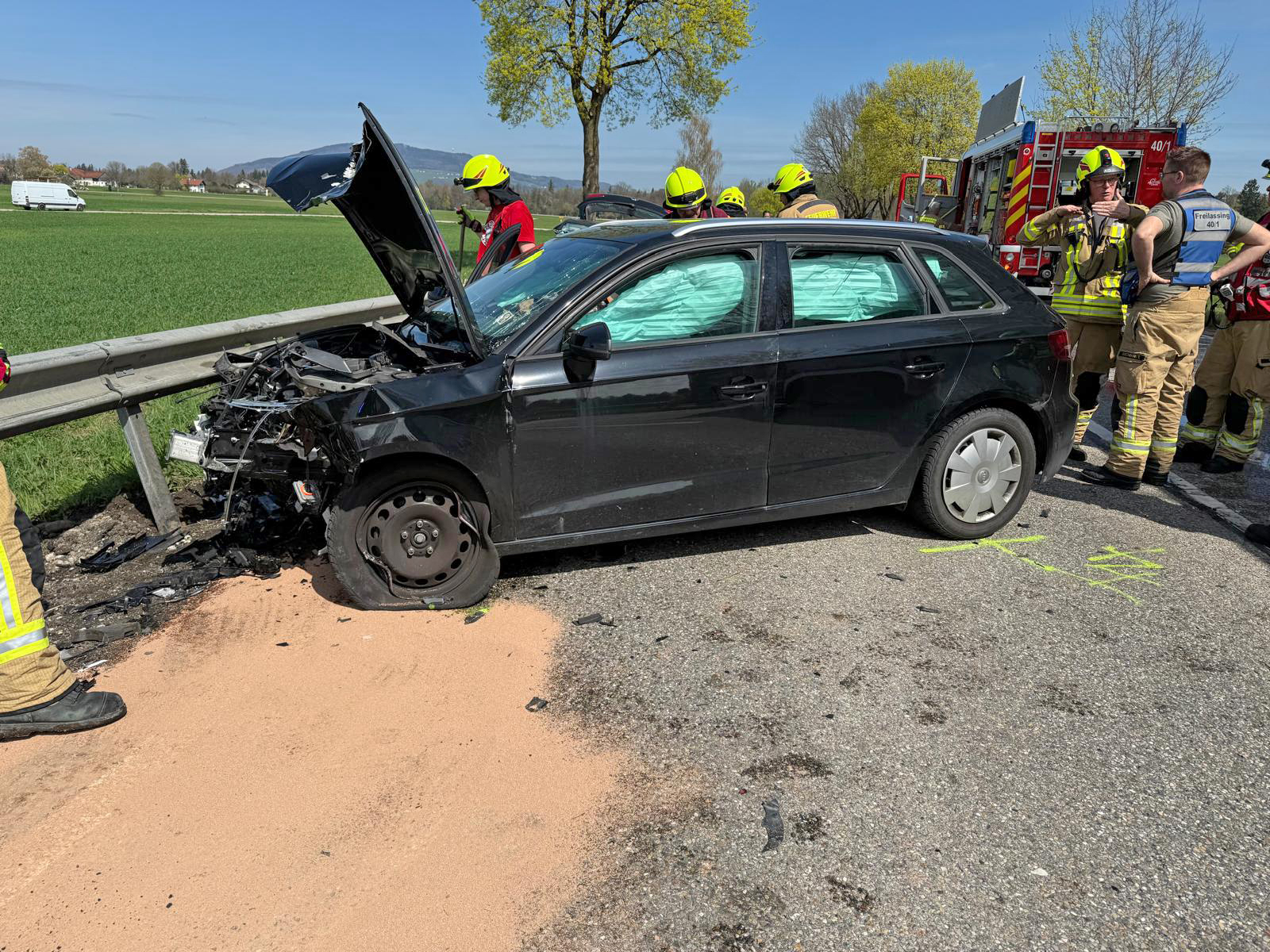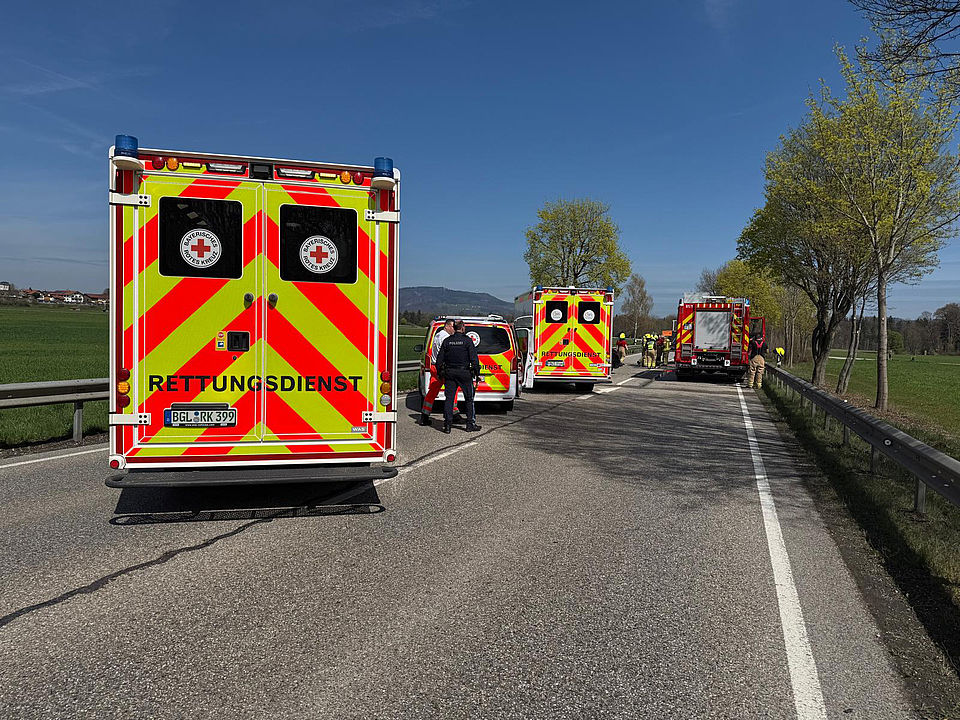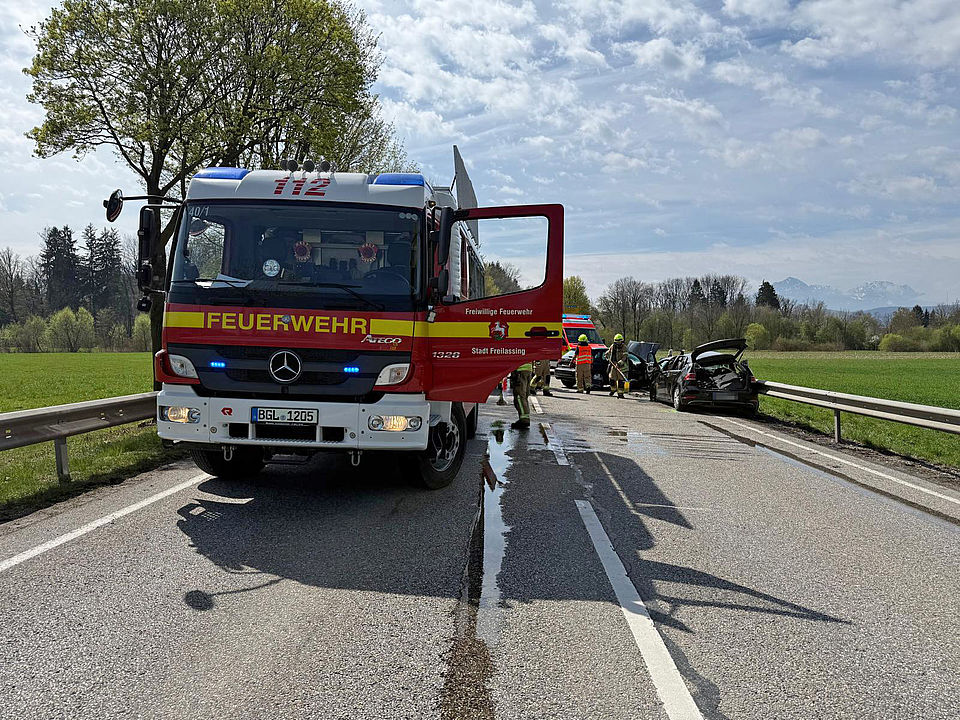 Die Leitstelle Traunstein schickte die Freiwillige Feuerwehr Freilassing, den Rettungswagen des IMS Rettungsdienst aus Surheim und das Rote Kreuz mit zwei Rettungswagen aus Freilassing und Ruhpolding, dem Freilassinger Notarzt, dem Traunsteiner Rettungshubschrauber „Christoph 14“ und dem Einsatzleiter Rettungsdienst zum Unfallort. Die Feuerwehr war mit 30 Einsatzkräften und sechs Fahrzeugen vor Ort; sie betreuten die Verletzten und halfen dem Rettungsdienst, trennten zur schonenden Rettung das Dach des VW mit dem hydraulischen Rettungssatz ab, stellten den Brandschutz sicher, banden auslaufende Betriebsstoffe, sperrten die Straße und richteten eine Umleitung ein. Die drei schwer Verletzten kamen mit dem Heli und zwei Rettungswagen in umliegende Kliniken. Beamte der Freilassinger Polizei nahmen den Unfall auf, ermitteln aktuell die genaue Ursache und schätzen den Totalschaden an beiden Autos auf rund 30.000 Euro.