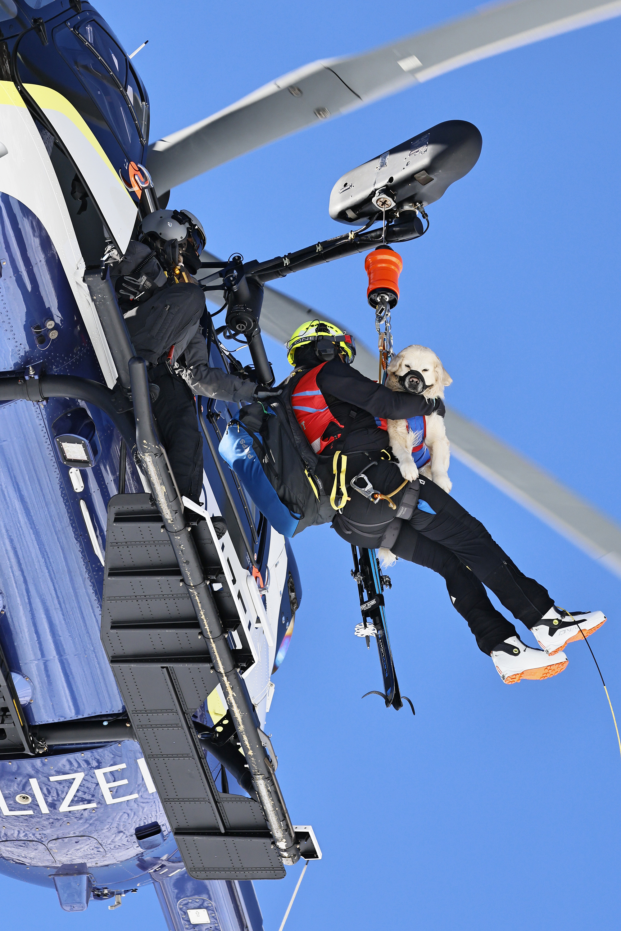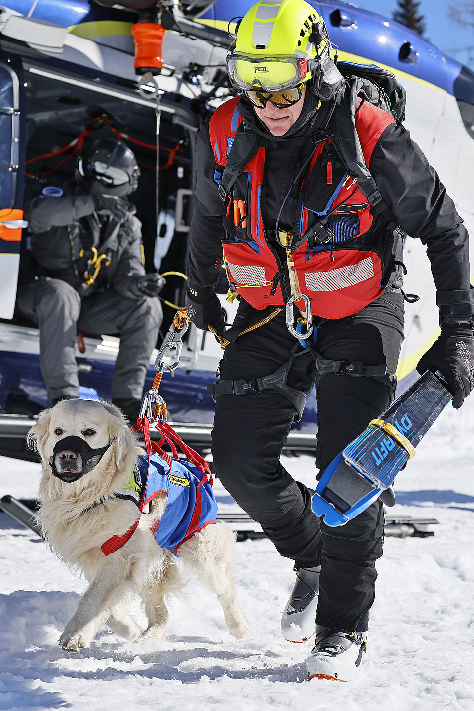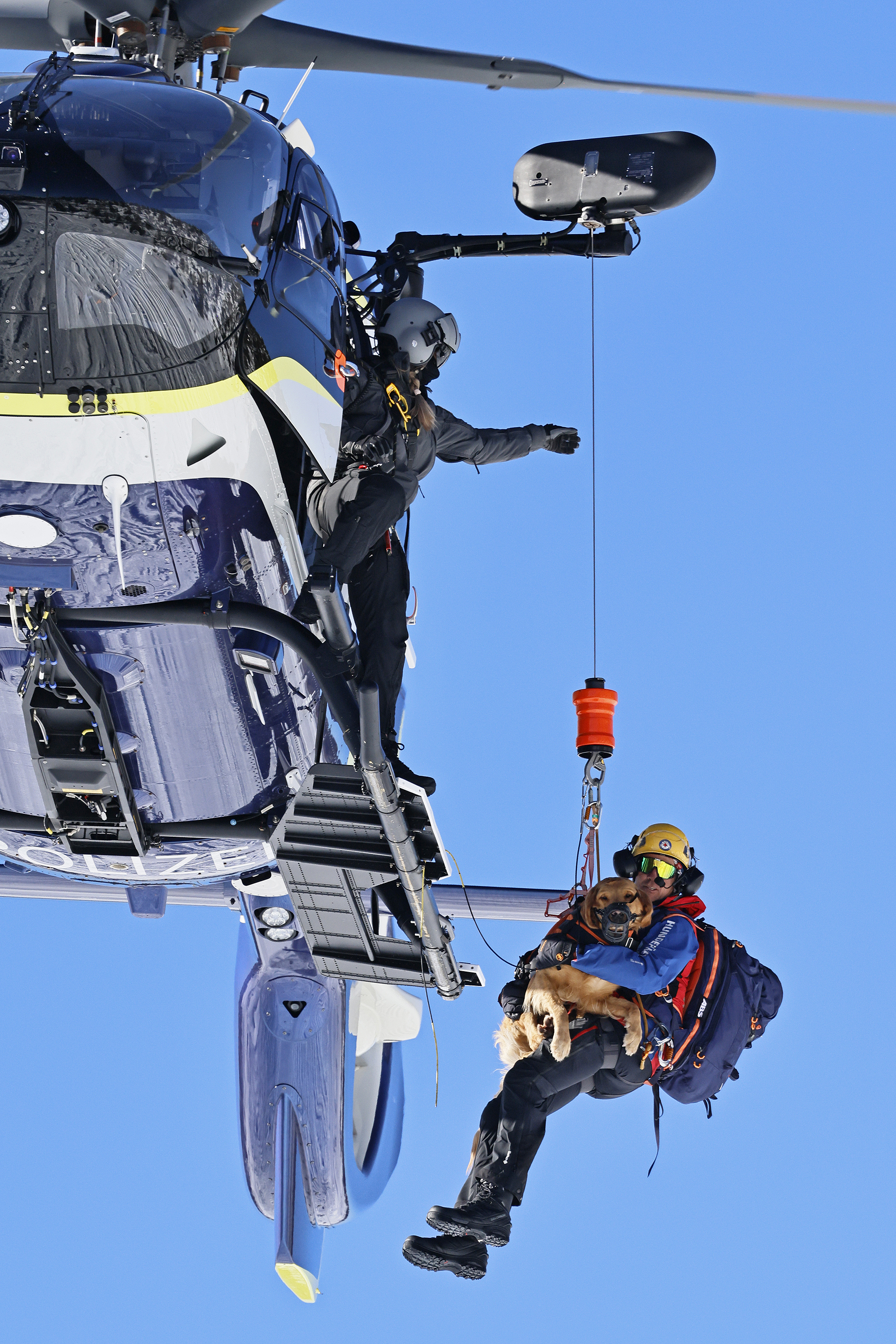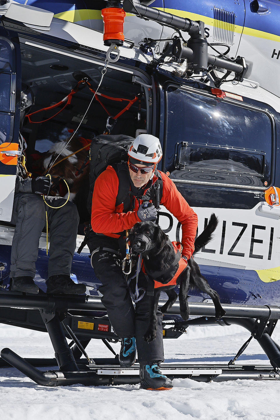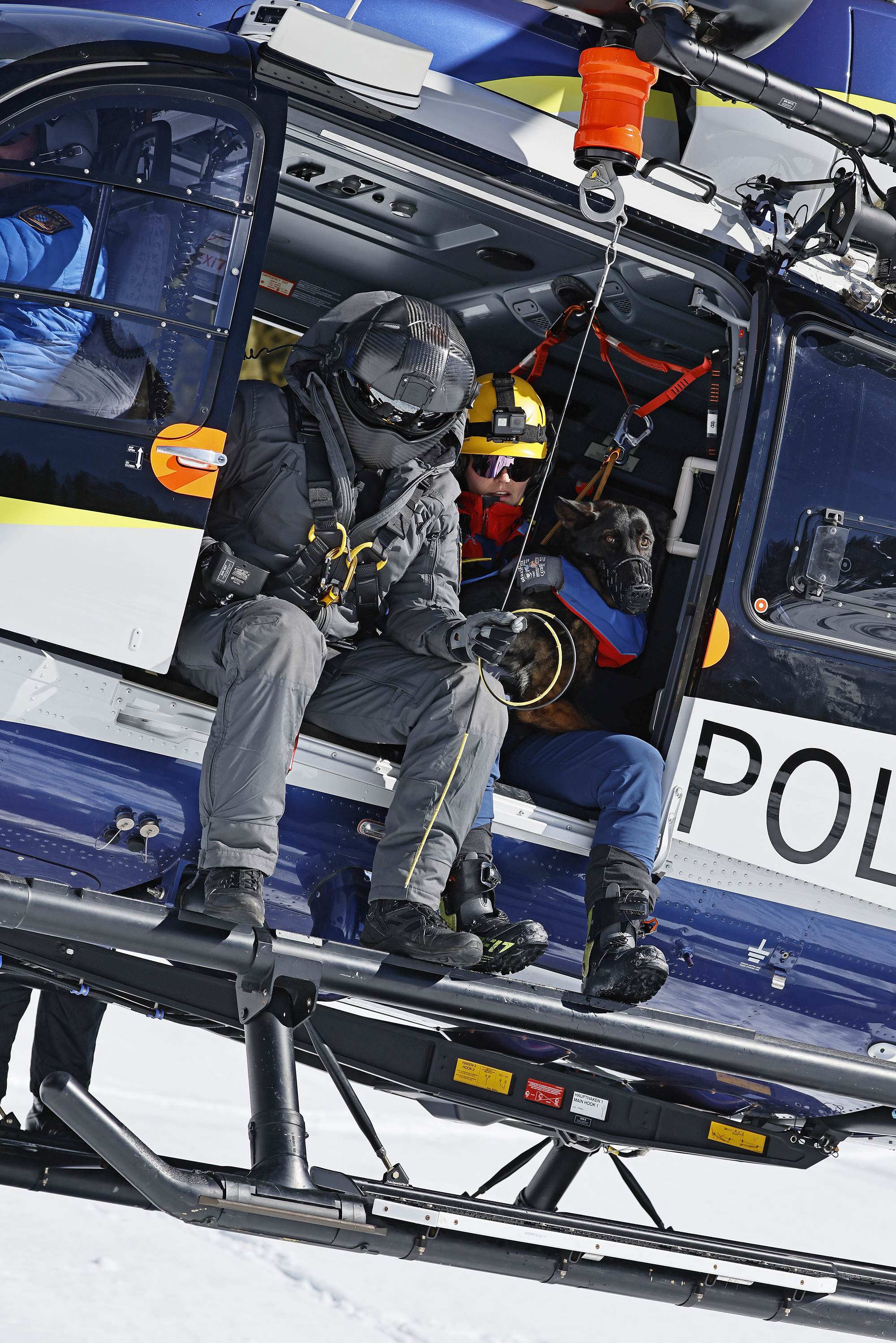 Die komplette Kommunikation zwischen Hundeführer und Heli-Besatzung erfolgt über auch aus größerer Entfernung eindeutig erkennbare Handzeichen. Unter dem Abwind des Hubschraubers wird der Schnee aufgewirbelt und die Sicht ist eingeschränkt; der im Fluggeschirr gesicherte Hund steht unter Adrenalin, springt unter Umständen herum und muss beruhigt werden. Trotzdem muss der Hundeführer genau darauf achten, wie er sich, den Vierbeiner, seine Ski und weitere Ausrüstung in den Windenhaken einhängt. Alles ist in Bewegung, und ganz schnell wickelt sich versehentlich eine Bandschlinge um den Hund, die bei Belastung auf den Weg nach oben in die Kabine womöglich die Kehle abschnüren oder den Schwanz brechen kann. Auf dem Weg in den Heli wird es eng: Der Winden-Operator steht bei offener Seitentüre auf der Kufe und braucht Platz, die Ski und der Hund müssen an ihm vorbei ins Innere gehoben und so gesichert werden, dass Herrchen, Rucksack und womöglich weitere Ausrüstung auch noch Platz haben.