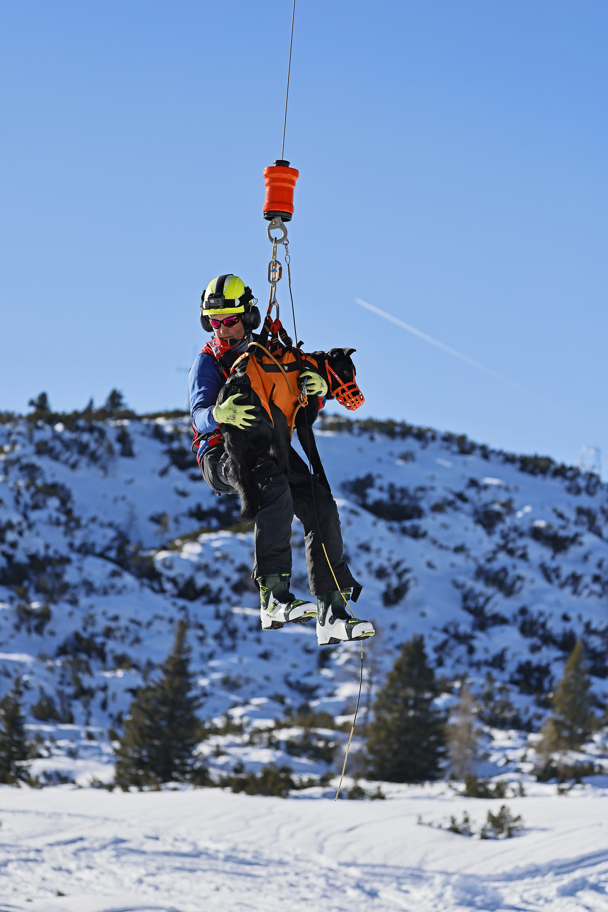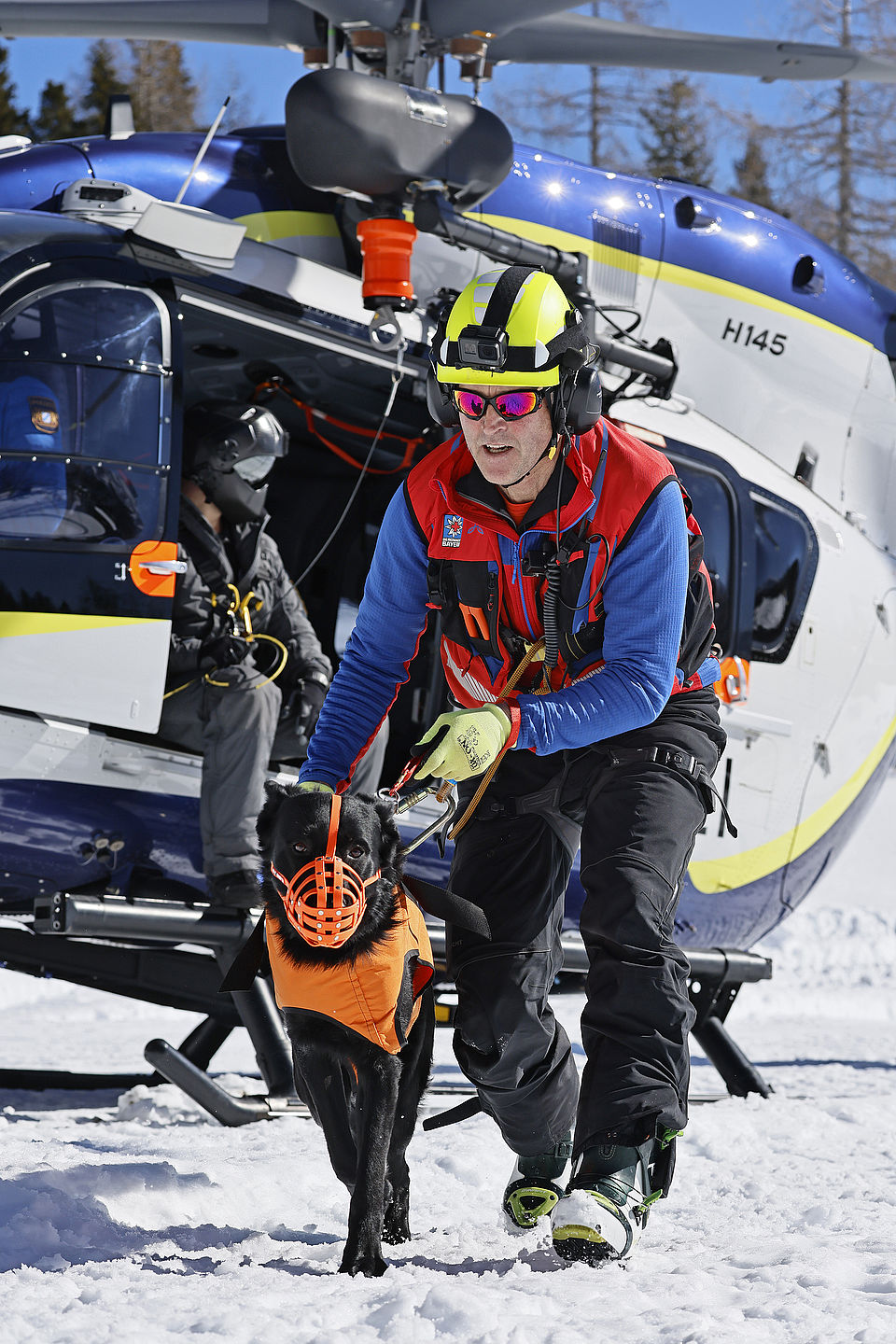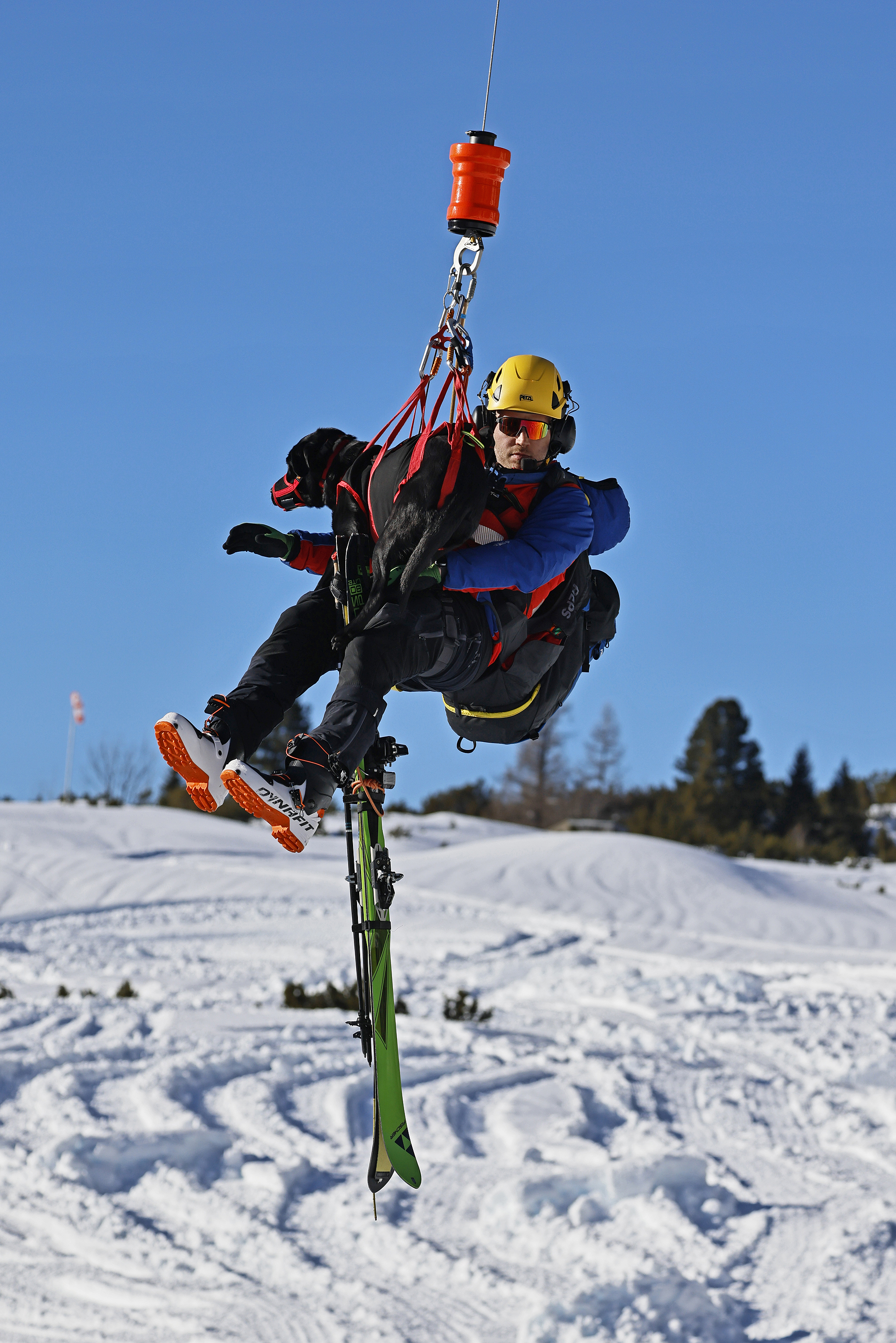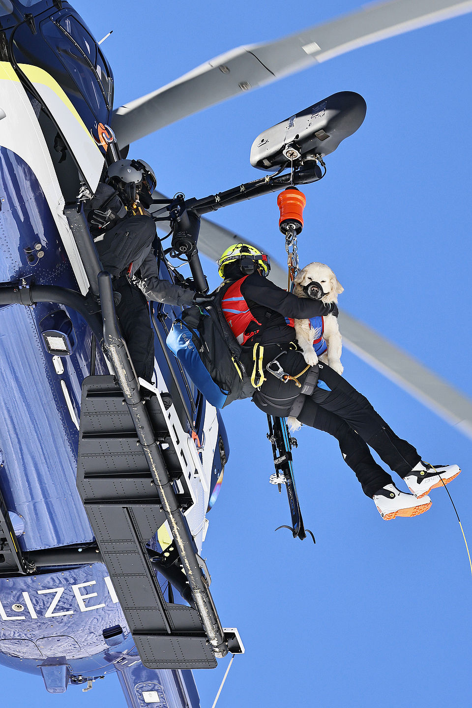Die komplette Kommunikation zwischen Hundeführer und Heli-Besatzung erfolgt über auch aus größerer Entfernung eindeutig erkennbare Handzeichen. Unter dem Abwind des Hubschraubers wird der Schnee aufgewirbelt und die Sicht ist eingeschränkt; der im Fluggeschirr gesicherte Hund steht unter Adrenalin, springt unter Umständen herum und muss beruhigt werden. Trotzdem muss der Hundeführer genau darauf achten, wie er sich, den Vierbeiner, seine Ski und weitere Ausrüstung in den Windenhaken einhängt. Alles ist in Bewegung, und ganz schnell wickelt sich versehentlich eine Bandschlinge um den Hund, die bei Belastung auf den Weg nach oben in die Kabine womöglich die Kehle abschnüren oder den Schwanz brechen kann. Auf dem Weg in den Heli wird es eng: Der Winden-Operator steht bei offener Seitentüre auf der Kufe und braucht Platz, die Ski und der Hund müssen an ihm vorbei ins Innere gehoben und so gesichert werden, dass Herrchen, Rucksack und womöglich weitere Ausrüstung auch noch Platz haben.
