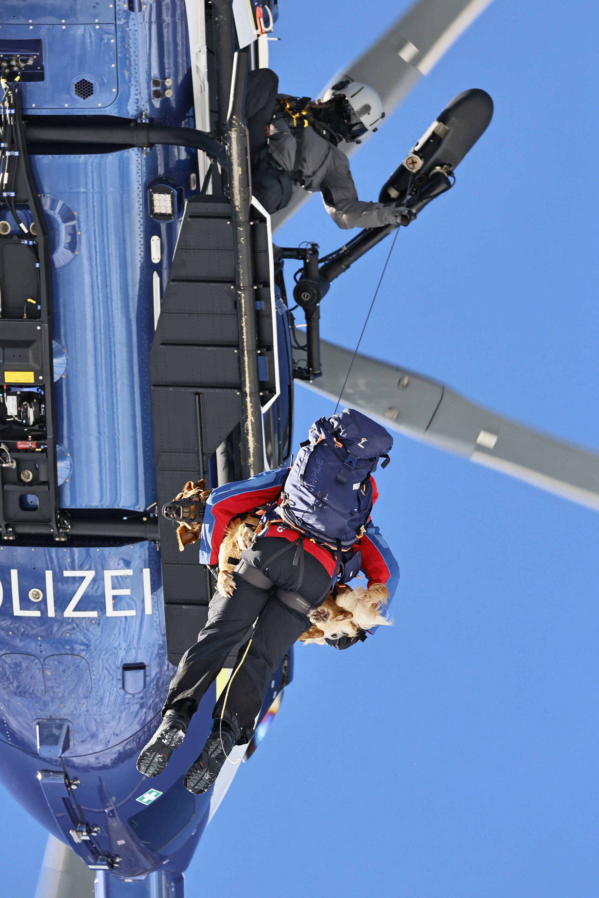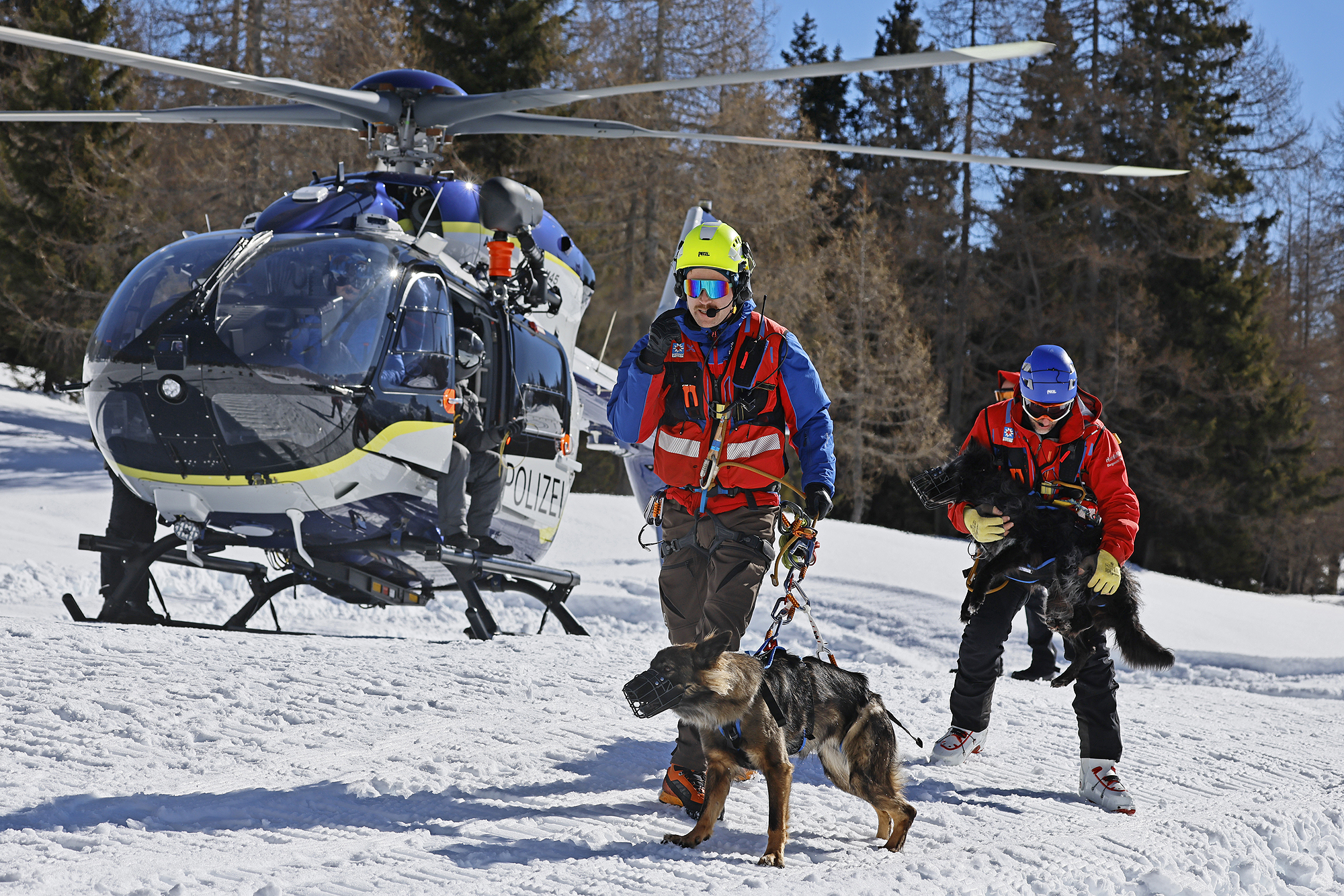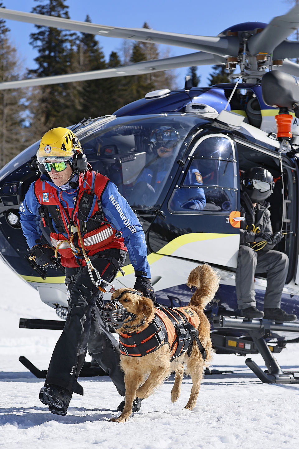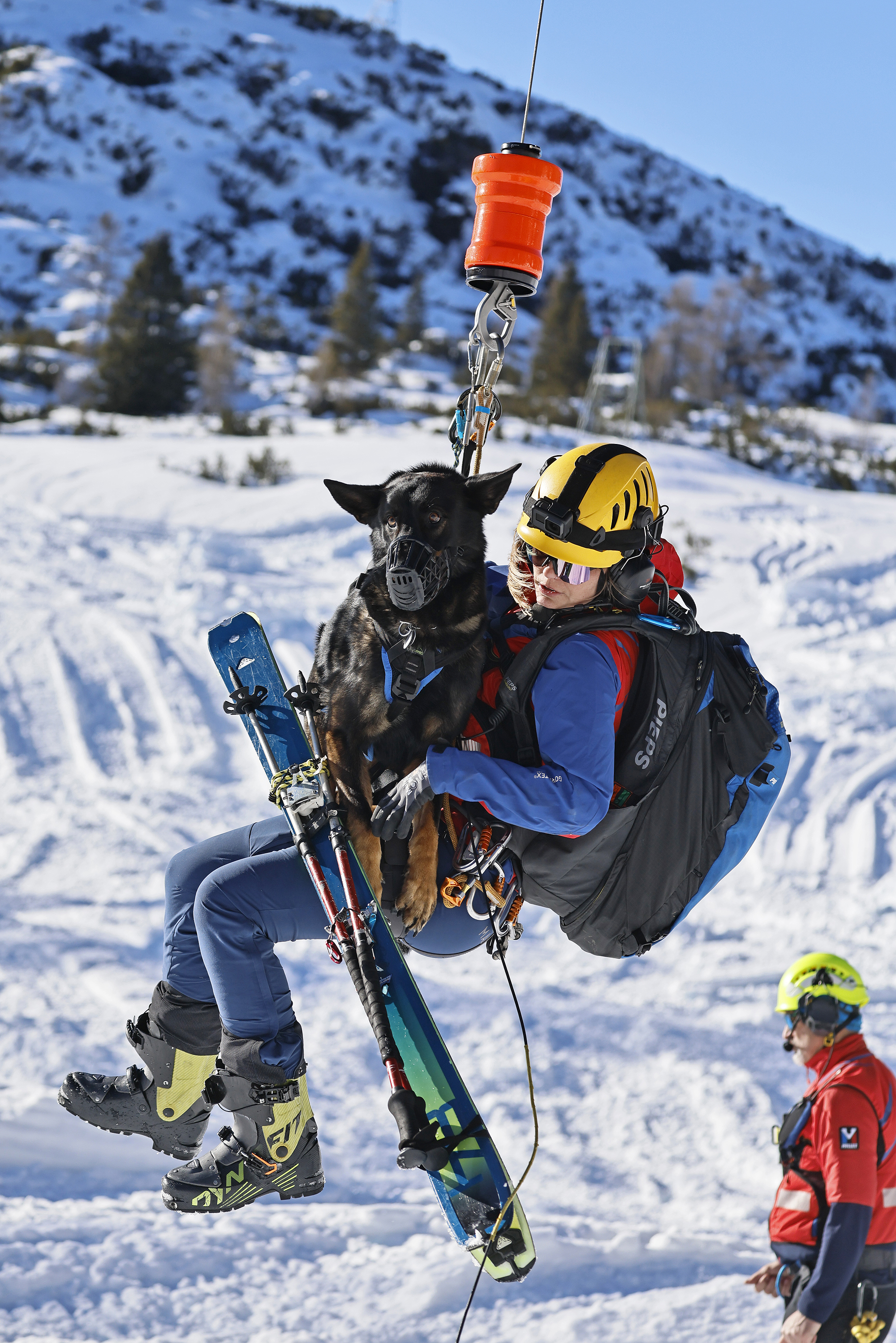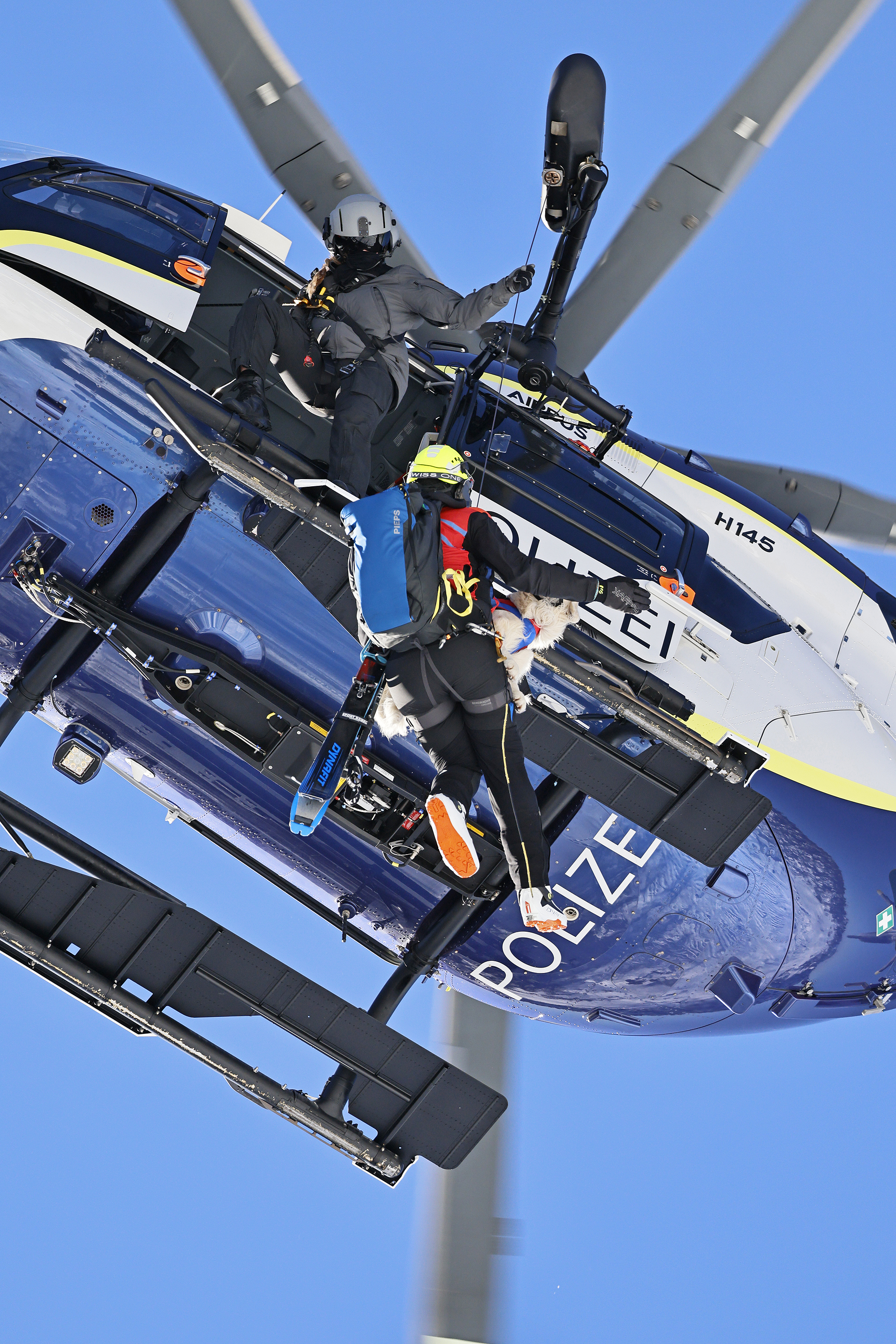 Die komplette Kommunikation zwischen Hundeführer und Heli-Besatzung erfolgt über auch aus größerer Entfernung eindeutig erkennbare Handzeichen. Unter dem Abwind des Hubschraubers wird der Schnee aufgewirbelt und die Sicht ist eingeschränkt; der im Fluggeschirr gesicherte Hund steht unter Adrenalin, springt unter Umständen herum und muss beruhigt werden. Trotzdem muss der Hundeführer genau darauf achten, wie er sich, den Vierbeiner, seine Ski und weitere Ausrüstung in den Windenhaken einhängt. Alles ist in Bewegung, und ganz schnell wickelt sich versehentlich eine Bandschlinge um den Hund, die bei Belastung auf den Weg nach oben in die Kabine womöglich die Kehle abschnüren oder den Schwanz brechen kann. Auf dem Weg in den Heli wird es eng: Der Winden-Operator steht bei offener Seitentüre auf der Kufe und braucht Platz, die Ski und der Hund müssen an ihm vorbei ins Innere gehoben und so gesichert werden, dass Herrchen, Rucksack und womöglich weitere Ausrüstung auch noch Platz haben.