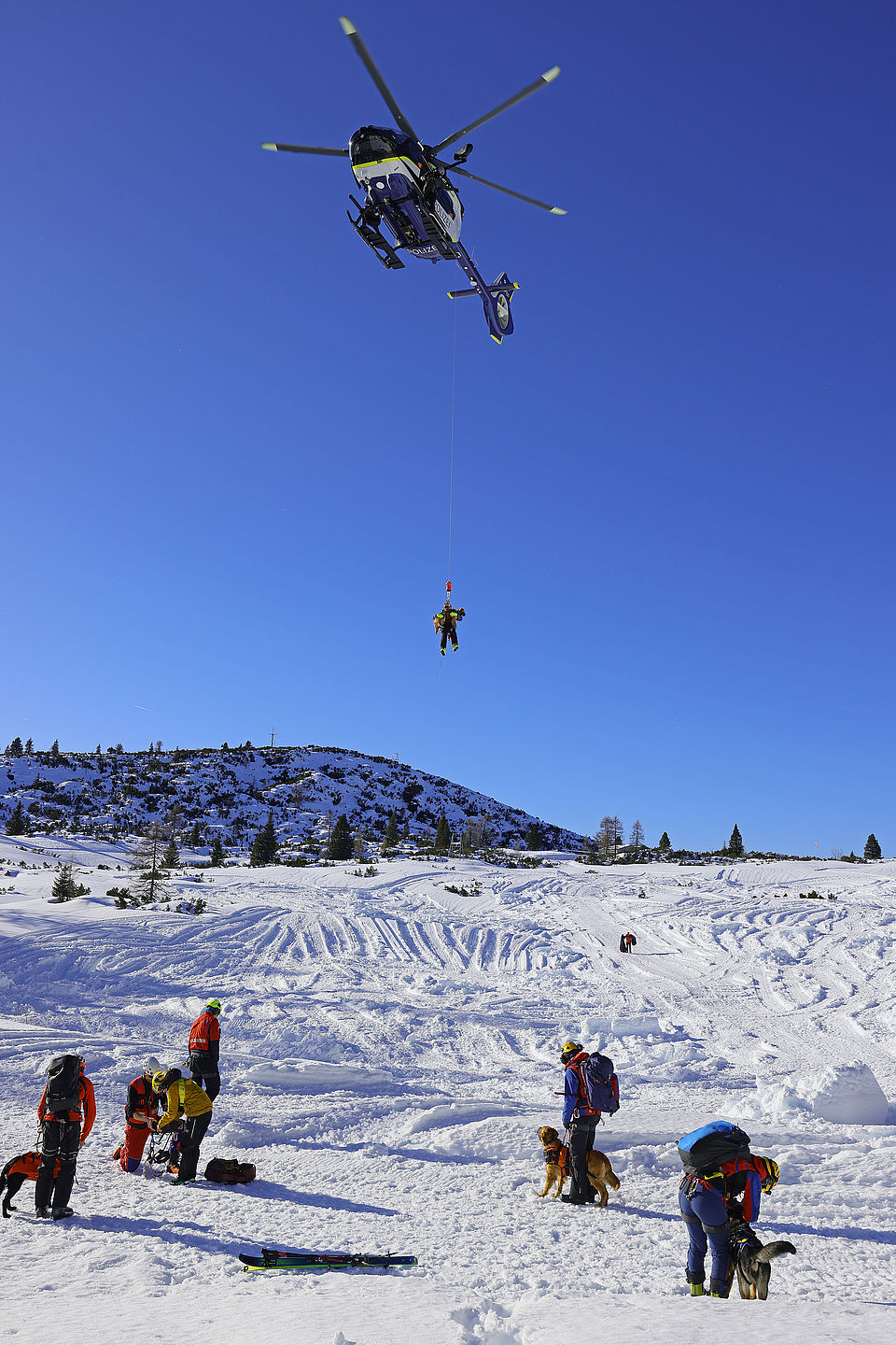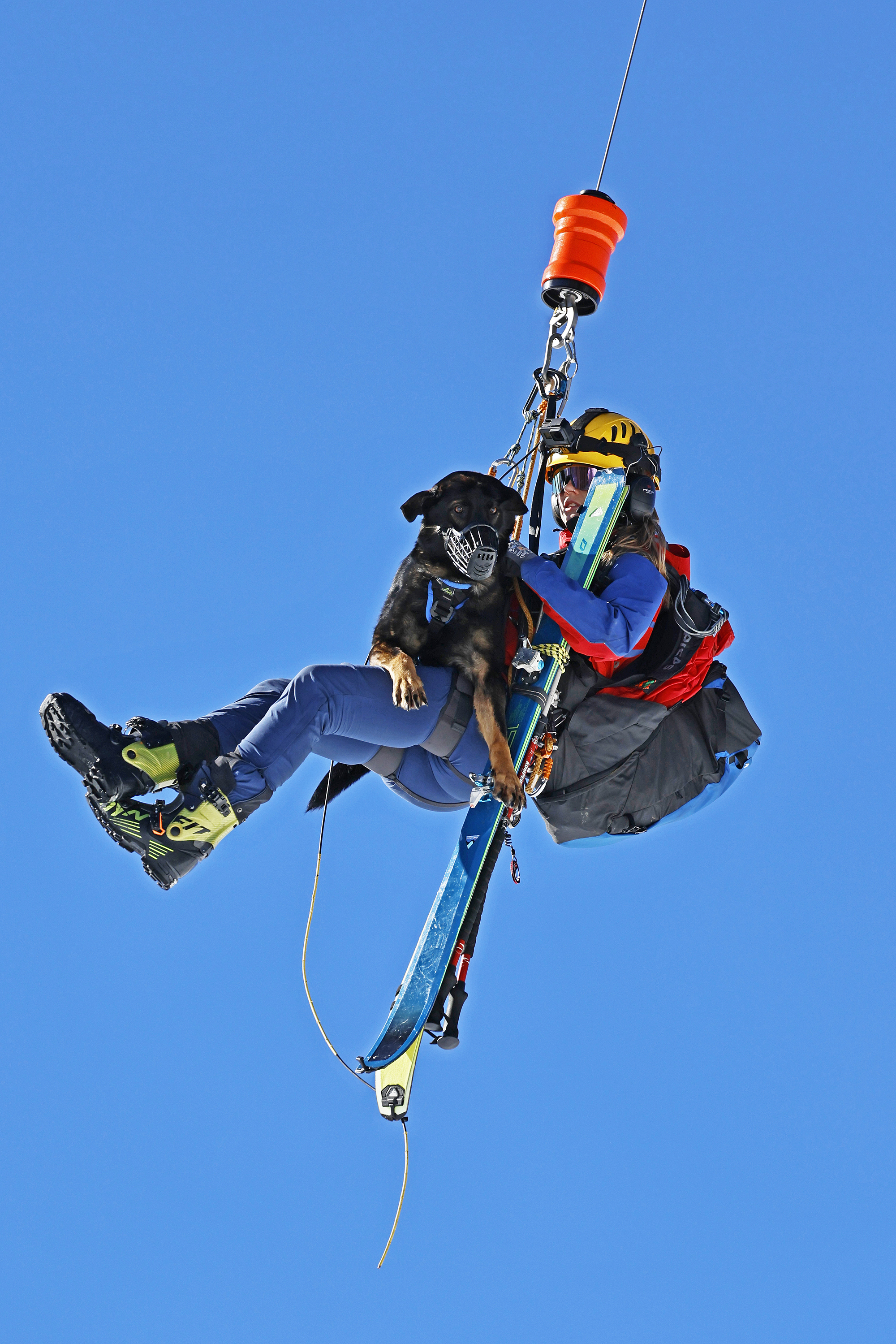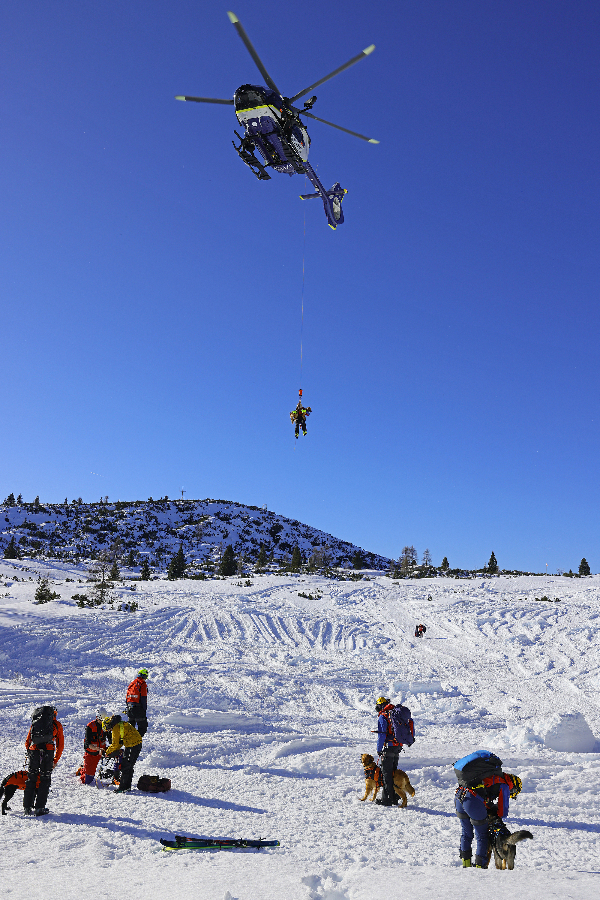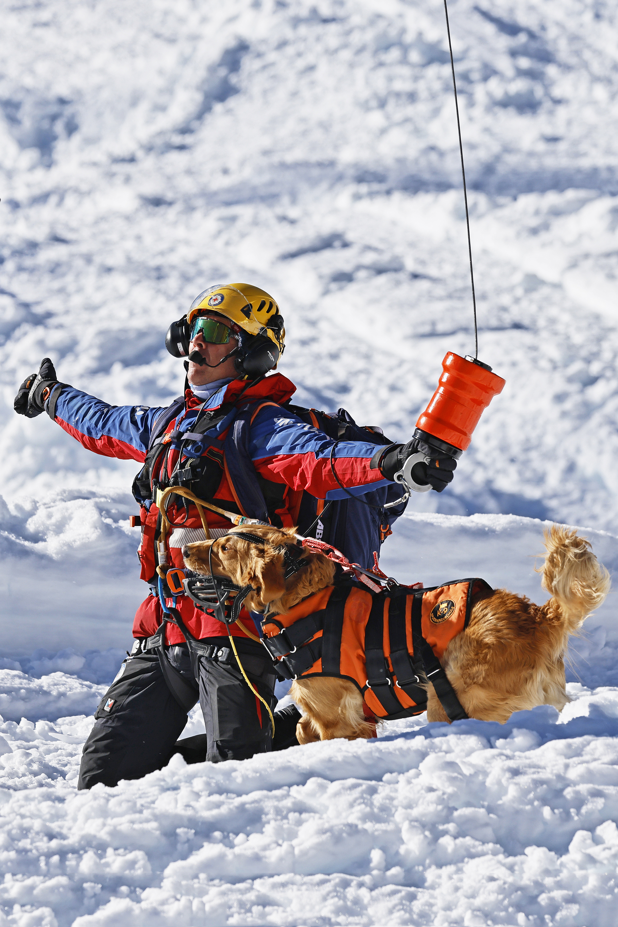 Die komplette Kommunikation zwischen Hundeführer und Heli-Besatzung erfolgt über auch aus größerer Entfernung eindeutig erkennbare Handzeichen. Unter dem Abwind des Hubschraubers wird der Schnee aufgewirbelt und die Sicht ist eingeschränkt; der im Fluggeschirr gesicherte Hund steht unter Adrenalin, springt unter Umständen herum und muss beruhigt werden. Trotzdem muss der Hundeführer genau darauf achten, wie er sich, den Vierbeiner, seine Ski und weitere Ausrüstung in den Windenhaken einhängt. Alles ist in Bewegung, und ganz schnell wickelt sich versehentlich eine Bandschlinge um den Hund, die bei Belastung auf den Weg nach oben in die Kabine womöglich die Kehle abschnüren oder den Schwanz brechen kann. Auf dem Weg in den Heli wird es eng: Der Winden-Operator steht bei offener Seitentüre auf der Kufe und braucht Platz, die Ski und der Hund müssen an ihm vorbei ins Innere gehoben und so gesichert werden, dass Herrchen, Rucksack und womöglich weitere Ausrüstung auch noch Platz haben.