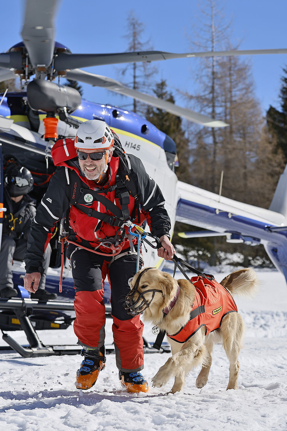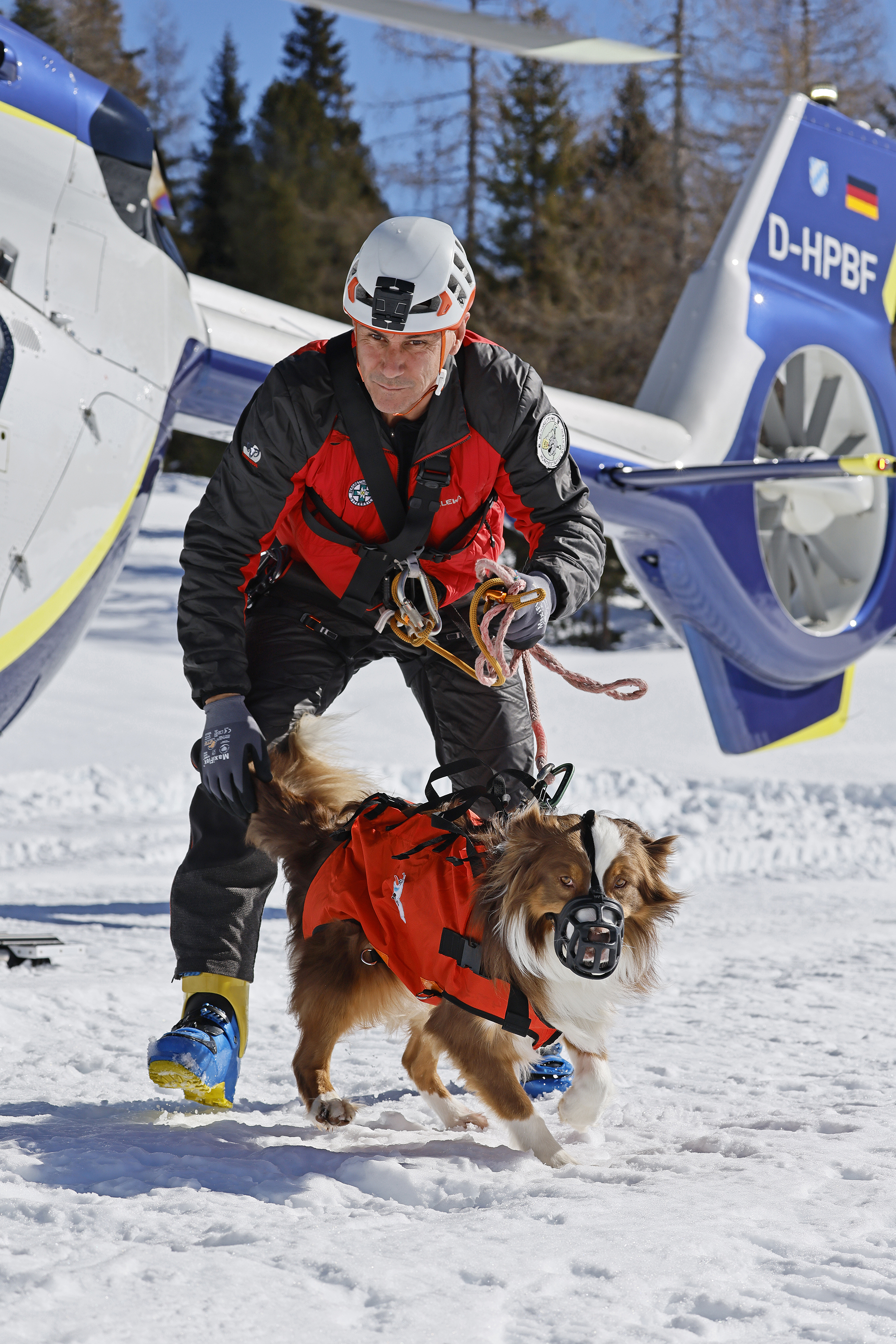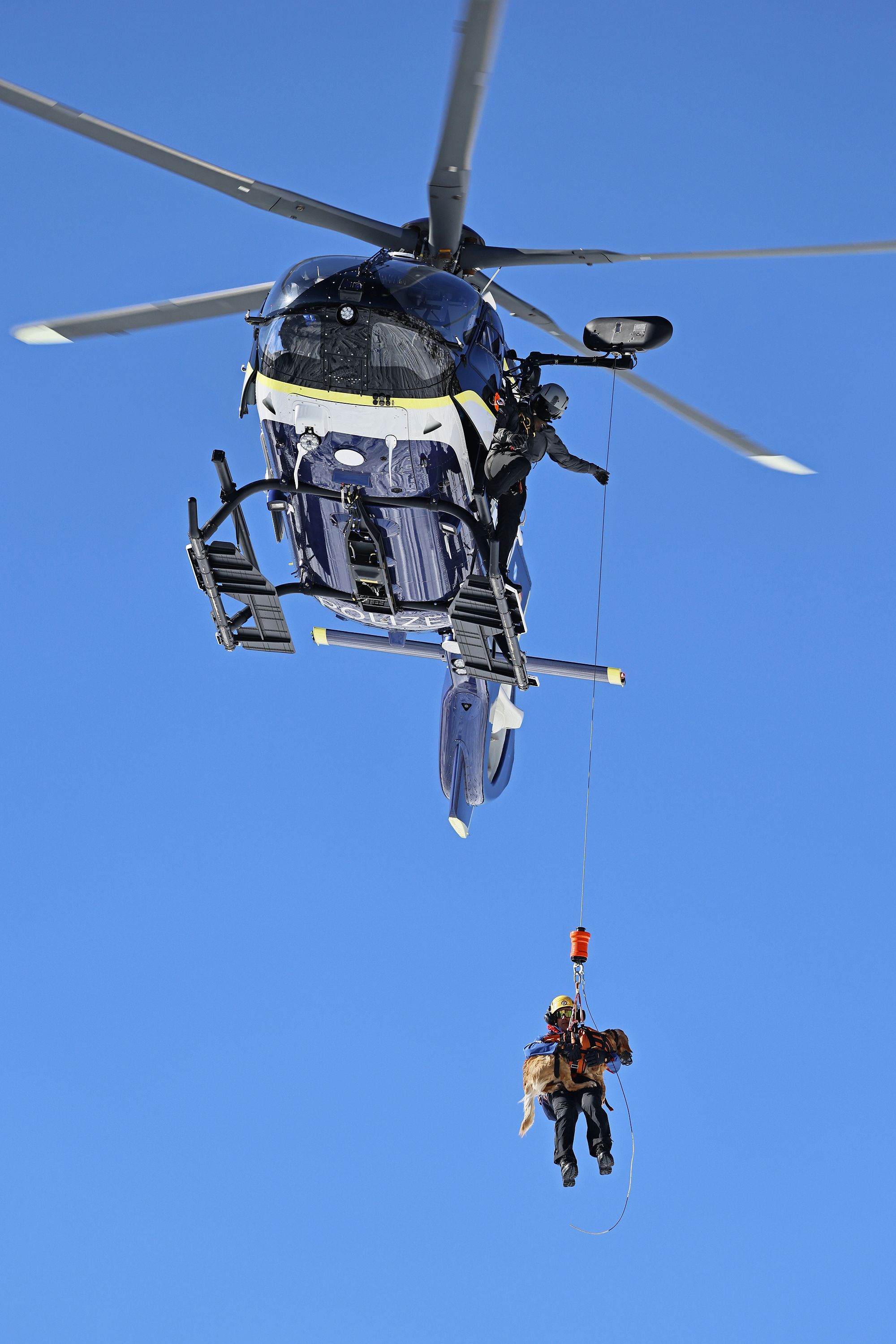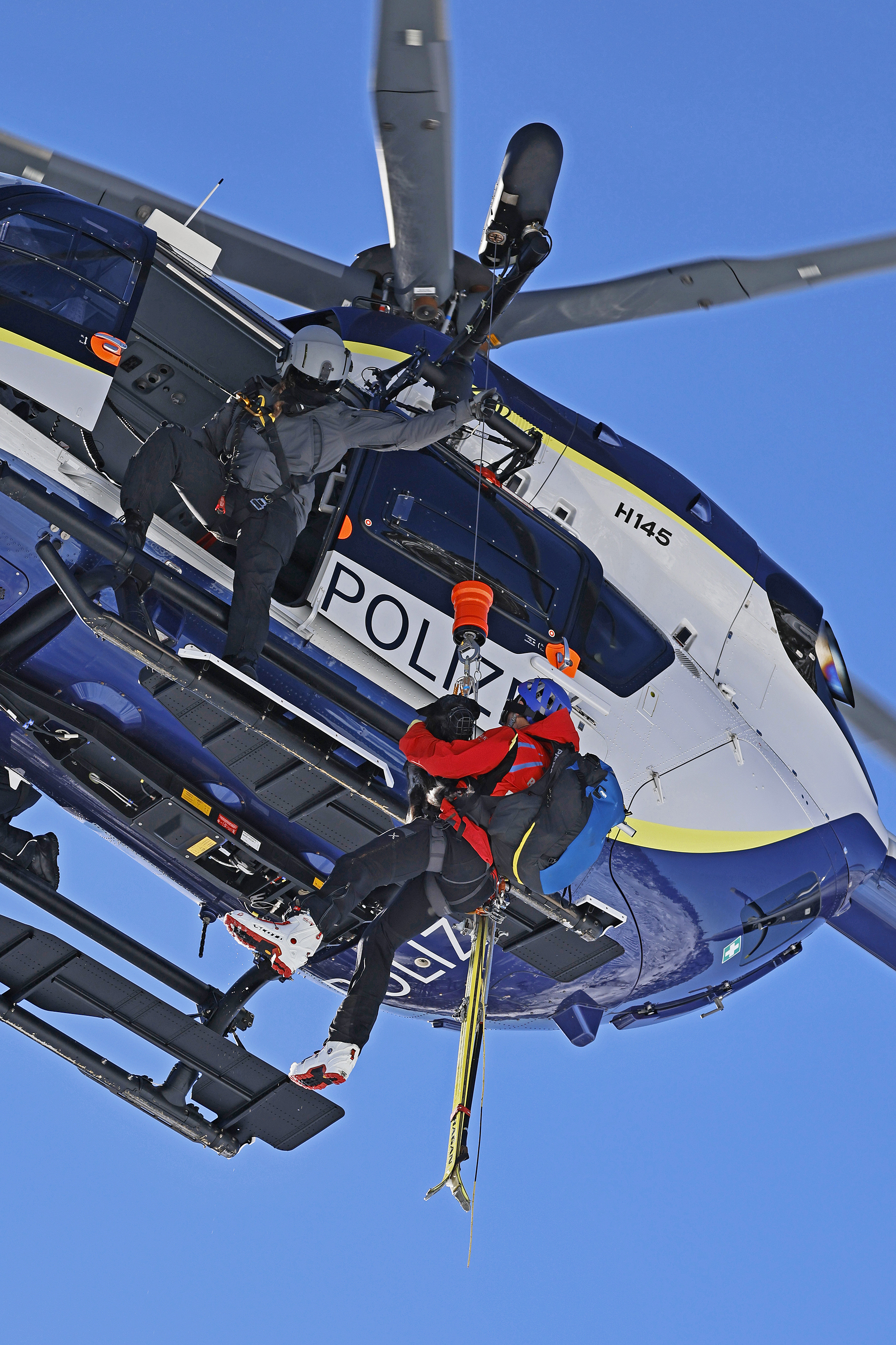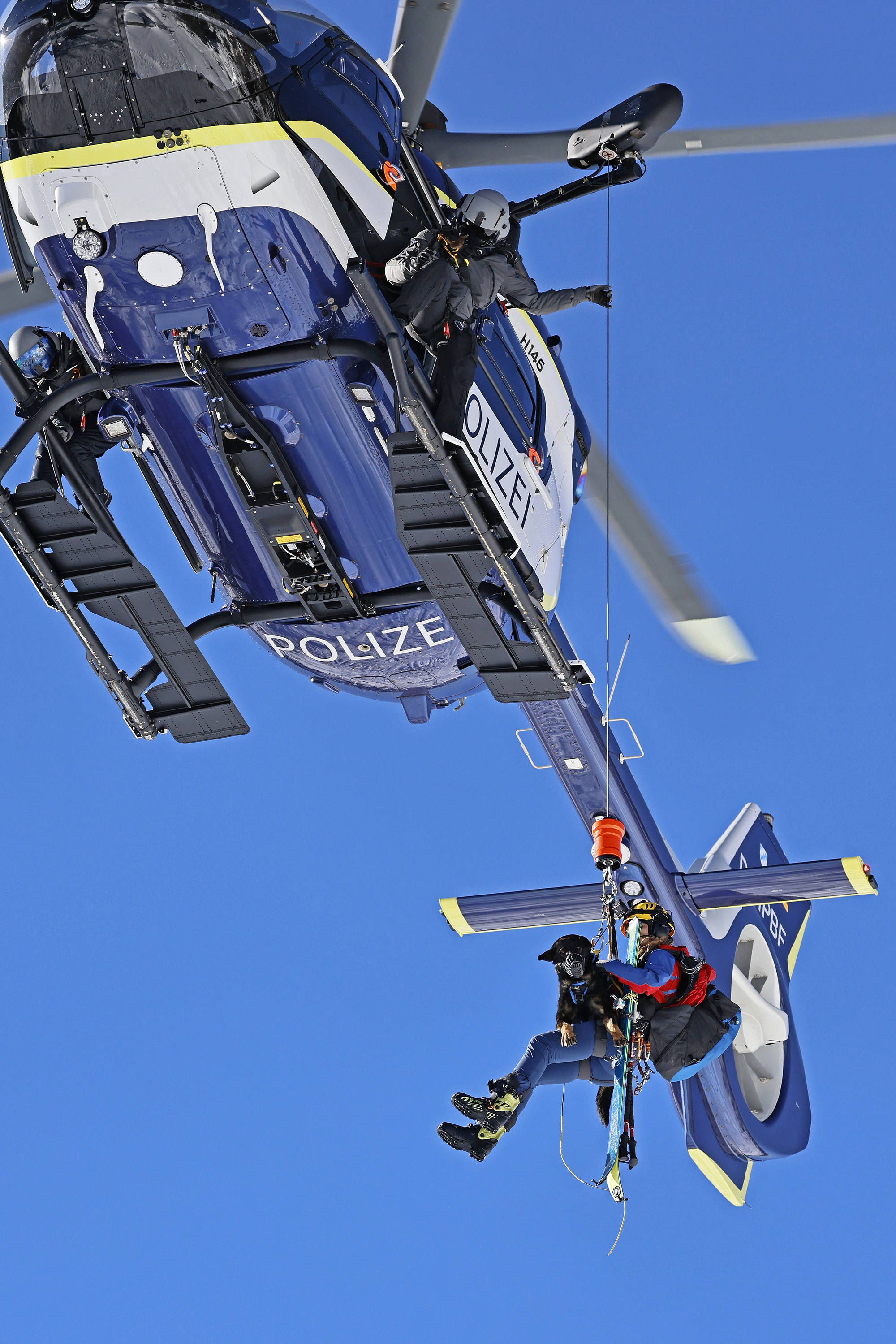 Die komplette Kommunikation zwischen Hundeführer und Heli-Besatzung erfolgt über auch aus größerer Entfernung eindeutig erkennbare Handzeichen. Unter dem Abwind des Hubschraubers wird der Schnee aufgewirbelt und die Sicht ist eingeschränkt; der im Fluggeschirr gesicherte Hund steht unter Adrenalin, springt unter Umständen herum und muss beruhigt werden. Trotzdem muss der Hundeführer genau darauf achten, wie er sich, den Vierbeiner, seine Ski und weitere Ausrüstung in den Windenhaken einhängt. Alles ist in Bewegung, und ganz schnell wickelt sich versehentlich eine Bandschlinge um den Hund, die bei Belastung auf den Weg nach oben in die Kabine womöglich die Kehle abschnüren oder den Schwanz brechen kann. Auf dem Weg in den Heli wird es eng: Der Winden-Operator steht bei offener Seitentüre auf der Kufe und braucht Platz, die Ski und der Hund müssen an ihm vorbei ins Innere gehoben und so gesichert werden, dass Herrchen, Rucksack und womöglich weitere Ausrüstung auch noch Platz haben.
