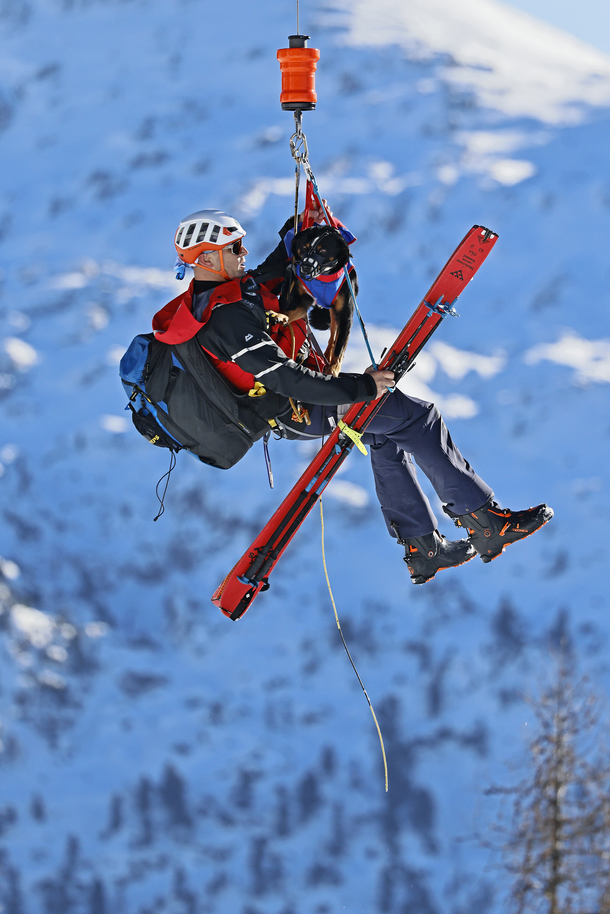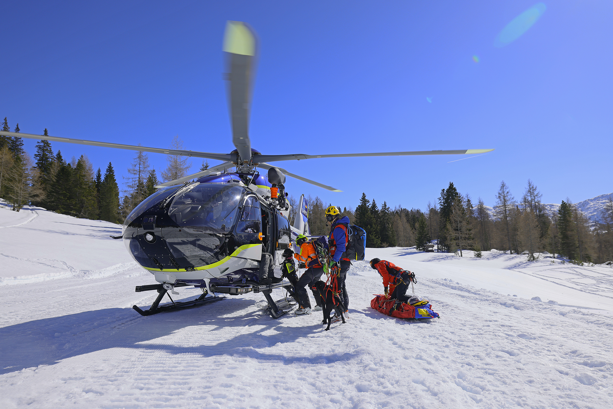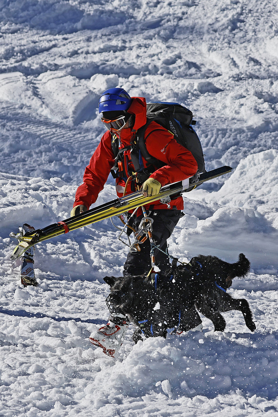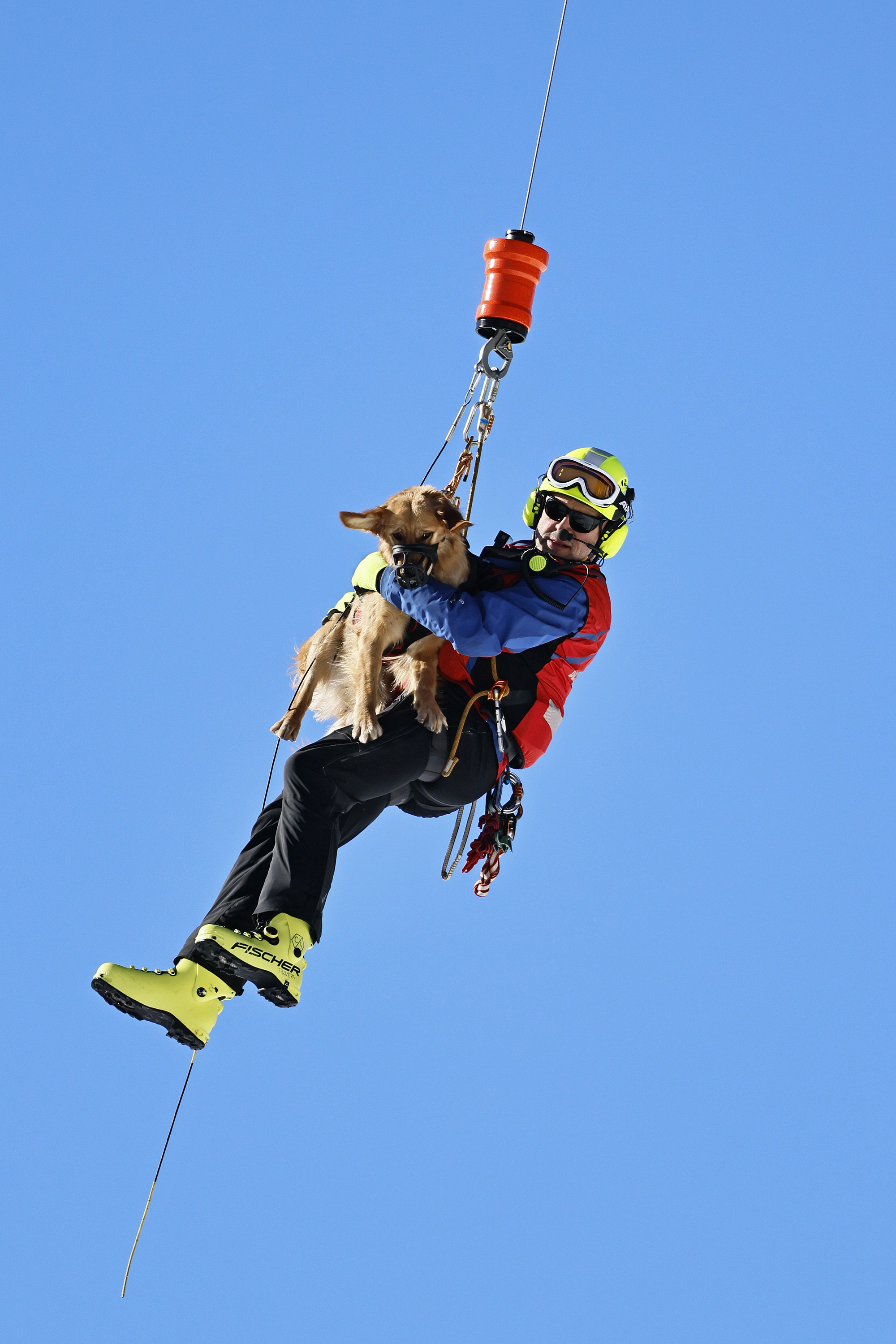 Die komplette Kommunikation zwischen Hundeführer und Heli-Besatzung erfolgt über auch aus größerer Entfernung eindeutig erkennbare Handzeichen. Unter dem Abwind des Hubschraubers wird der Schnee aufgewirbelt und die Sicht ist eingeschränkt; der im Fluggeschirr gesicherte Hund steht unter Adrenalin, springt unter Umständen herum und muss beruhigt werden. Trotzdem muss der Hundeführer genau darauf achten, wie er sich, den Vierbeiner, seine Ski und weitere Ausrüstung in den Windenhaken einhängt. Alles ist in Bewegung, und ganz schnell wickelt sich versehentlich eine Bandschlinge um den Hund, die bei Belastung auf den Weg nach oben in die Kabine womöglich die Kehle abschnüren oder den Schwanz brechen kann. Auf dem Weg in den Heli wird es eng: Der Winden-Operator steht bei offener Seitentüre auf der Kufe und braucht Platz, die Ski und der Hund müssen an ihm vorbei ins Innere gehoben und so gesichert werden, dass Herrchen, Rucksack und womöglich weitere Ausrüstung auch noch Platz haben.