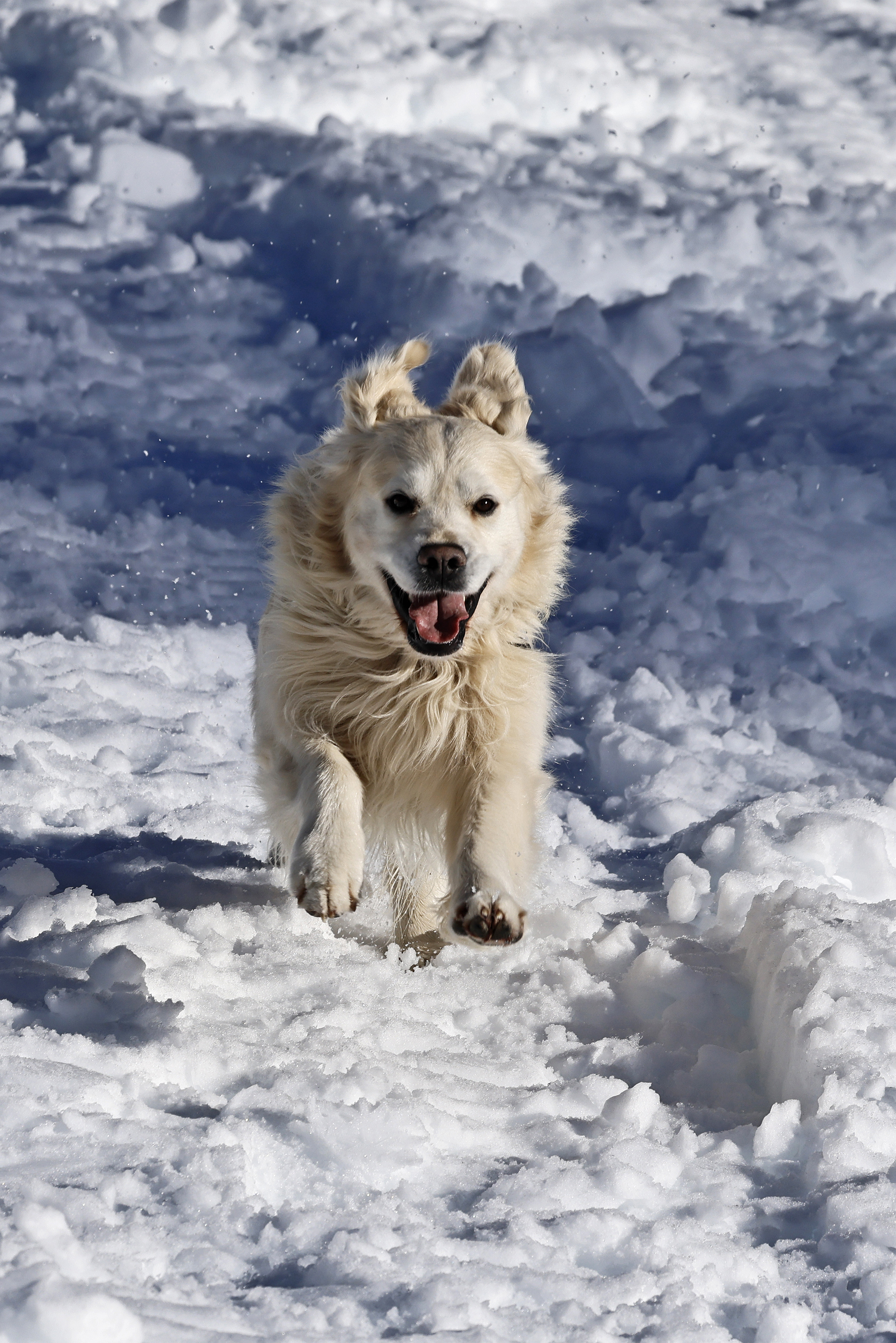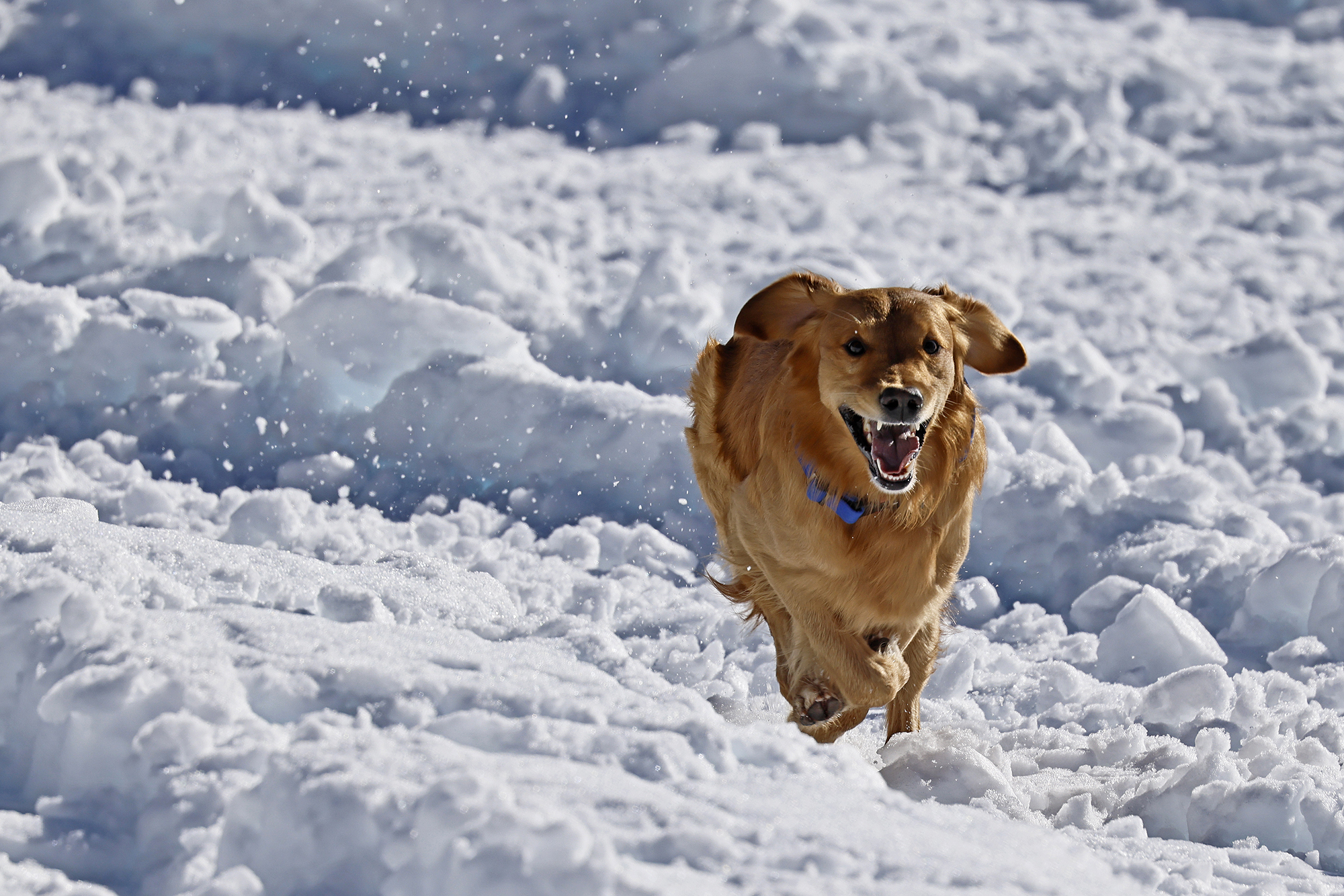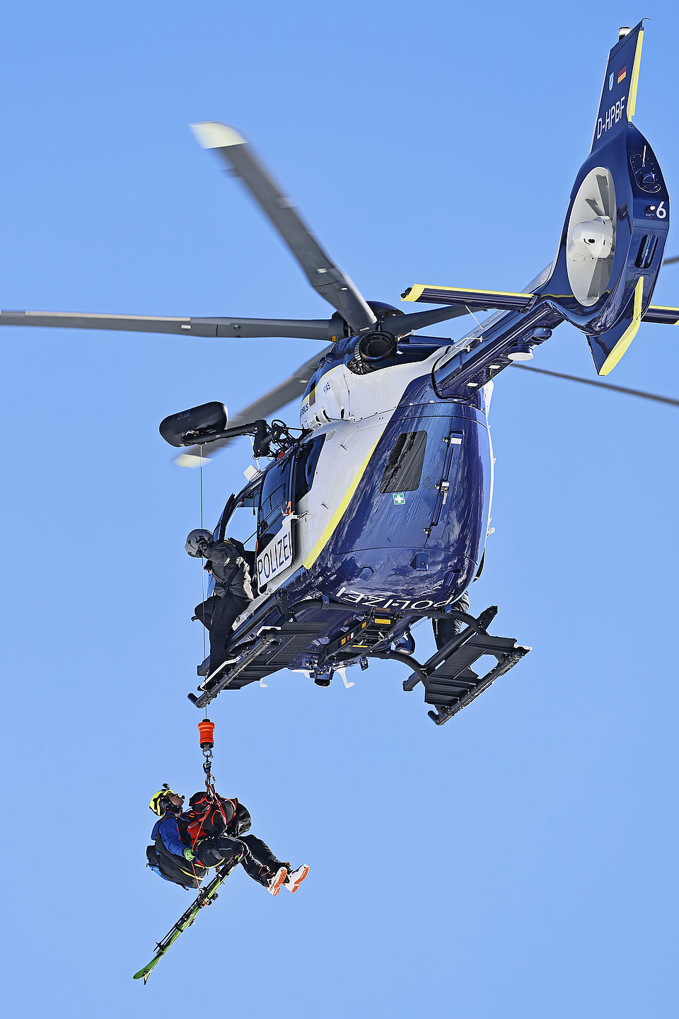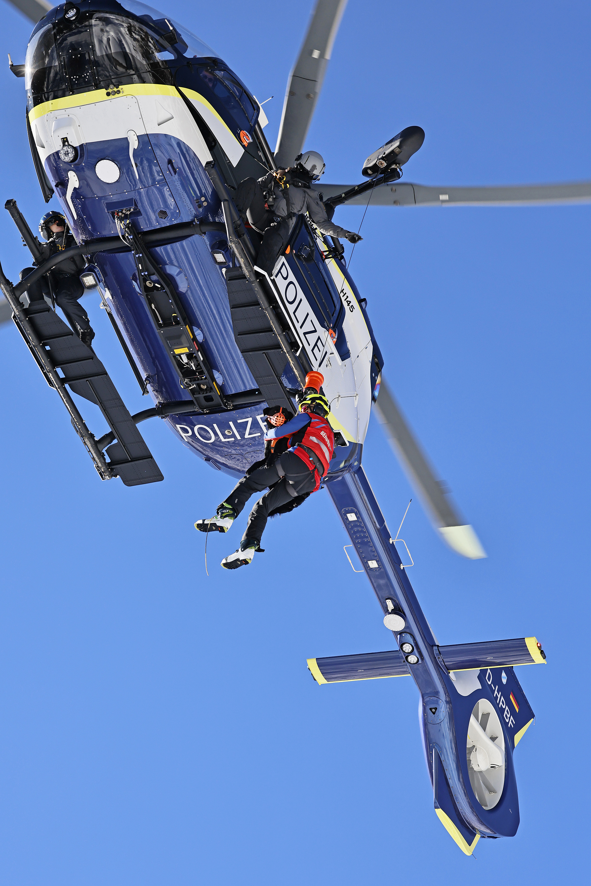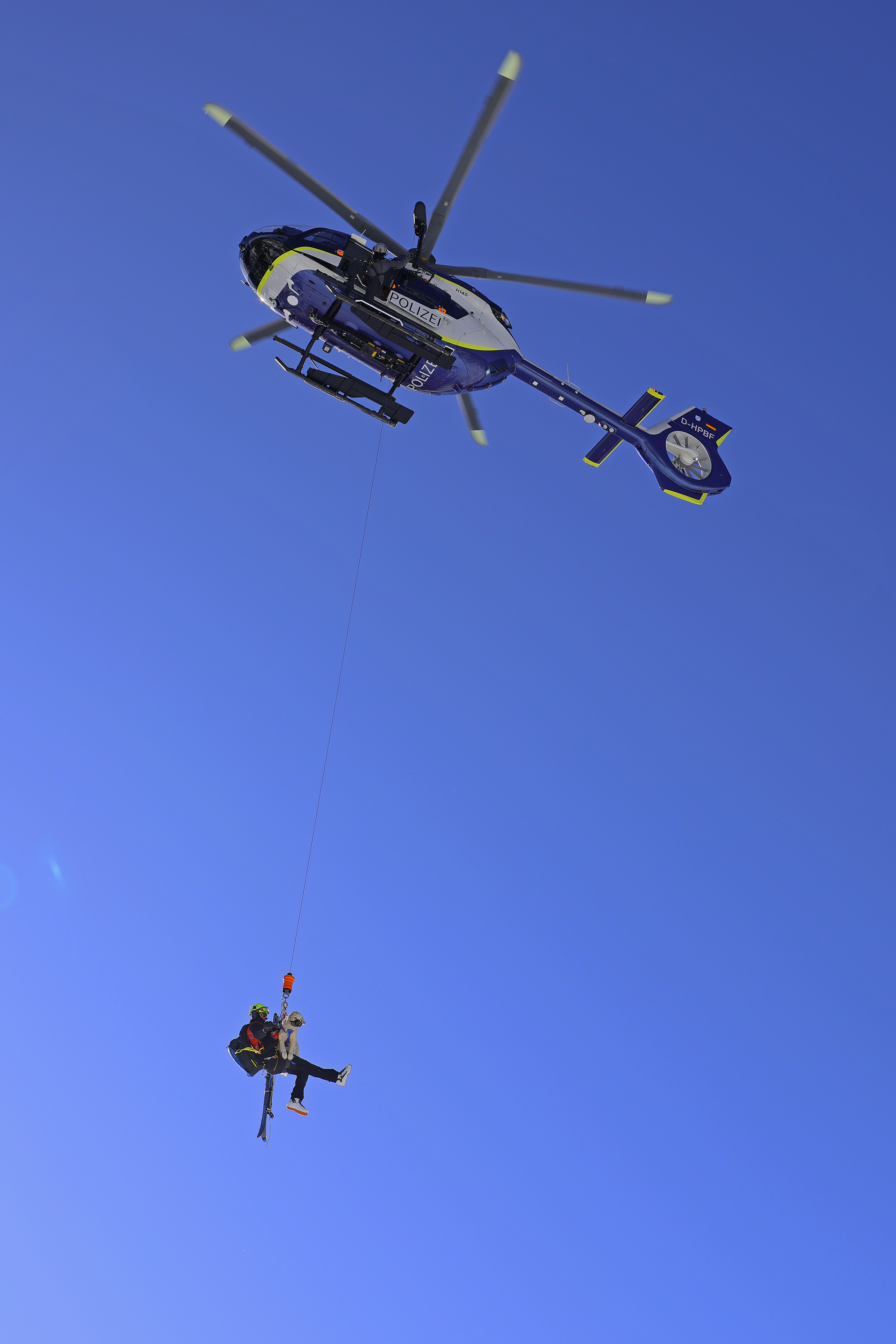 Die komplette Kommunikation zwischen Hundeführer und Heli-Besatzung erfolgt über auch aus größerer Entfernung eindeutig erkennbare Handzeichen. Unter dem Abwind des Hubschraubers wird der Schnee aufgewirbelt und die Sicht ist eingeschränkt; der im Fluggeschirr gesicherte Hund steht unter Adrenalin, springt unter Umständen herum und muss beruhigt werden. Trotzdem muss der Hundeführer genau darauf achten, wie er sich, den Vierbeiner, seine Ski und weitere Ausrüstung in den Windenhaken einhängt. Alles ist in Bewegung, und ganz schnell wickelt sich versehentlich eine Bandschlinge um den Hund, die bei Belastung auf den Weg nach oben in die Kabine womöglich die Kehle abschnüren oder den Schwanz brechen kann. Auf dem Weg in den Heli wird es eng: Der Winden-Operator steht bei offener Seitentüre auf der Kufe und braucht Platz, die Ski und der Hund müssen an ihm vorbei ins Innere gehoben und so gesichert werden, dass Herrchen, Rucksack und womöglich weitere Ausrüstung auch noch Platz haben.