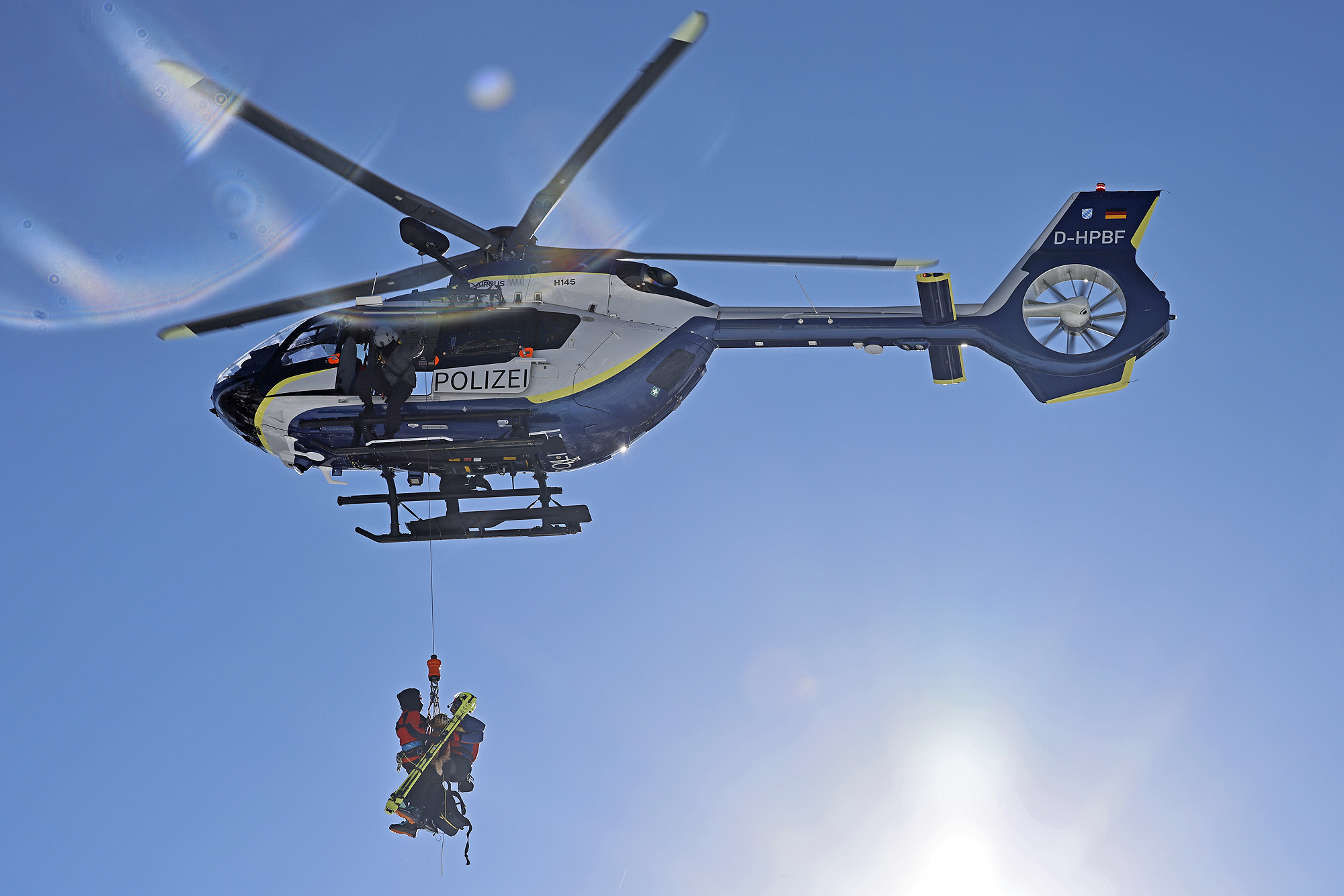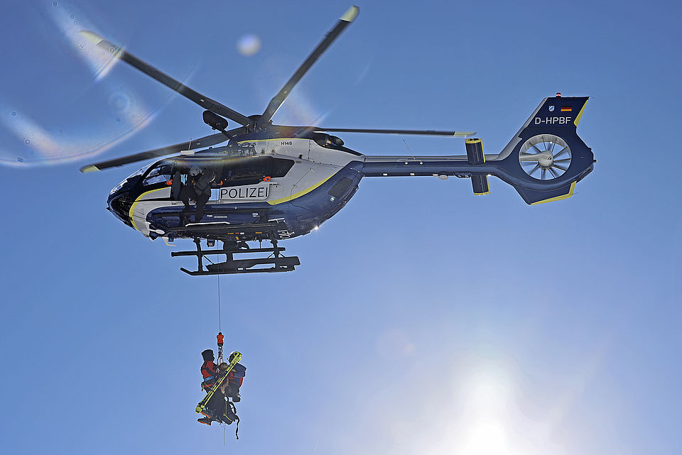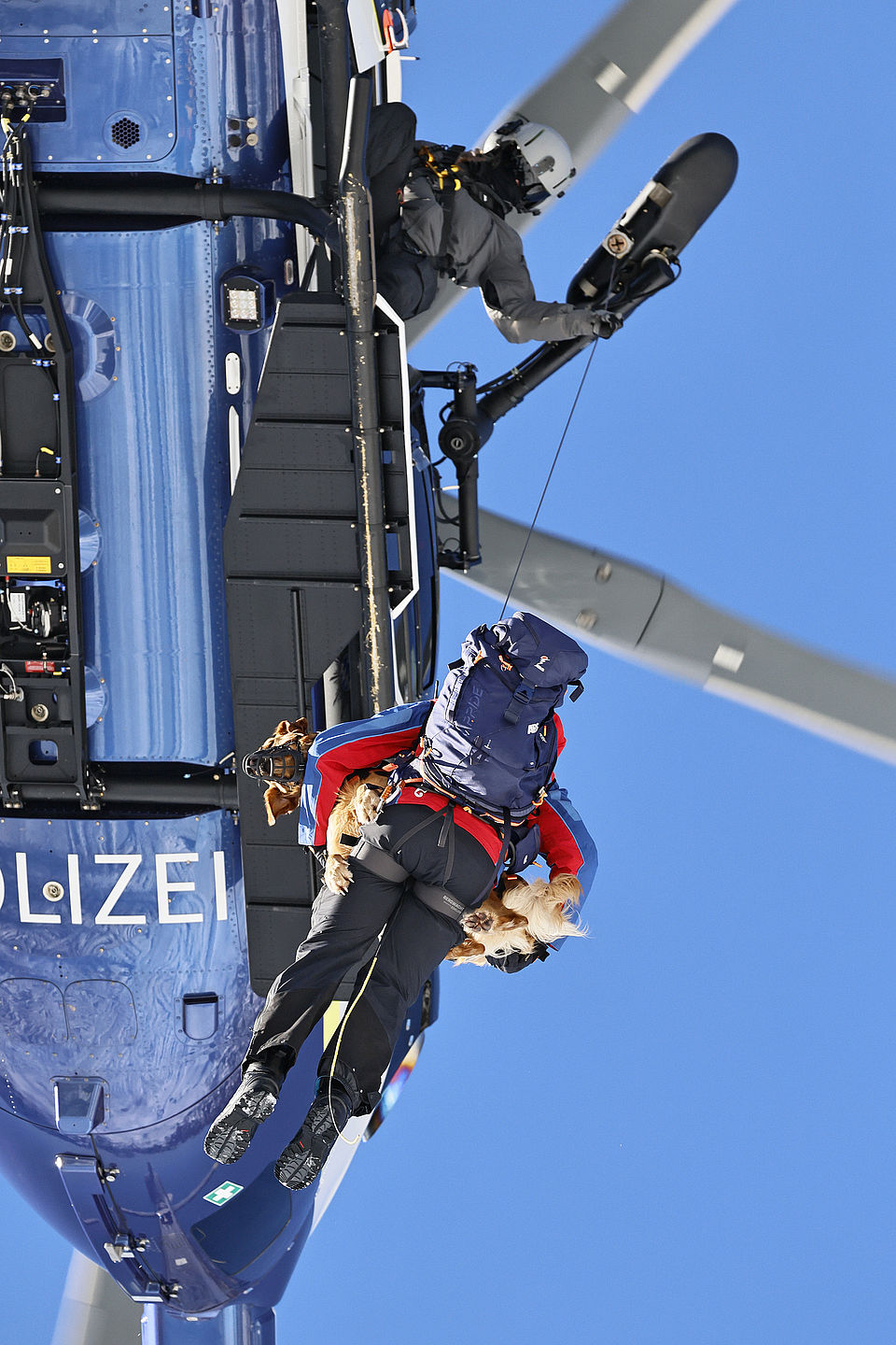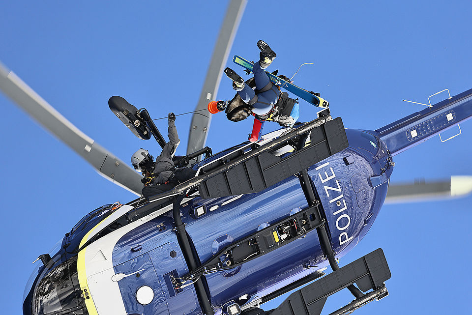 Vierbeiner und ihre Frauchen und Herrchen trainieren mit der Polizeihubschrauberstaffel Bayern Rettungswinden-Einsätze und das Ein- und Aussteigen bei laufender Maschine