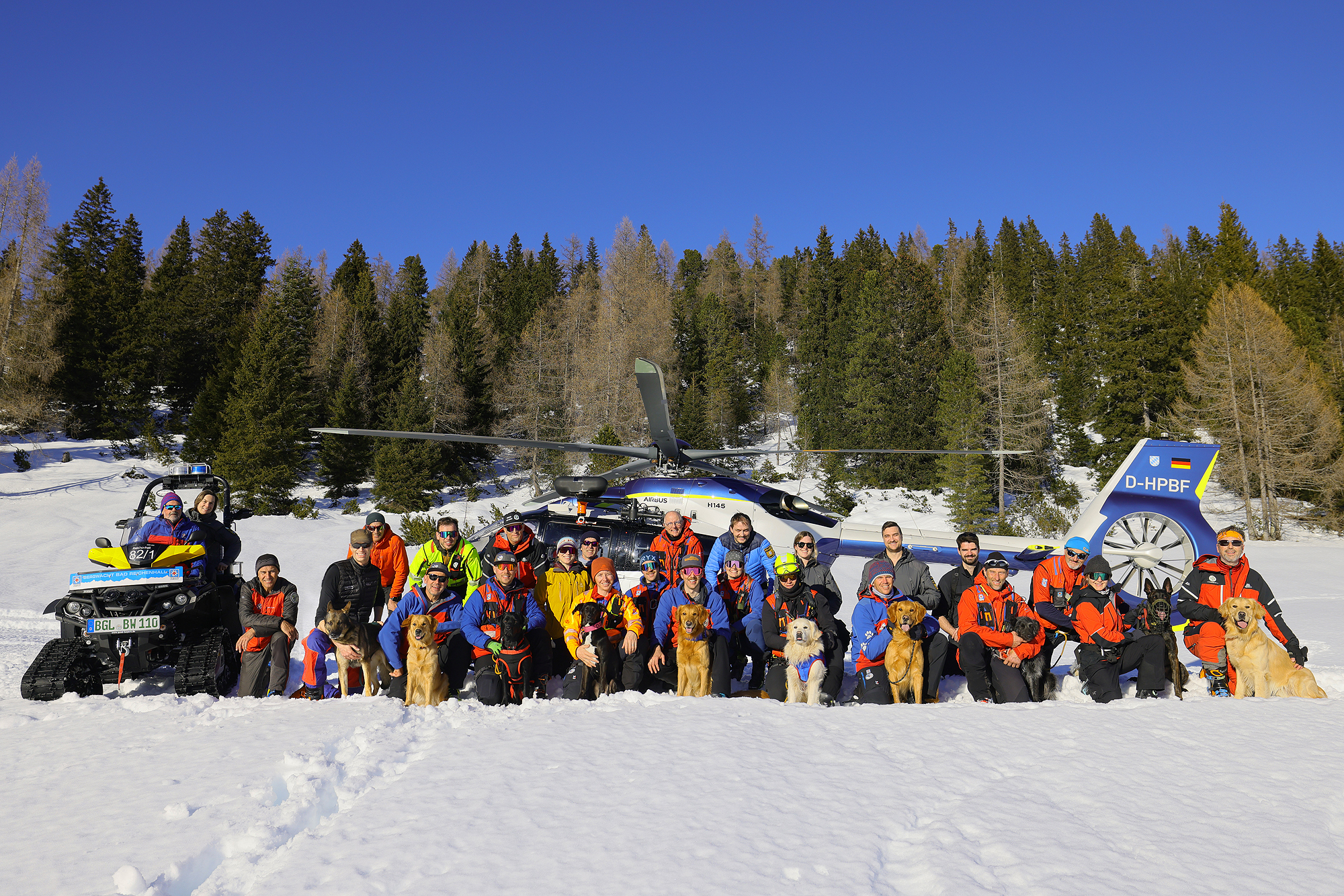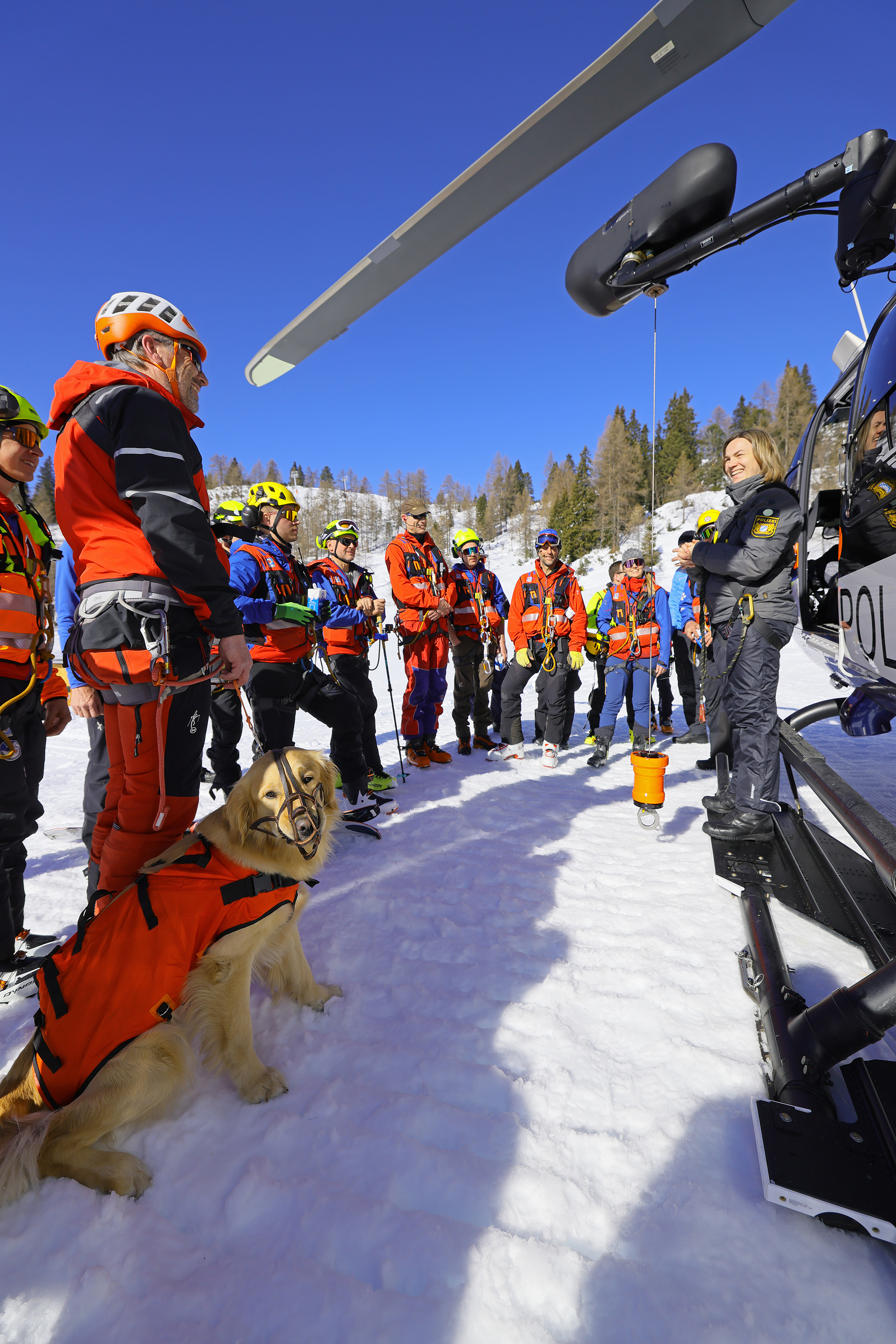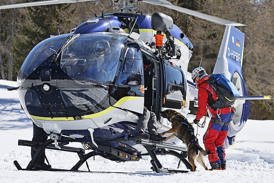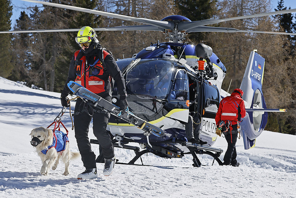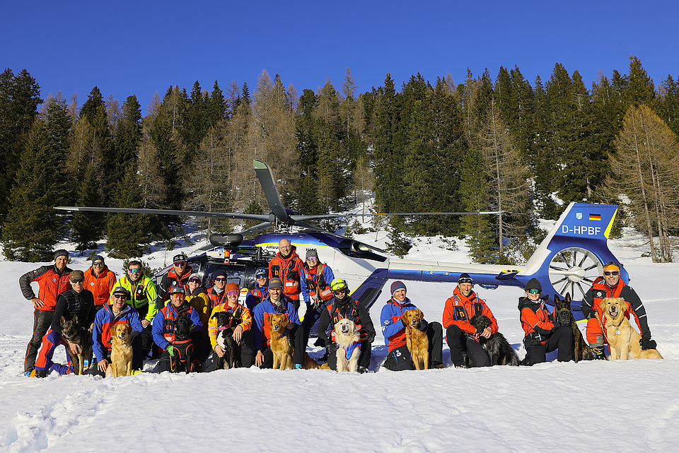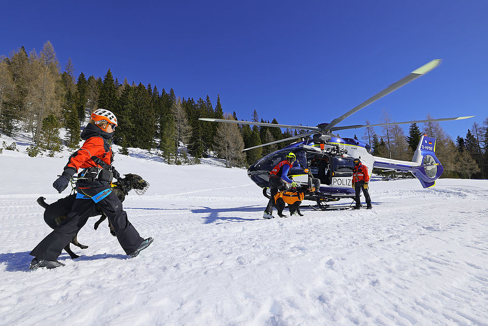 SCHNEIZLREUTH/JETTENBERGER FORST (ml) – Die Such- und Lawinenhundestaffel der Bergwacht-Region-Chiemgau hat im Februar und März eine Woche lang unter realistischen Bedingungen ihren mittlerweile 30. Winterkurs auf dem Hochplateau der Reiter Alpe absolviert; am intensiven Einsatztraining mit zeitweise bis zu 20 Vierbeinern nahmen auch Hundeteams der Bergwacht-Regionen Allgäu und Hochland West und der Österreichischen Bergrettung (ÖBRD) teil. Gleich am ersten Tag war die Polizeihubschrauberstaffel Bayern mit einer ihrer neuen H145 zu Gast, um Rettungswinden-Einsätze und das Ein- und Aussteigen der Vierbeiner bei laufendem Rotor zu üben, da der Heli im Ernstfall fast immer die schnellste Möglichkeit ist, um ein Suchhundeteam innerhalb weniger Minuten auf der Lawine abzusetzen und damit Leben zu retten.