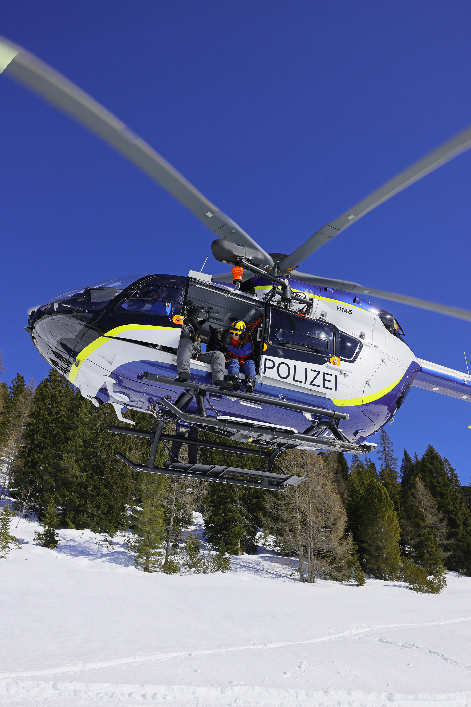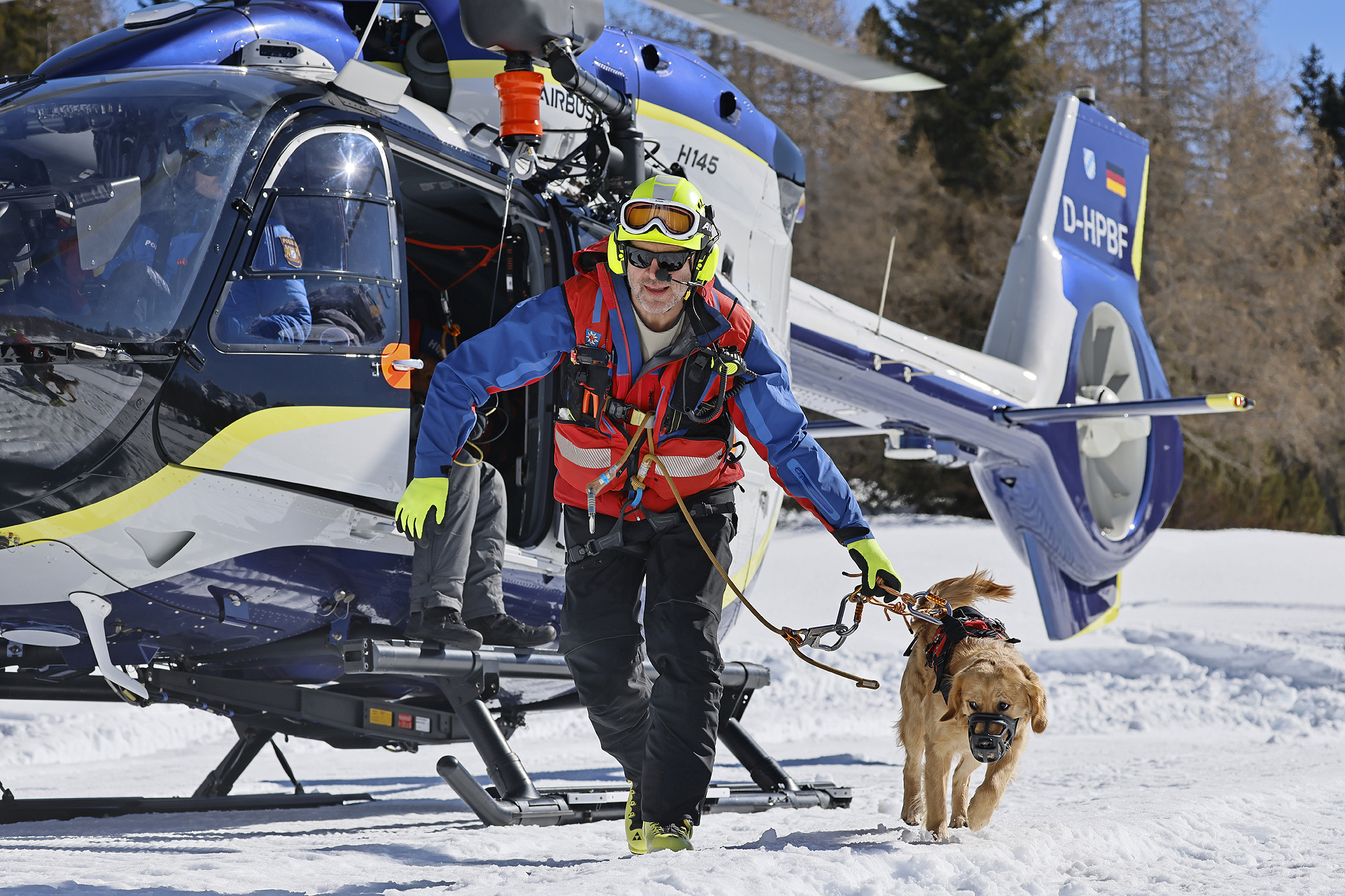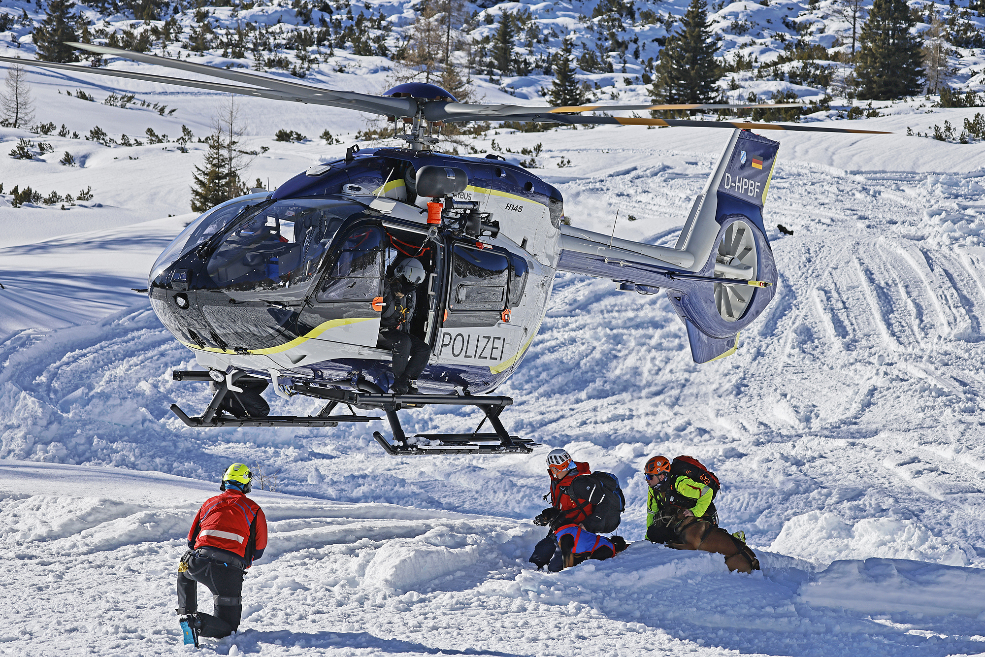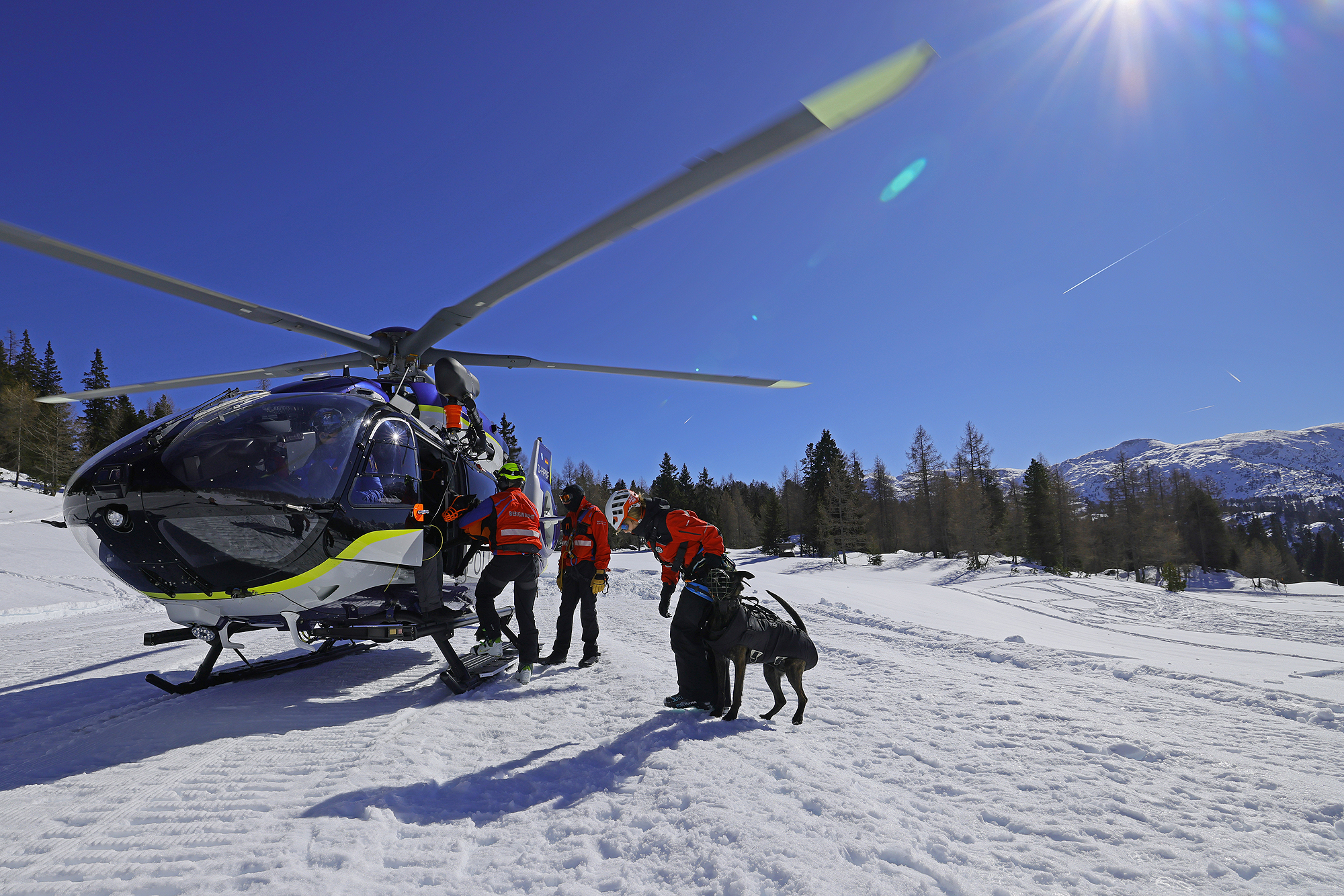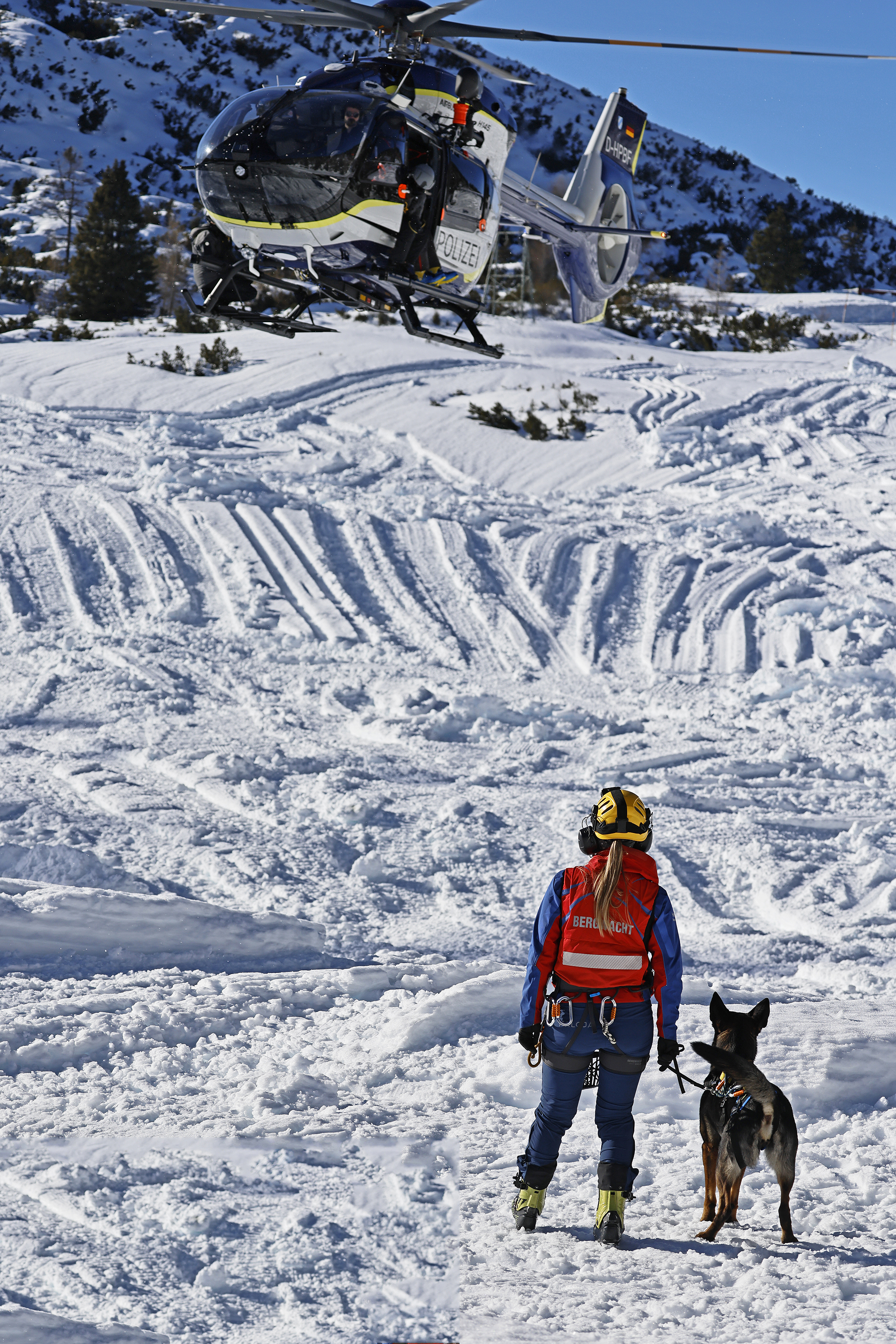 SCHNEIZLREUTH/JETTENBERGER FORST (ml) – Die Such- und Lawinenhundestaffel der Bergwacht-Region-Chiemgau hat im Februar und März eine Woche lang unter realistischen Bedingungen ihren mittlerweile 30. Winterkurs auf dem Hochplateau der Reiter Alpe absolviert; am intensiven Einsatztraining mit zeitweise bis zu 20 Vierbeinern nahmen auch Hundeteams der Bergwacht-Regionen Allgäu und Hochland West und der Österreichischen Bergrettung (ÖBRD) teil. Gleich am ersten Tag war die Polizeihubschrauberstaffel Bayern mit einer ihrer neuen H145 zu Gast, um Rettungswinden-Einsätze und das Ein- und Aussteigen der Vierbeiner bei laufendem Rotor zu üben, da der Heli im Ernstfall fast immer die schnellste Möglichkeit ist, um ein Suchhundeteam innerhalb weniger Minuten auf der Lawine abzusetzen und damit Leben zu retten.