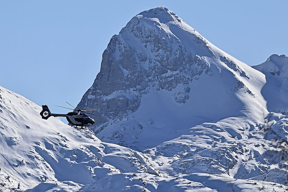 Während der Gewöhnungsflüge für die A-Hunde bereiten sich die voll ausgebildeten C-Hunde-Teams auf ihren Einsatz am Lawinenfeld nördlich oberhalb der Wartsteinhütte vor. Der Heli nimmt sie bei laufendem Rotor auf und setzt sie dann mit der Winde weiter oben wieder ab. Junghunde wie Michi Zelzers Bali sollen sich erst einmal langsam an die besonderen Bedingungen gewöhnen, wenn sie den Boden unter den Füßen verlieren und Lautstärke und Abwind der Rotorblätter aushalten müssen. Erfahrenere Einsatzhunde wie Dani Neubauers Shana trainieren bereits hochgetaktet ohne Unterbrechung ein komplettes Einsatzszenario: Bei laufendem Heli mit dem Frauchen und umfangreicher Ausrüstung einsteigen, zum Lawinenfeld fliegen, Absetzen mit der Winde und zwei im Schnee eingegrabene Patientendarsteller suchen, die die Schäferhündin innerhalb weniger Minuten zielsicher anzeigt; dann geht’s mit der Winde zurück in den Heli und zum Landeplatz. Nach dem Mittagessen am Lenzenkaser stand am Nachmittag das gleiche Programm noch einmal auf dem Plan, sodass alle Teams intensiv trainieren konnten. „Wir profitieren sehr vom Erfahrungsaustausch mit den Nachbar-Regionen und den Österreichern“, freut sich Partholl. Neben der praktischen Ausbildung gab es Fach-Vorträge durch Experten aus der Notfallmedizin, Tierheilkunde und Bergrettung und. Die Bergwacht wird bei ihrem Lehrgang durch die Bundeswehr und die Wehrtechnische Dienststelle Oberjettenberg (WTD52) unterstützt und kann Seilbahn, Fahrzeuge, Kantine und zur Übernachtung den Lenzenkaser 3 und die Wartsteinhütte für die Hunde nutzen.