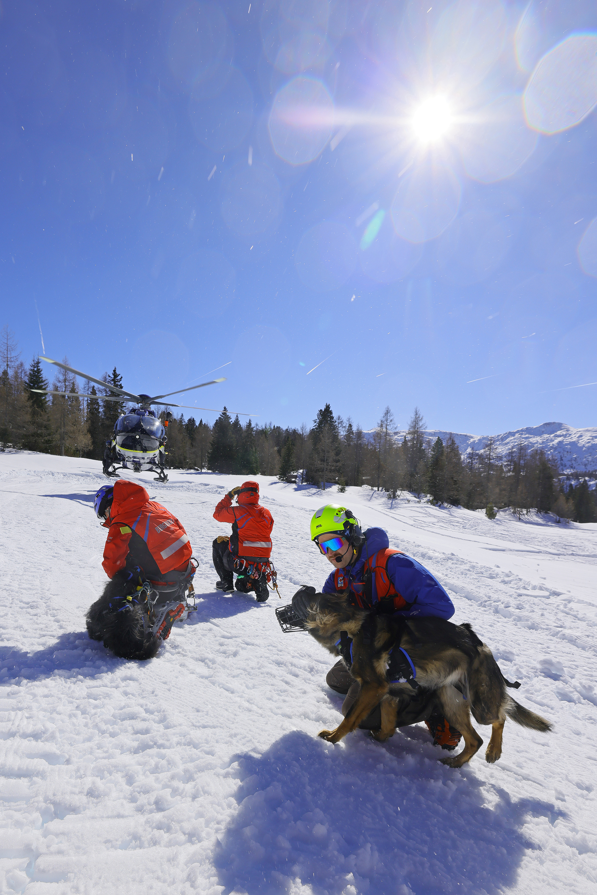Das vom Heli auf dem Lawinenkegel abgesetzte Suchhunde-Team ist in der ersten durchaus auch für die Retter riskanten Einsatzphase zunächst auf sich allein gestellt, und der Hundeführer entscheidet über die weitere Taktik: Während beim Hund das übers Spielverhalten antrainierte Such-Programm weitgehend automatisch an- und abläuft, ist der Bergwacht-Hundeführer Abschnittsleiter, Sondierer, Schaufler und Sanitäter in einer Person und muss neben der Lage-Erkundung zusätzlich noch seinen Hund mit Kommandos im Gelände über das potenzielle Suchgebiet führen. „Wegen der in kurzer Zeit nur sehr schwer zu erfassenden und einschätzbaren Risiken Grund genug, dass alle planbaren Abläufe und jeder Handgriff in Fleisch und Blut übergehen und bei einem scharfen Einsatz sitzen müssen“, erklärt Staffelleiter Achim Tegethoff.