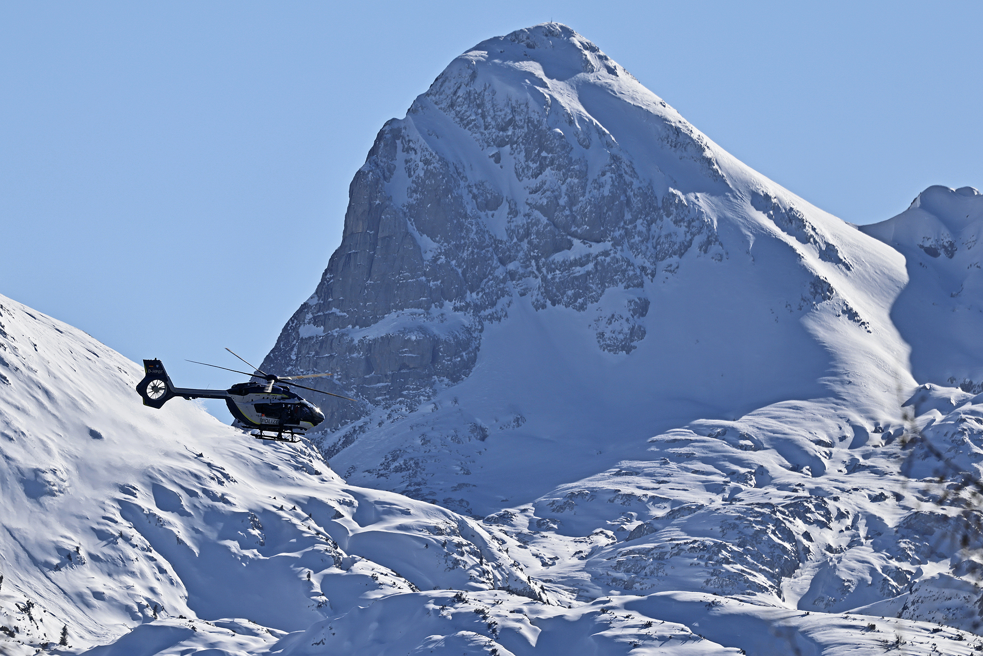 Durch den zusätzlichen Februar-Schnee, den bereits zuvor instabilen Schneedecken-Aufbau und die milde Witterung war die Lawinenlage in den Berchtesgadener Alpen während des Kurses angespannt; am Samstagmittag mussten Ausbilder Much Partholl und sein Xaverl und Hundeführer Thomas Pöpperl und sein Lasko per Heli zum Windschartenkopf ausrücken, wo drei Schneeschuhgeher von einer Lawine mitgerissen und teilverschüttet wurden (wir berichteten). Bei einem Lawinenabgang mit Verschütteten zählt im Ernstfall jede Minute, und die feine Hunde-Spürnase ist trotz aller modernen Technik nach der Kameraden-Rettung nach wie vor die effektivste und schnellste Möglichkeit, unter den Schneemassen begrabene Menschen rasch und vielleicht noch lebend aufzuspüren. Die Heli-Crew holt dann ein Suchhundeteam beim Anflug ins Einsatz-Gebiet meist zu Hause oder am Arbeitsplatz des ehrenamtlichen Hundeführers ab und setzt es dann im Schwebeflug oder per Winde am Lawinenkegel ab. Wenn das Wetter nicht mitspielt und Wolken und Wind einen Flug unmöglich machen, werden die Suchhundes-Teams so weit wie möglich per Seilbahn, mit Autos oder besonders geländegängigen Überschnee-Fahrzeugen auf den Berg gebracht, wobei die Retter dann weiter zu Fuß mit Skiern aufsteigen und im Anschluss auch durchs Gelände abfahren müssen.