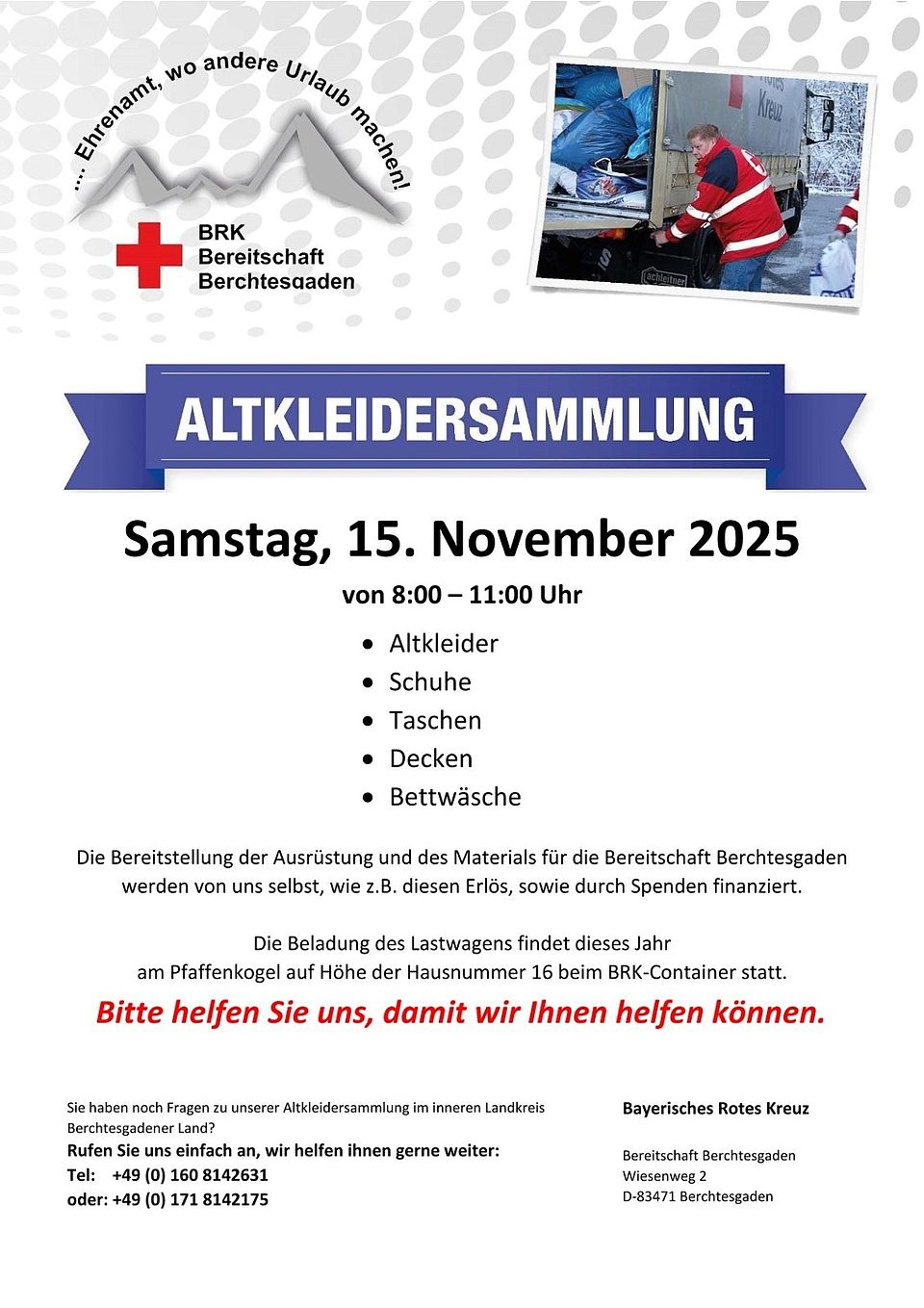 BERCHTESGADEN (ae) - Die ehrenamtliche BRK-Bereitschaft Berchtesgaden sammelt am Samstag, den 15. November wieder im inneren Landkreis Altkleider, Schuhe, Taschen, Decken und Bettwäsche und bittet die Bevölkerung von Berchtesgaden, Bischofswiesen, Marktschellenberg, Ramsau und Schönau gebrauchtes Sammelgut bis dahin daheim aufzubewahren. „Damit ist gewährleistet, dass der Erlös aus der Sammlung im inneren Landkreis bleibt und dort wieder direkt dem erweiterten Rettungsdienst und Katastrophenschutz und damit den Menschen in der Region zugutekommt“, erklärt Organisator Florian Holzinger, der zugleich bittet, die Textilien nicht an auswärtige, kommerzielle Sammler abzugeben.
