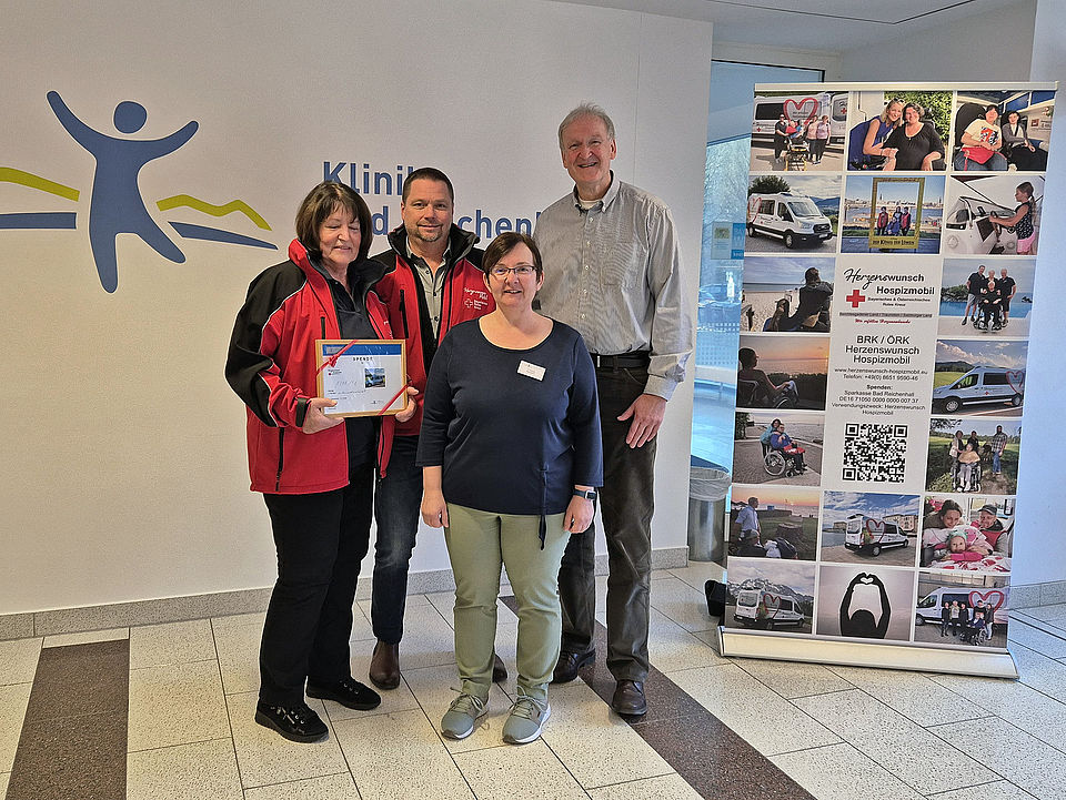 Mit selbstgebackenen Kuchen und Würstchen bei einer Adventsveranstaltung hat der Gesamtpersonalrat der Klinik Bad Reichenhall Spenden gesammelt, die die Belegschaft mit einem bei der Weihnachtsfeier herumgereichten Sparschwein auf stolze 1.200 Euro aufstockten. Der kaufmännische Direktor Siegbert Heyen und Claudia Parthe vom Personalrat übergaben die Finanzspritze an Florian Halter und Inge Brüderl (von rechts) vom Herzenswunschmobil Hospizmobil.