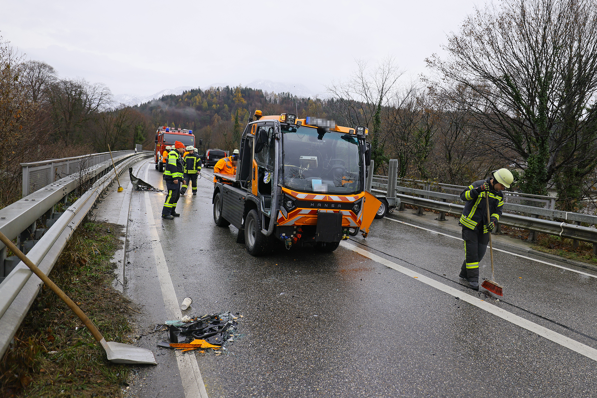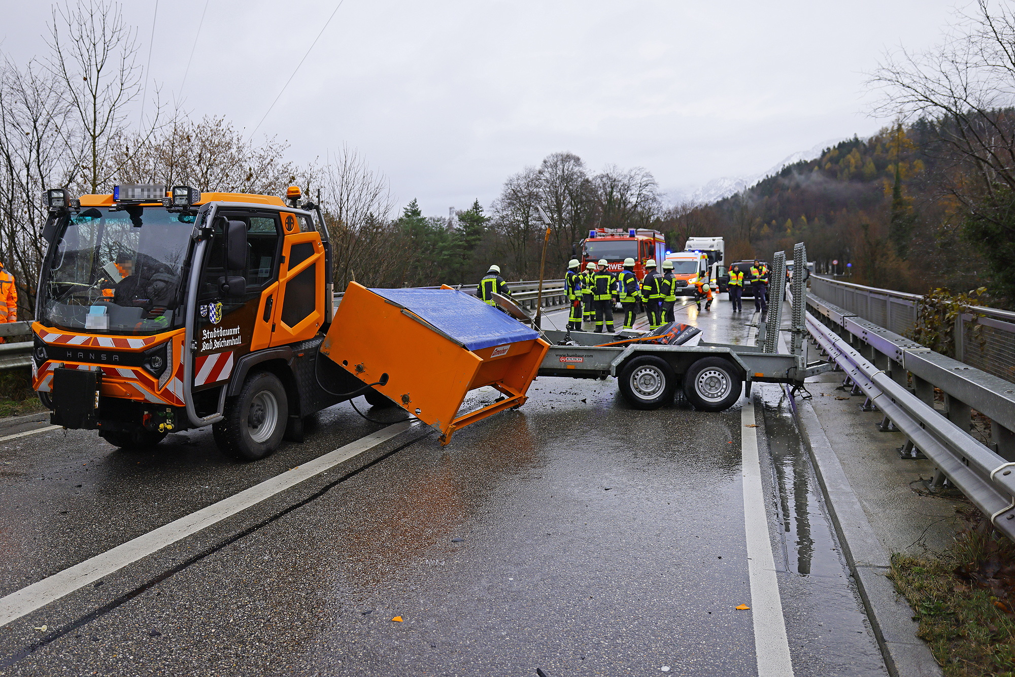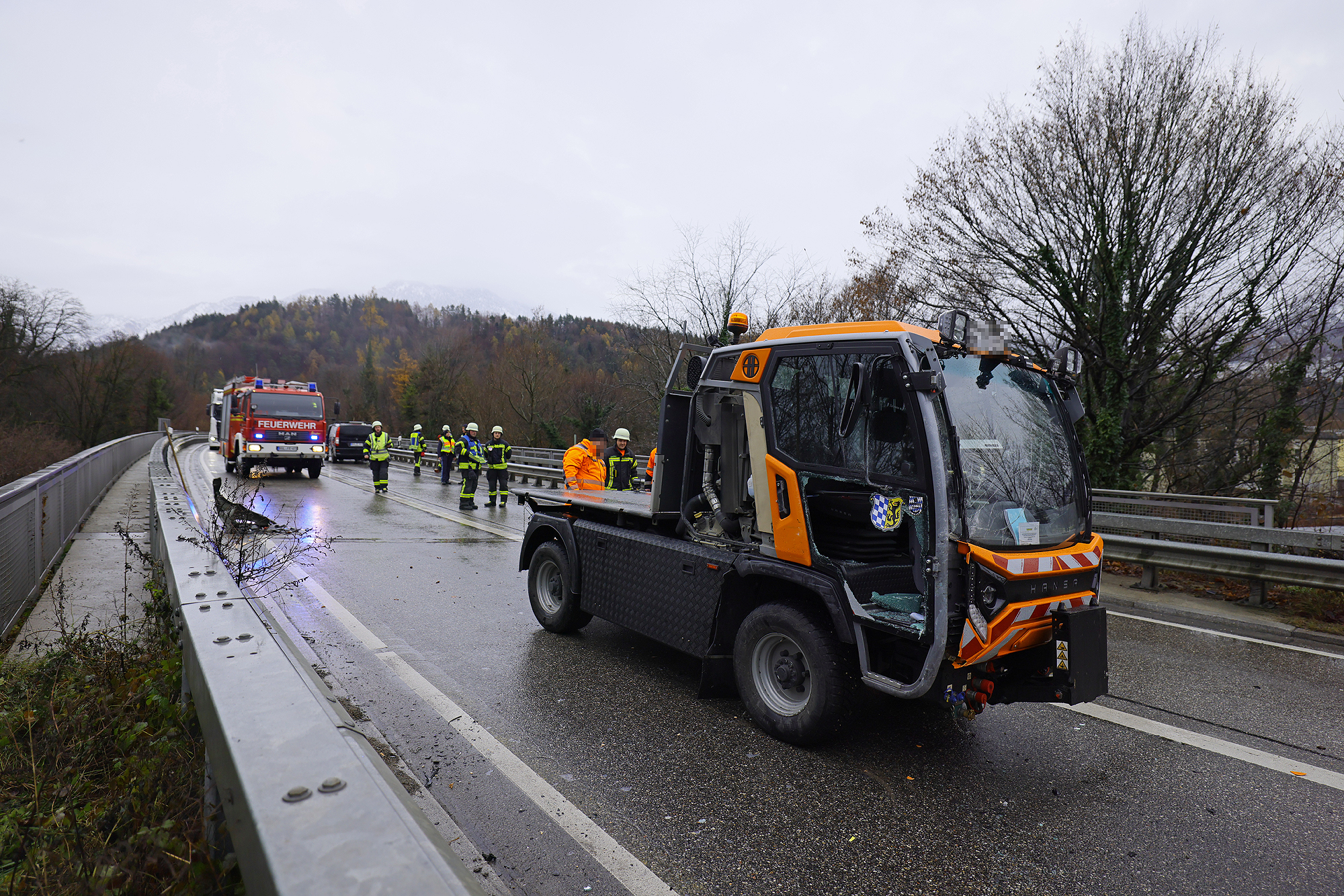 BAD REICHENHALL/SANKT ZENO – Am frühen Dienstagnachmittag sind auf der Reichenhaller Ortsumgehungsstraße (B21) auf der Brücke über die Frühlingstraße ein Multifunktions- und Geräteträgerfahrzeug des Städtischen Bauhofs samt Anhänger und ein Kleintransporter eines örtlichen Handwerker-Betriebs zusammengestoßen, wobei nach erster Einschätzung beide Fahrer leicht bis mittelschwer verletzt wurden. Der Vito-Fahrer war offenbar in Fahrtrichtung Piding auf die Gegenfahrbahn geraten, woraufhin der Fahrer des entgegenkommenden Bauhof-Fahrzeugs in den Gegenverkehr ausweichen wollte und beide Fahrzeuge seitlich kollidierten.