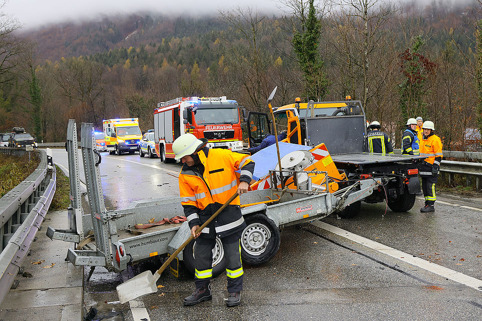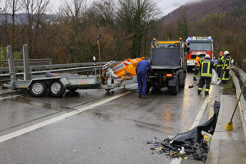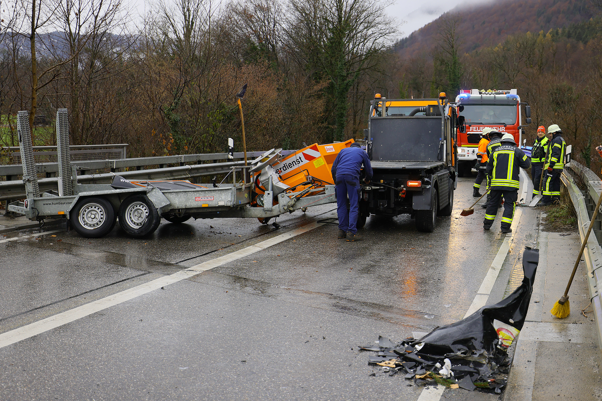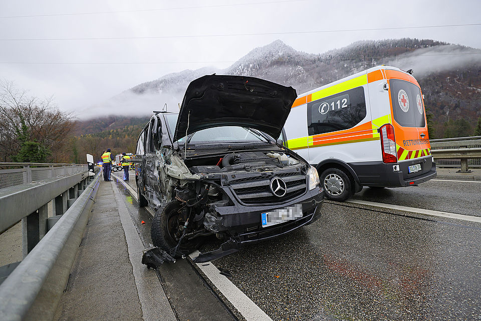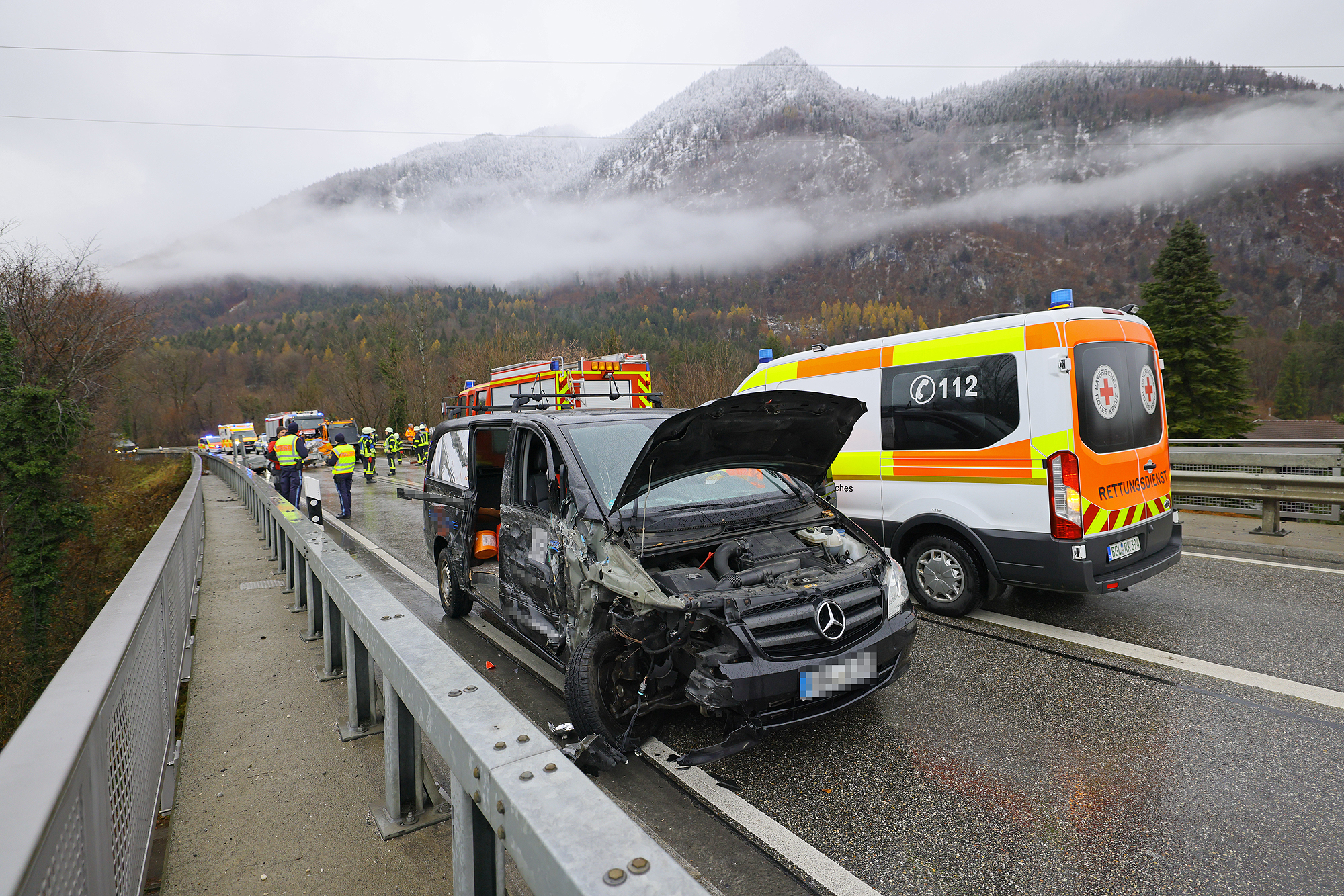 BAD REICHENHALL/SANKT ZENO – Am frühen Dienstagnachmittag sind auf der Reichenhaller Ortsumgehungsstraße (B21) auf der Brücke über die Frühlingstraße ein Multifunktions- und Geräteträgerfahrzeug des Städtischen Bauhofs samt Anhänger und ein Kleintransporter eines örtlichen Handwerker-Betriebs zusammengestoßen, wobei nach erster Einschätzung beide Fahrer leicht bis mittelschwer verletzt wurden. Der Vito-Fahrer war offenbar in Fahrtrichtung Piding auf die Gegenfahrbahn geraten, woraufhin der Fahrer des entgegenkommenden Bauhof-Fahrzeugs in den Gegenverkehr ausweichen wollte und beide Fahrzeuge seitlich kollidierten.