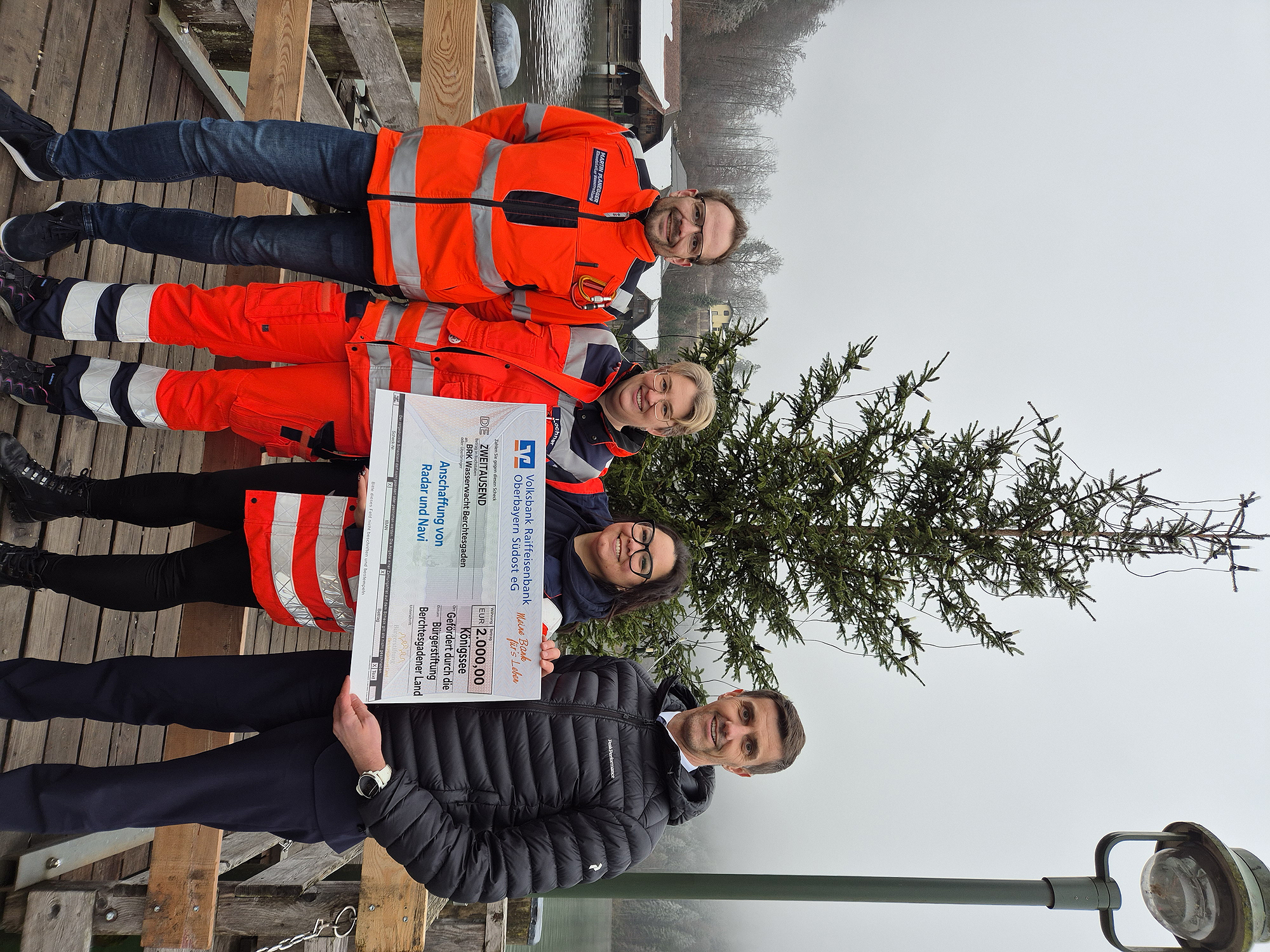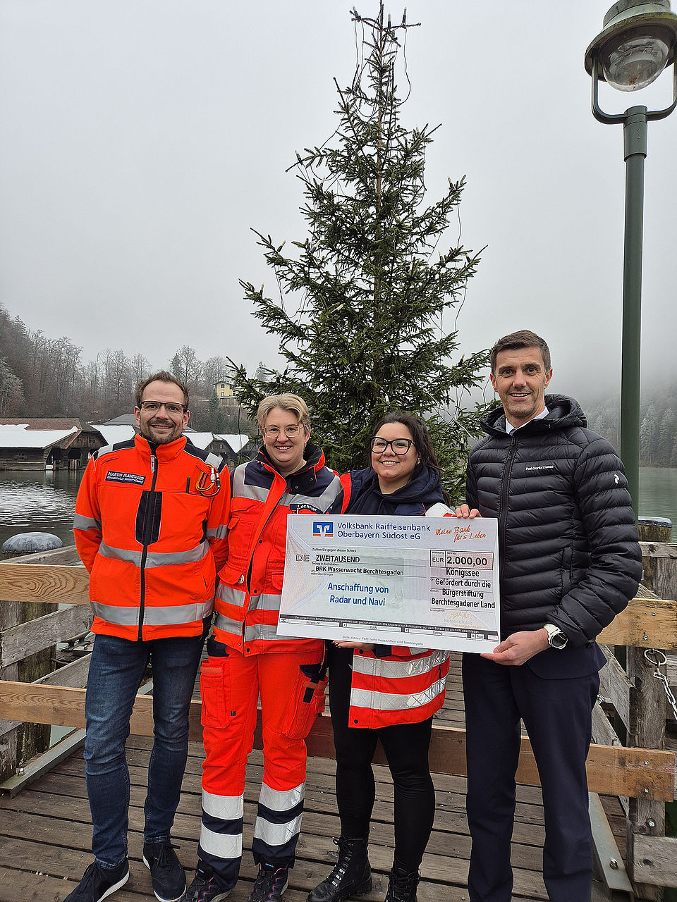 Zur Spendenübergabe am Königssee trafen sich Wasserwacht-Ortgruppenvorsitzende Claudia Lochner, ihr Technischer Leiter Martin Planegger und seine Stellvertreterin Carina Fischer-Stöckl. Von der Bürgerstiftung Berchtesgadener Land war Stiftungsvorstand Simon Zuhra vor Ort, der sich interessiert über die Arbeit der Wasserwacht informierte und von der hohen Einsatzbereitschaft beeindruckt war: Kurz vor der geplanten Spendenübergabe waren die Freiwilligen noch zusammen mit der Feuerwehr zu einem Brandmeldealarm nach Sankt Bartholomä ausgerückt und direkt von dort über den See wieder zurückgekommen; der Tourismus-Hotspot, das Südufer in Salet und die Anlegestelle in Kessel sind im Notfall nur mit dem Boot oder per Heli erreichbar.