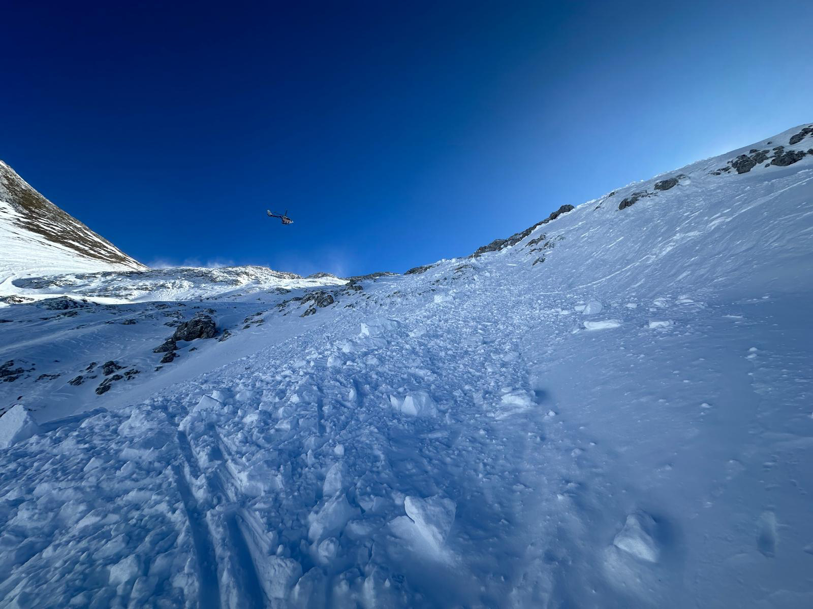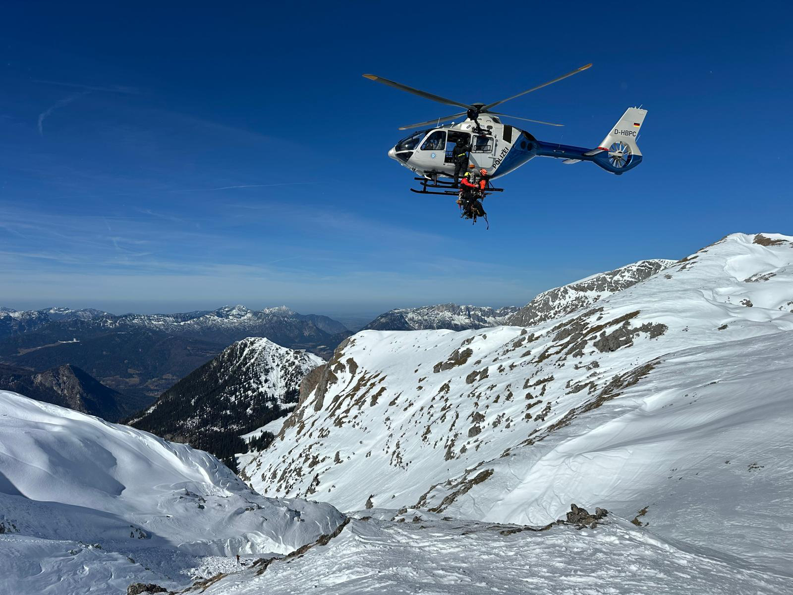 Der Lawinenabgang war komplex, da es zwei Staubereiche gab. „Edelweiß 13“ holte deshalb zur Unterstützung ein zweites Suchhundeteam der Bergwacht Ramsau vom Hochplateau der Reiter Alpe ab, wo gerade der diesjährige Lawinenhundekurs stattfand. Die Einsatzkräfte suchten gemeinsam das gesamte Lawinenfeld vorsorglich mit Suchhunden, Lawinen-Verschütteten-Suchgeräten (LVS) und Recco-Sonde ab, um weitere mögliche Verschüttete definitiv auszuschließen zu können. Beteiligt waren fünf Bergretter der Bergwacht Berchtesgaden, zwei Lawinenhundeführer, der Rettungshubschrauber „Christoph 14“, der Polizeihubschrauber „Edelweiß 13“ sowie zwei Polizeibergführer der Alpinen Einsatzgruppe (AEG).