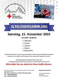 BERCHTESGADEN (ae) - Die ehrenamtliche BRK-Bereitschaft Berchtesgaden sammelt am Samstag, den 15. November wieder im inneren Landkreis Altkleider, Schuhe, Taschen, Decken und Bettwäsche und bittet die…